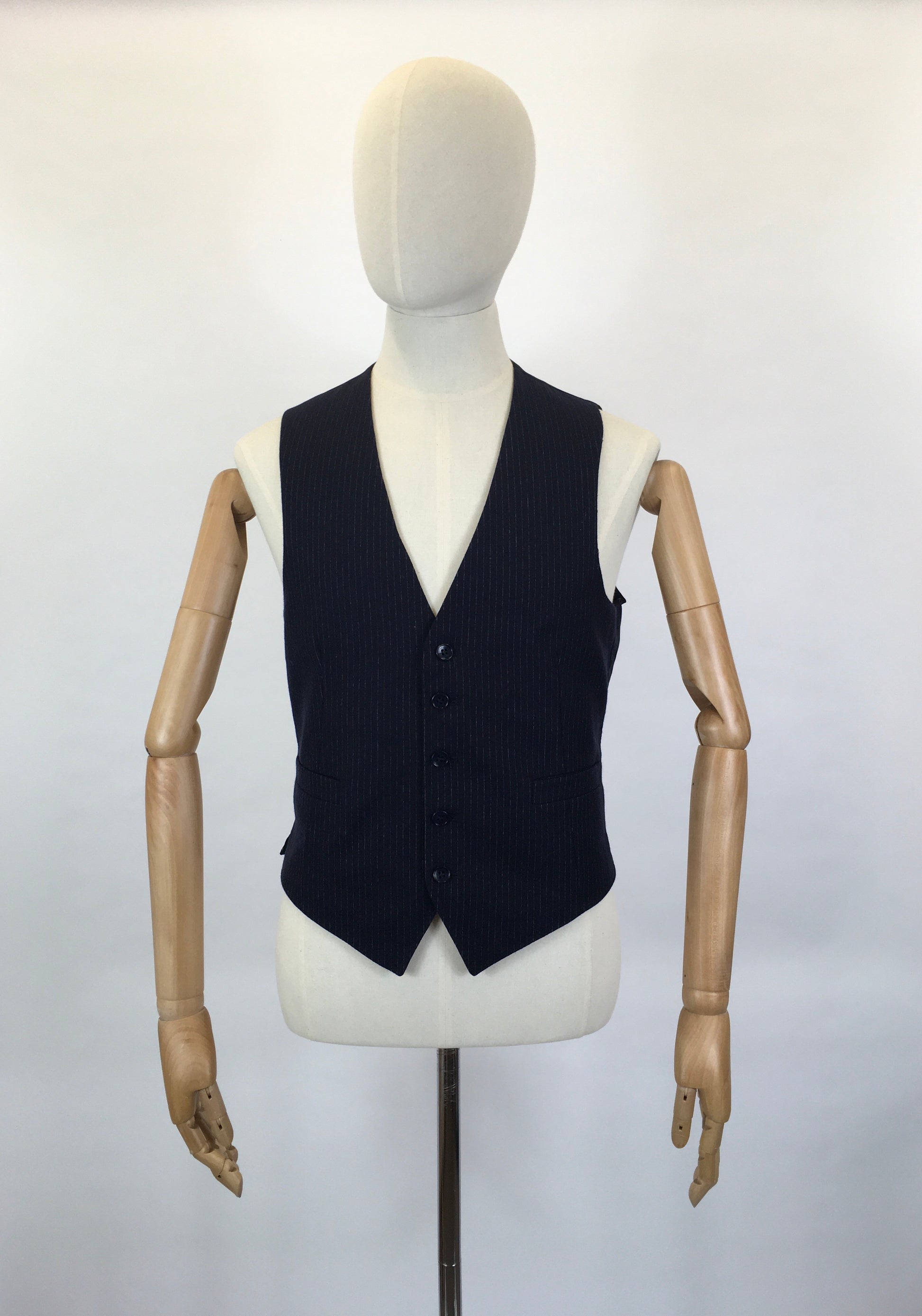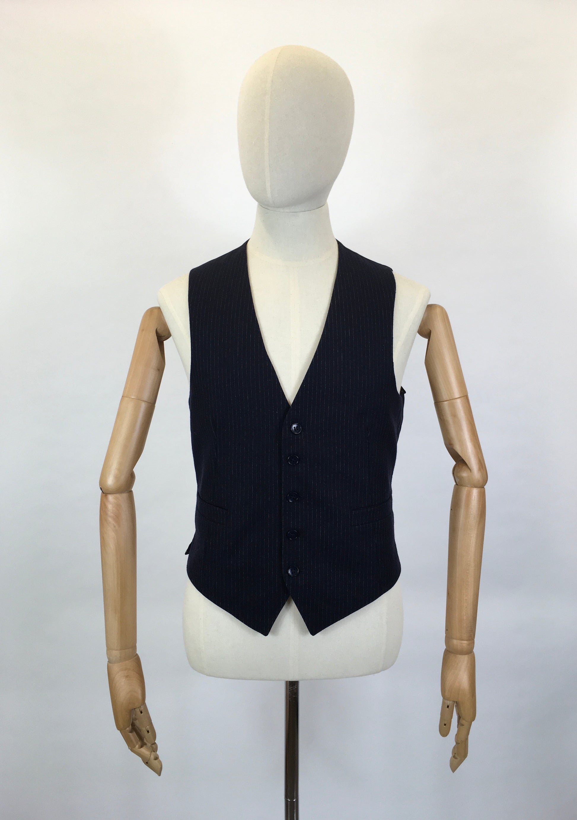 Vintage Navy pinstripe wool waistcoat with 5 button front, 2 x pockets and a back strap. Unlabelled, fabulous worn with a shirt and trousers or looks equally dapper over a pair of jeans.