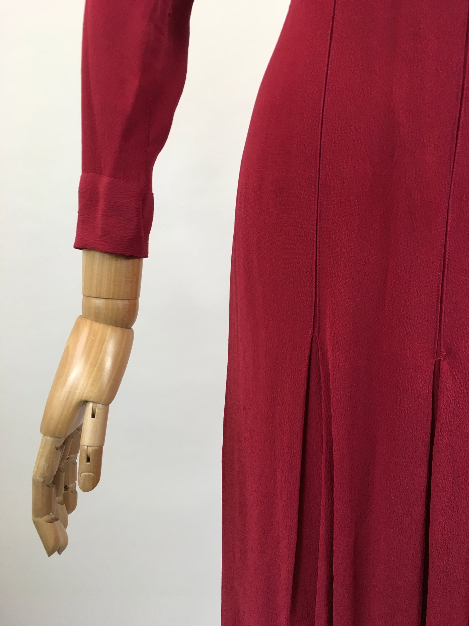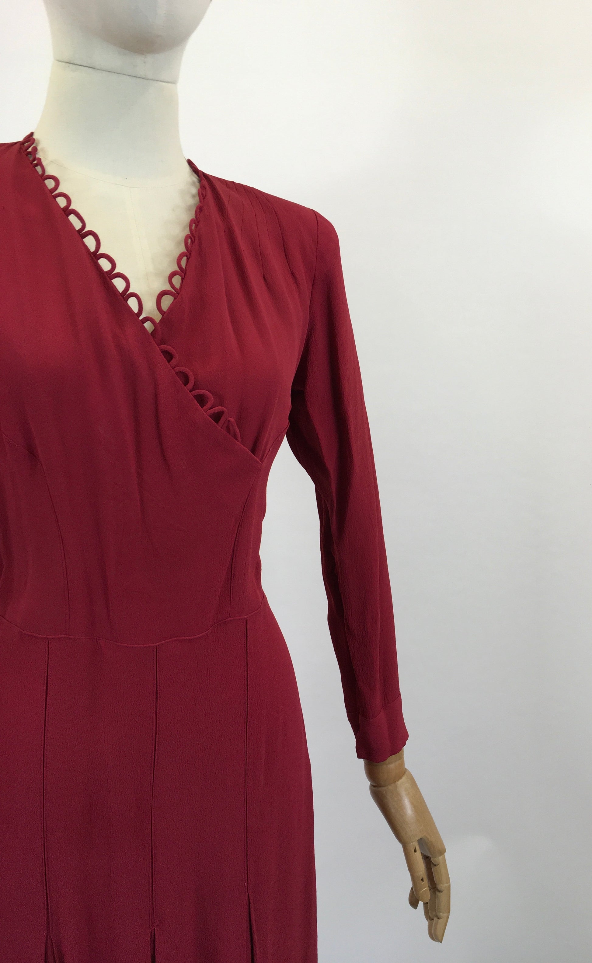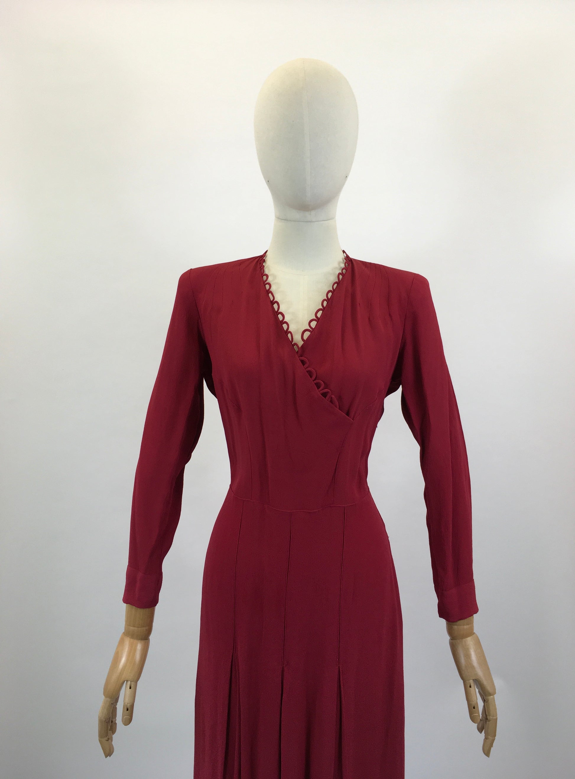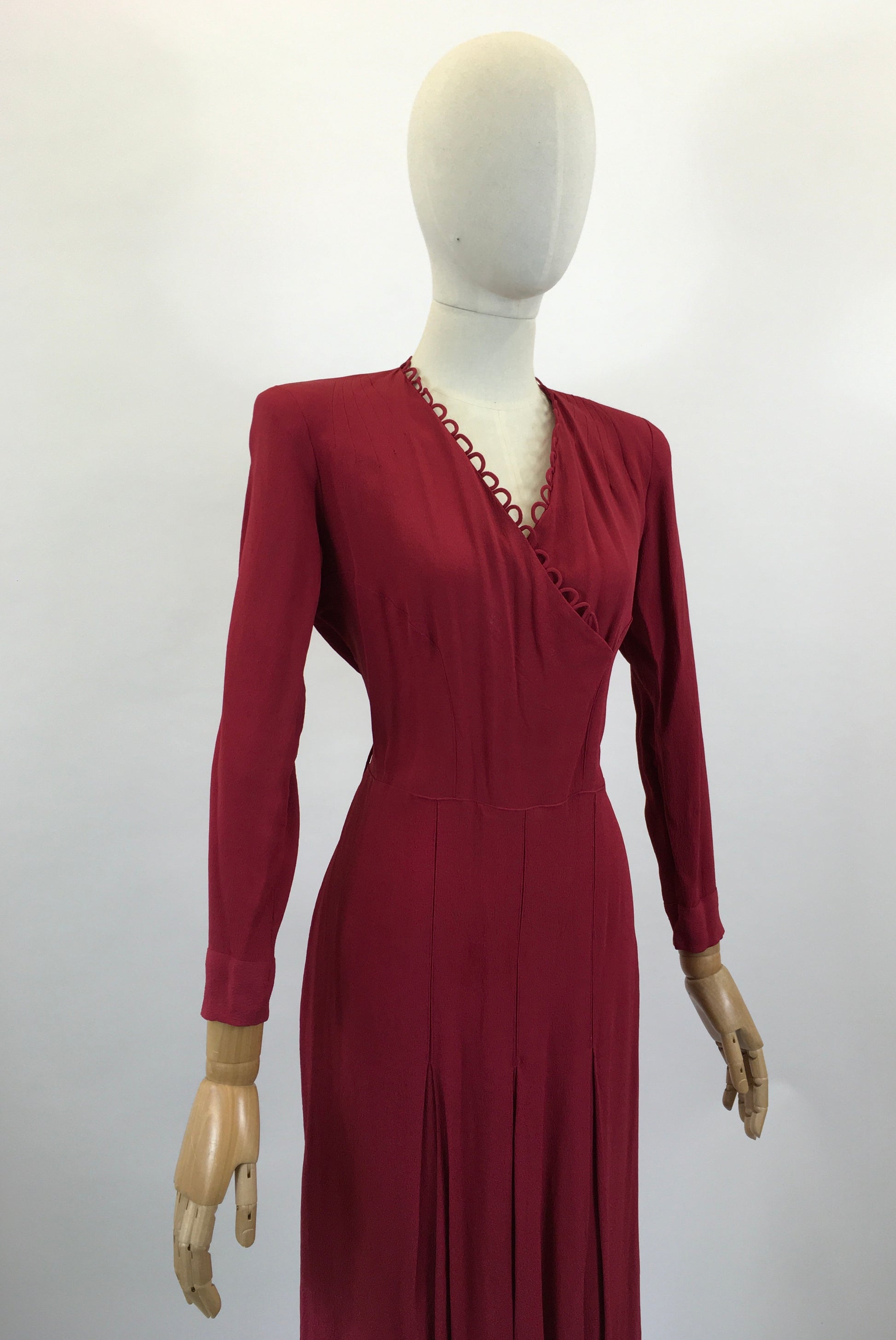Vintage Dinner Plate 1940’s Cocktail dress in Wine Red. Superb dress with crossover bust detail, roulette detailing along each crossover from the neck to bust line.  Slight Shoulder pads. Full length sleeves with a press stud fastening at the wrist. Pleated skirt with 3 x kick pleats to the front and back.