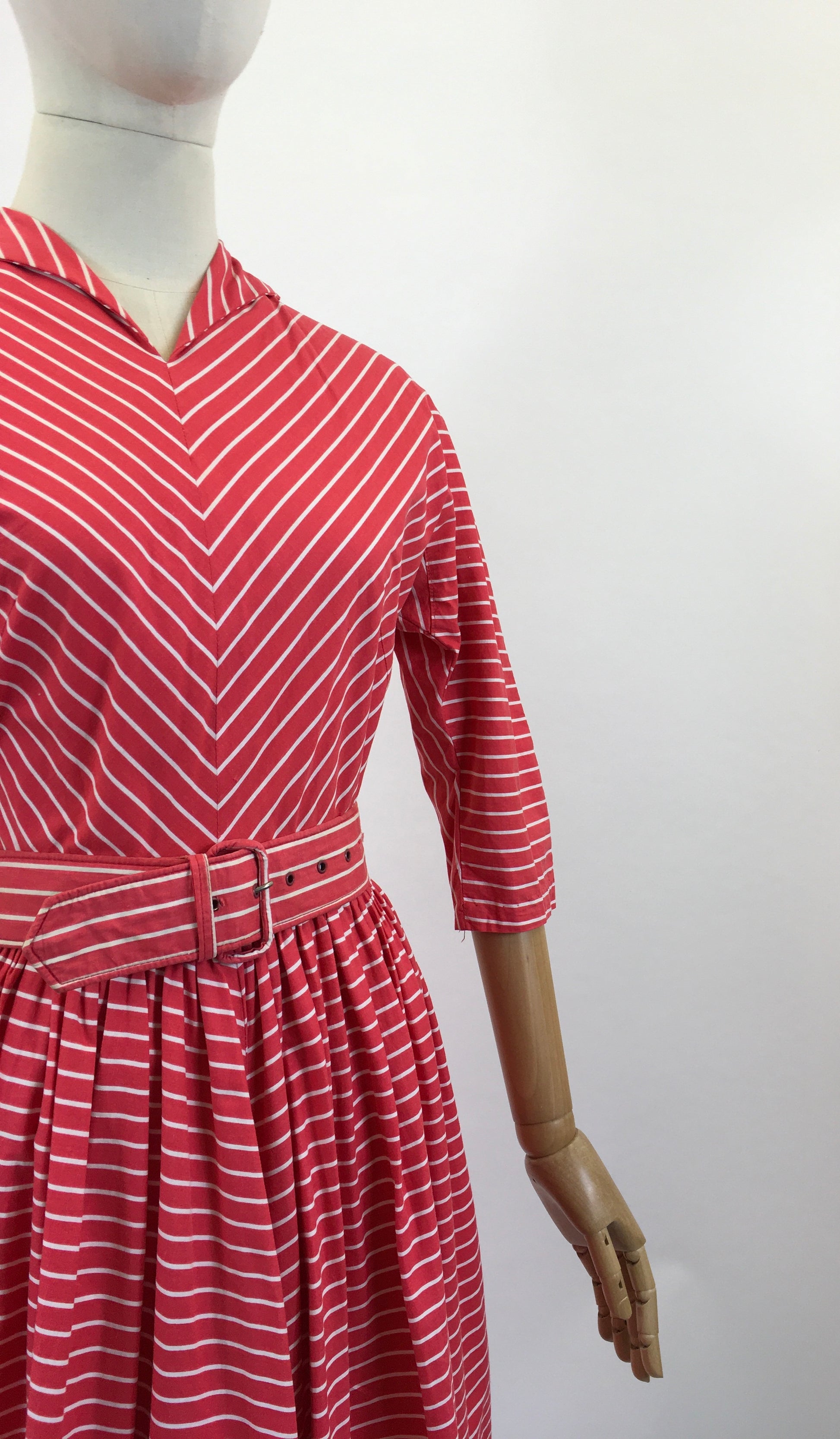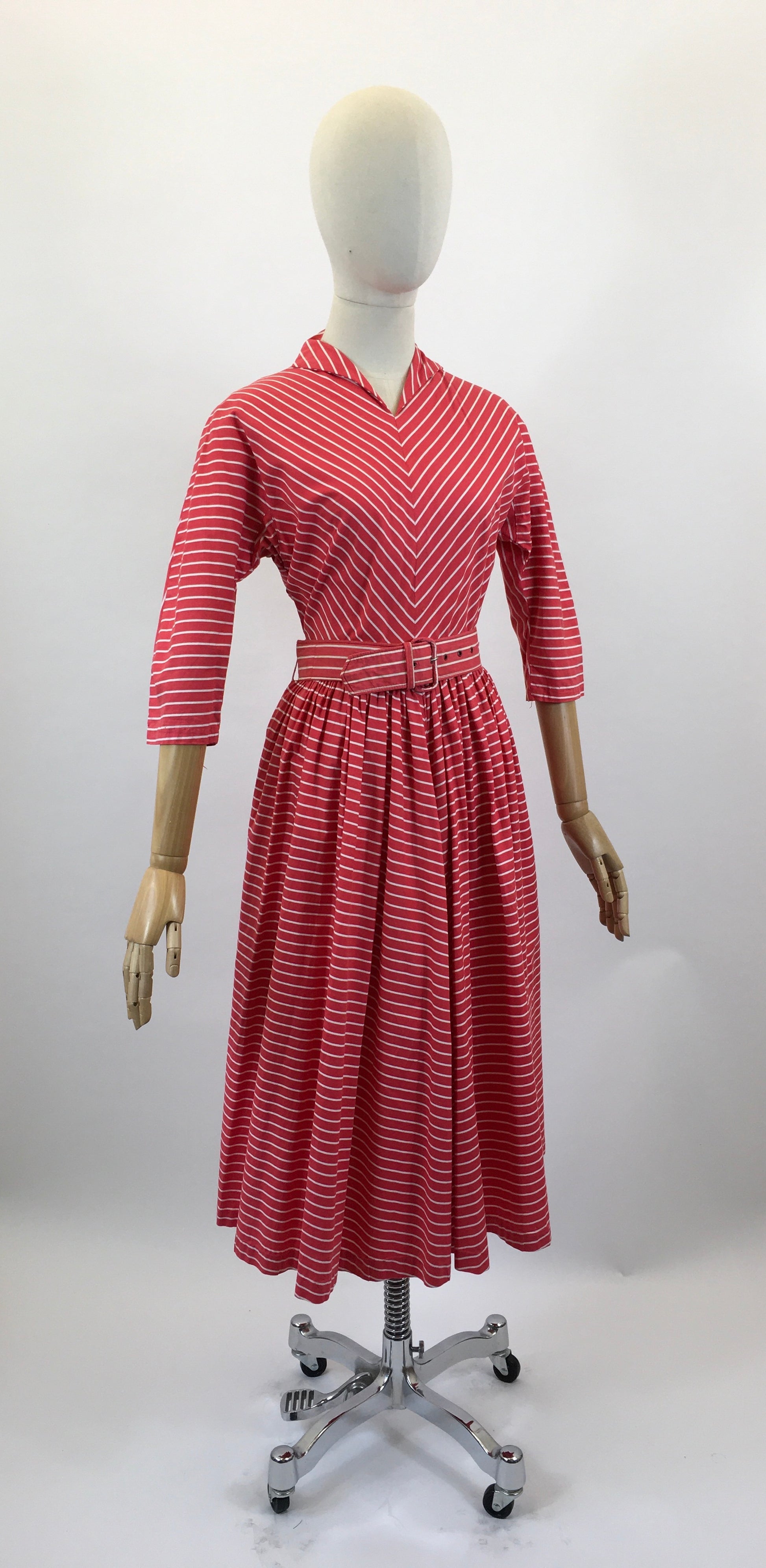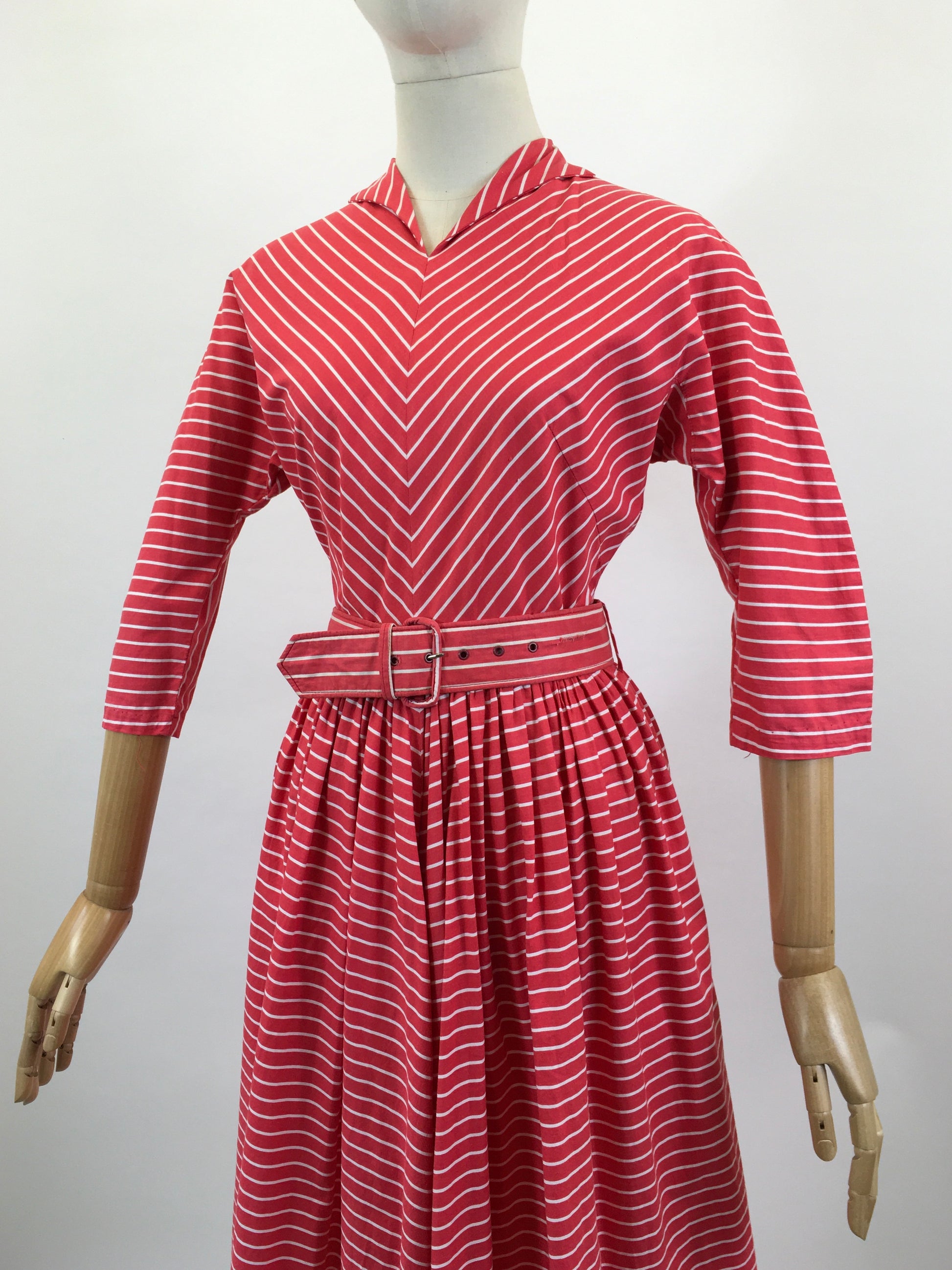 Vintage early 1950’s cotton day dress in Red / White. Such a striking dress with cute collar, chevron stripe, superbly matched throughout, dolman shaped 3/4 sleeves. Bust darts to front bodice. Fully gathered skirt, with lots of fabric. Original 2” wide belt. Fabulous back yoke panel which enhances the chevron pattern even more. Centre back metal zip.