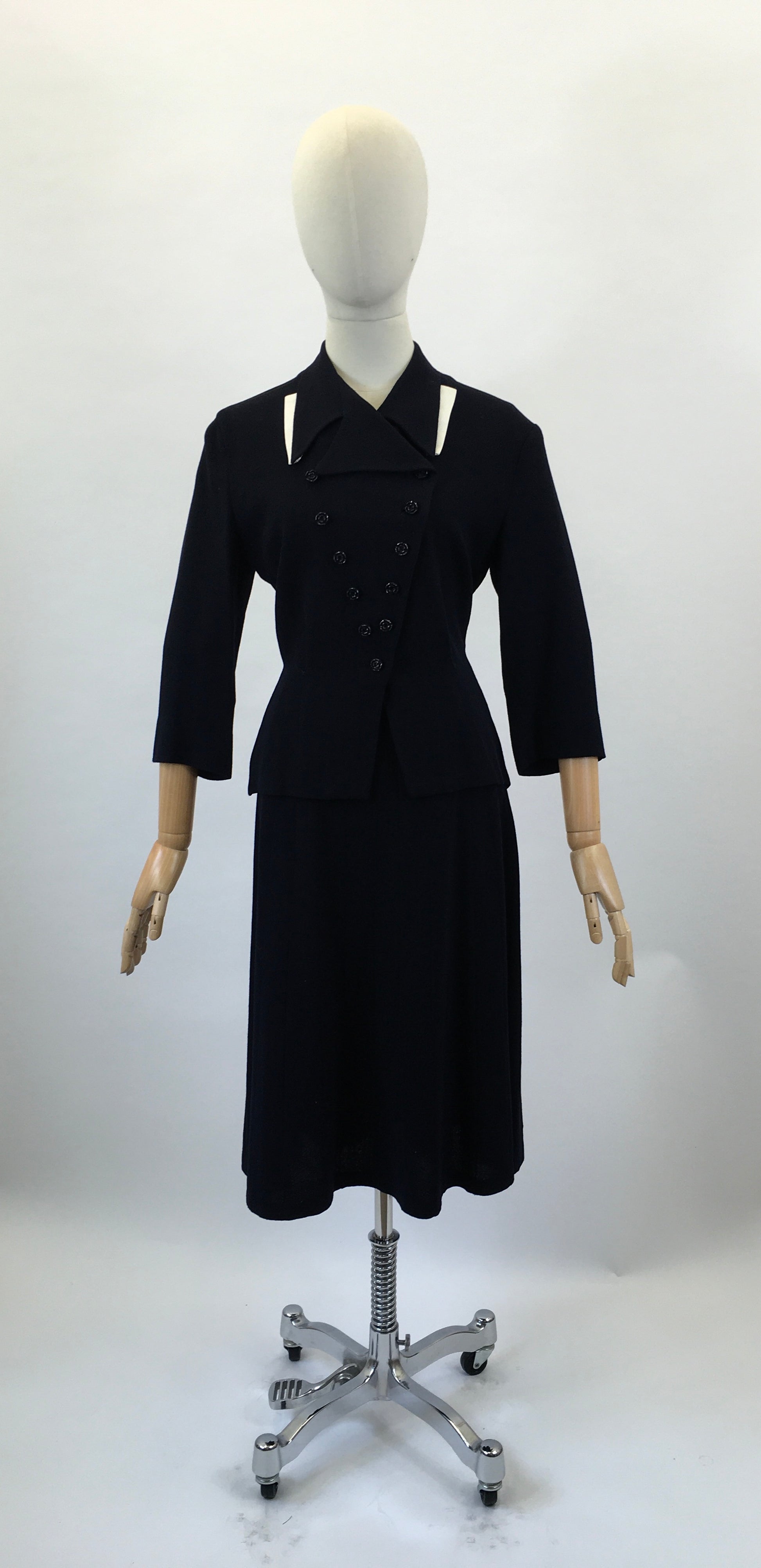 Vintage 1940’s gorgeous 2pc suit in Dark Nay with white contrast. A beautifully tailored crepe suit. “Jay Gee” model label. With a double sharp collar effect by cleverly backing the navy with a hint of white for contrast. Asymmetrical shaping to the jacket with fabulous flower shaped buttons in a striking V pattern down the front of the jacket. 3/4 length sleeves. Nipped in waist. A line skirt with clever multi seam panelling all around the skirt ( difficult to photograph ) but cub a good detailing. Side metal zip.