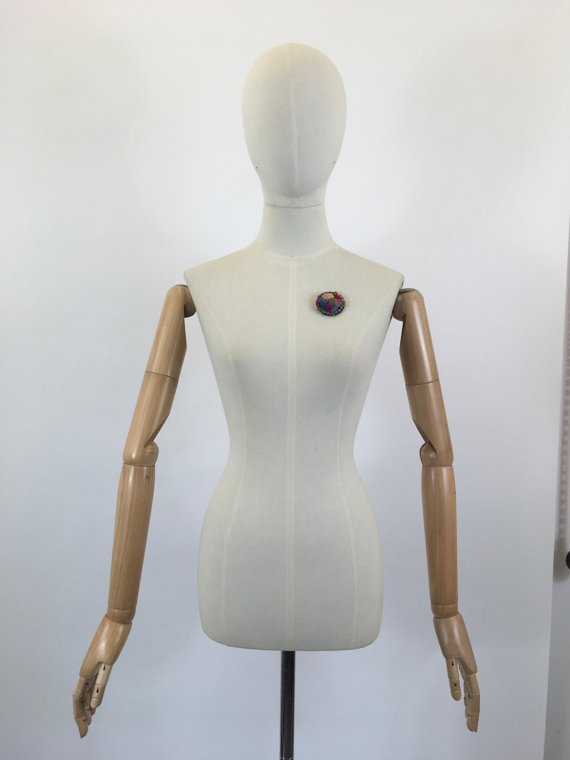 Vintage 1940’s make do and mend felted brooch. A posy of mixed flowers within a circle, all appliquéd onto a black backing circle. Pinks, blues, mauves, yellow and red mix of colours. A safety pin clasp is attached. A simple made brooch but delicate and elegant to the eye.