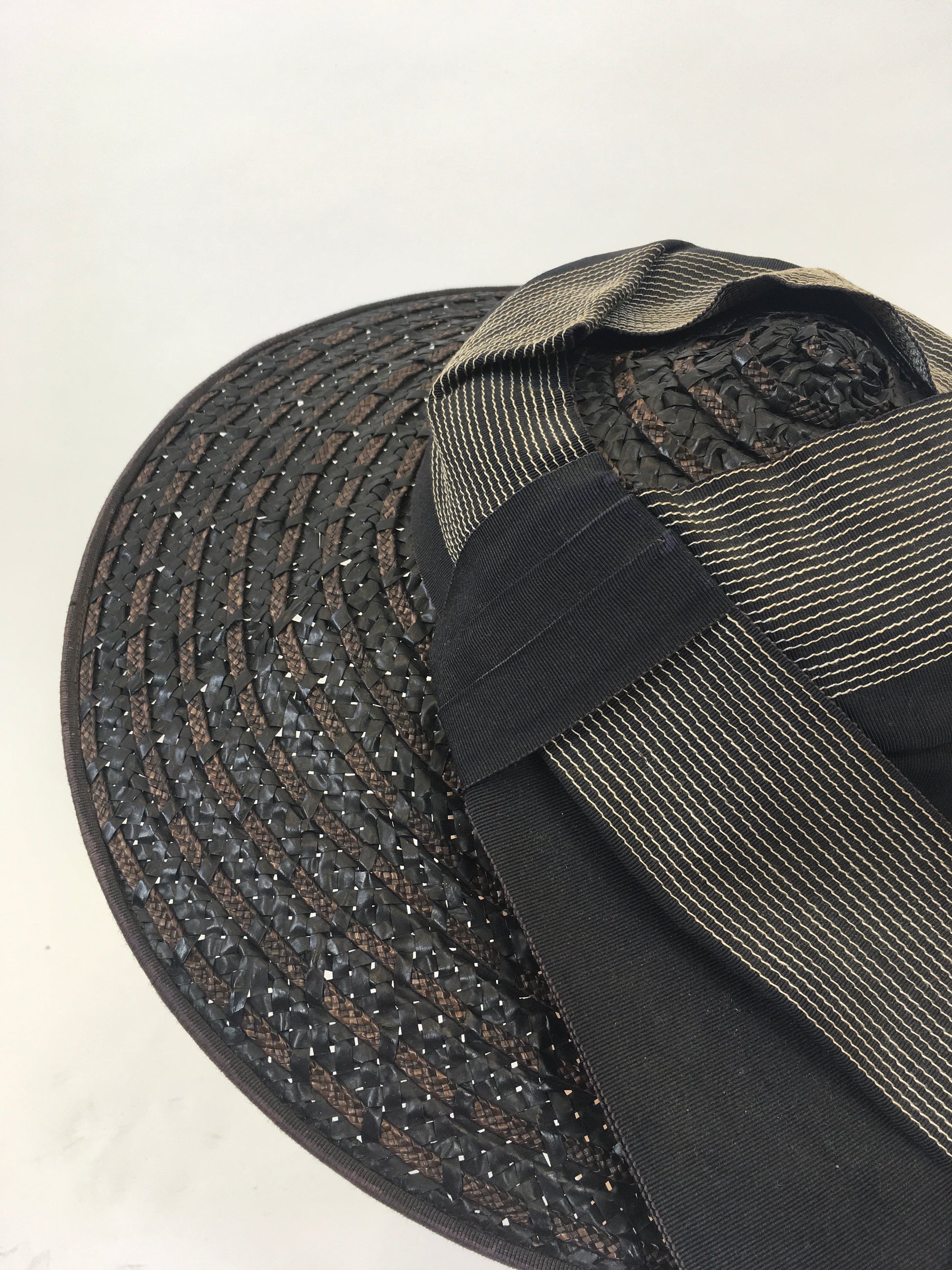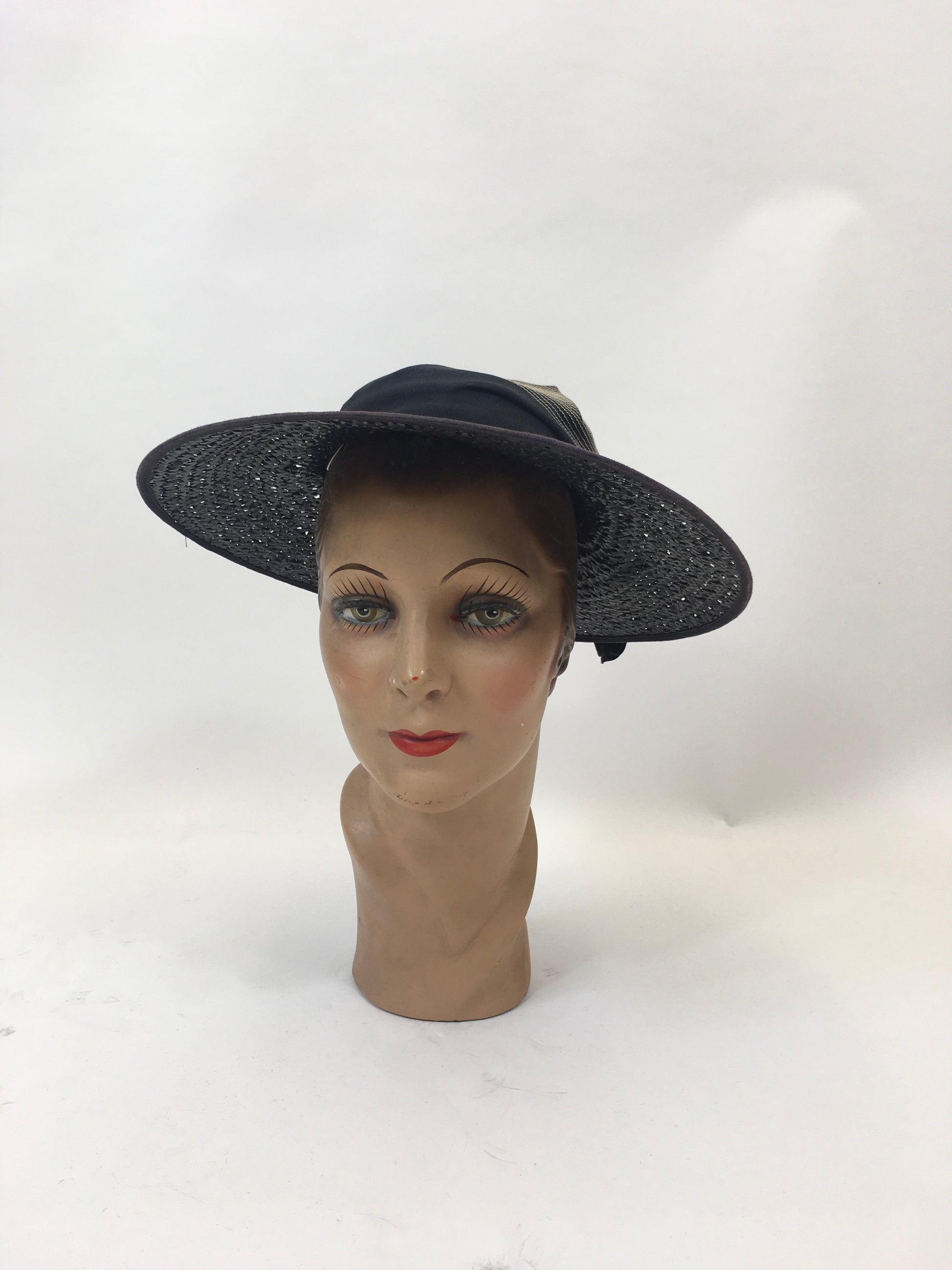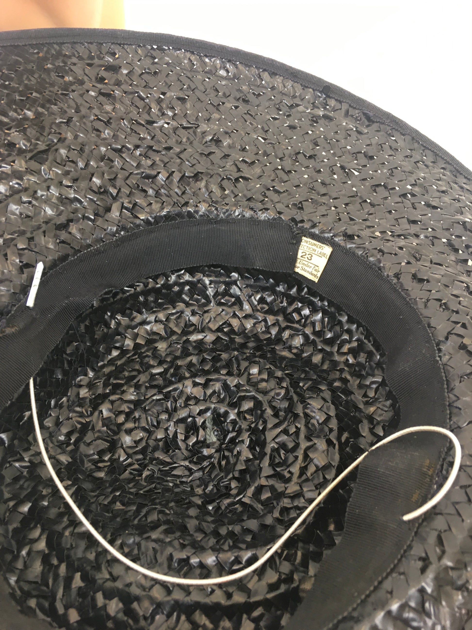 Vintage 1940’s fabulous straw hat in Navy. Large brimmed hat, with a shallow crown which has original detailing of a navy grosgrain ribbon and then same ribbon with over stitching detailing in white contrast. It is constructed of a slightly larger weave , which adds to its appearance, all edged in navy. National Consumer’s Board label present with 23. Internal bias band an elastic headband.