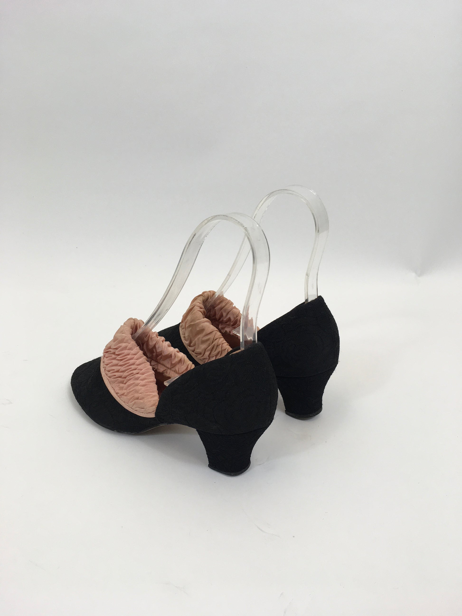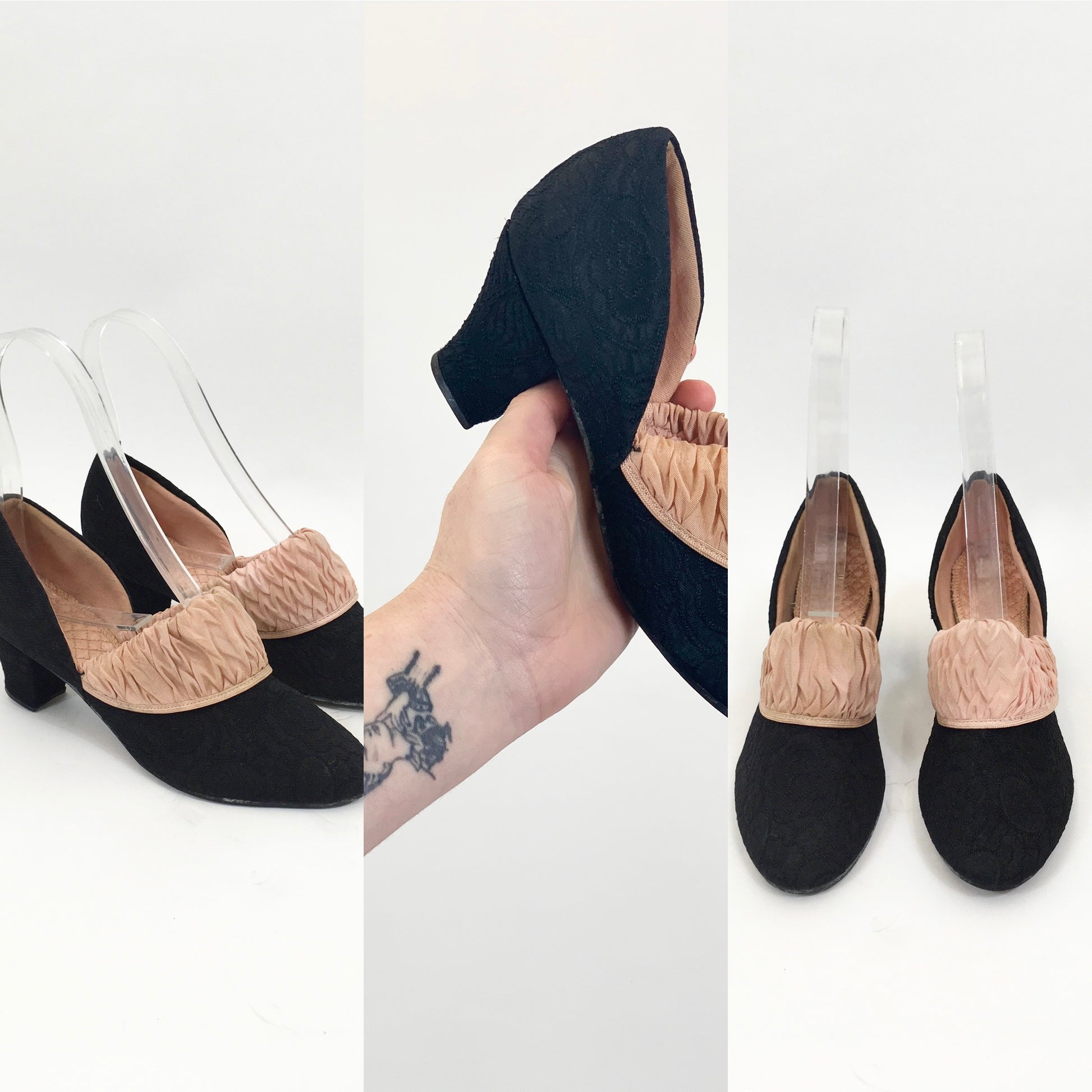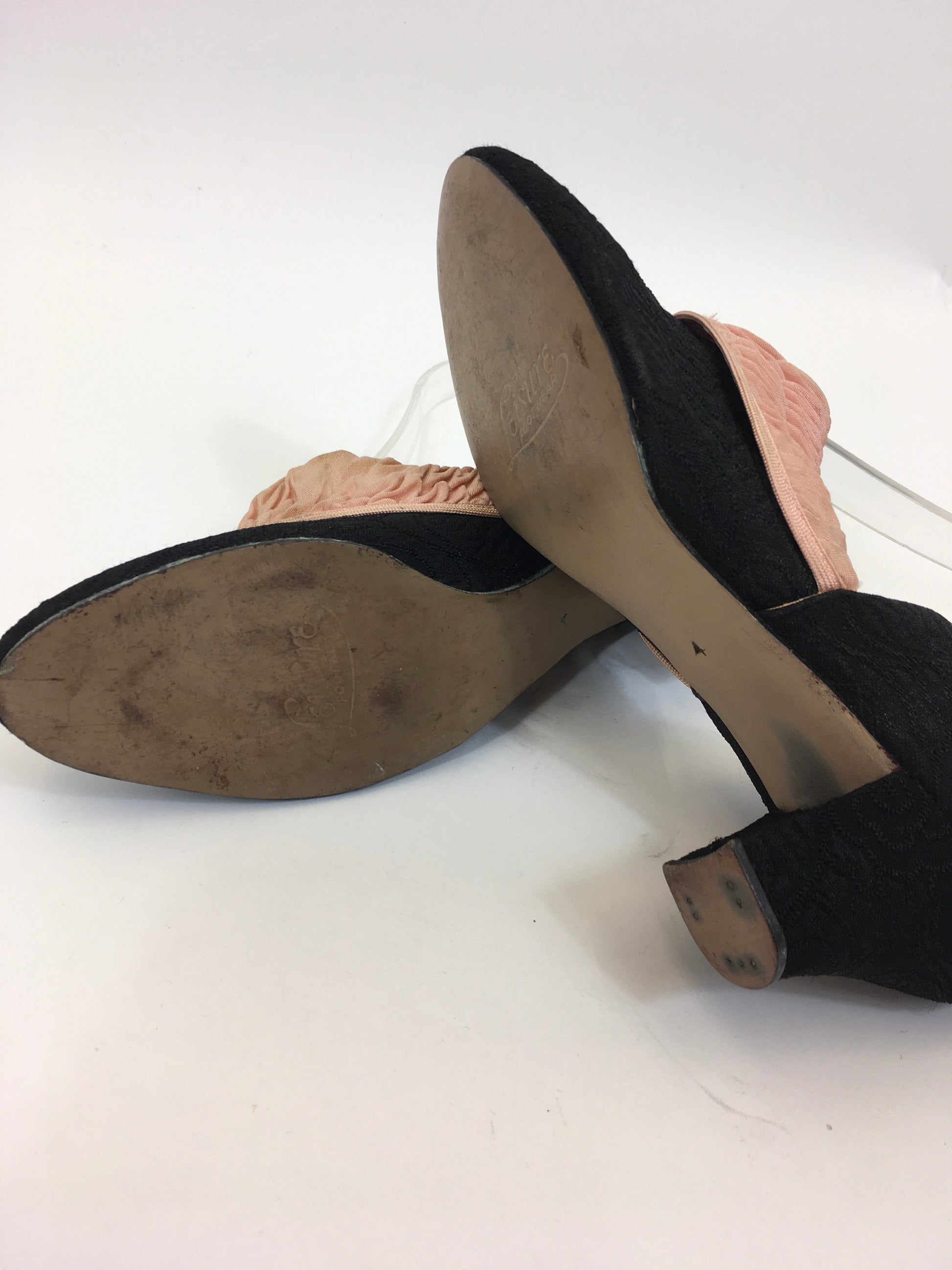 Vintage 1940's glamour slippers in Black with Dusky Pink. Fabulous pair of heeled slippers, in a beautiful textured black fabric ( almost damask type )with a gorgeous front dusky pink whelk band to the front. Inside the slippers they share the gorgeous pink colour too. A small heel of approximately 1.5". Such an iconic shape and feature of the era. "Leisure Footwear" stamped on the underneath, very sturdy and well made.
