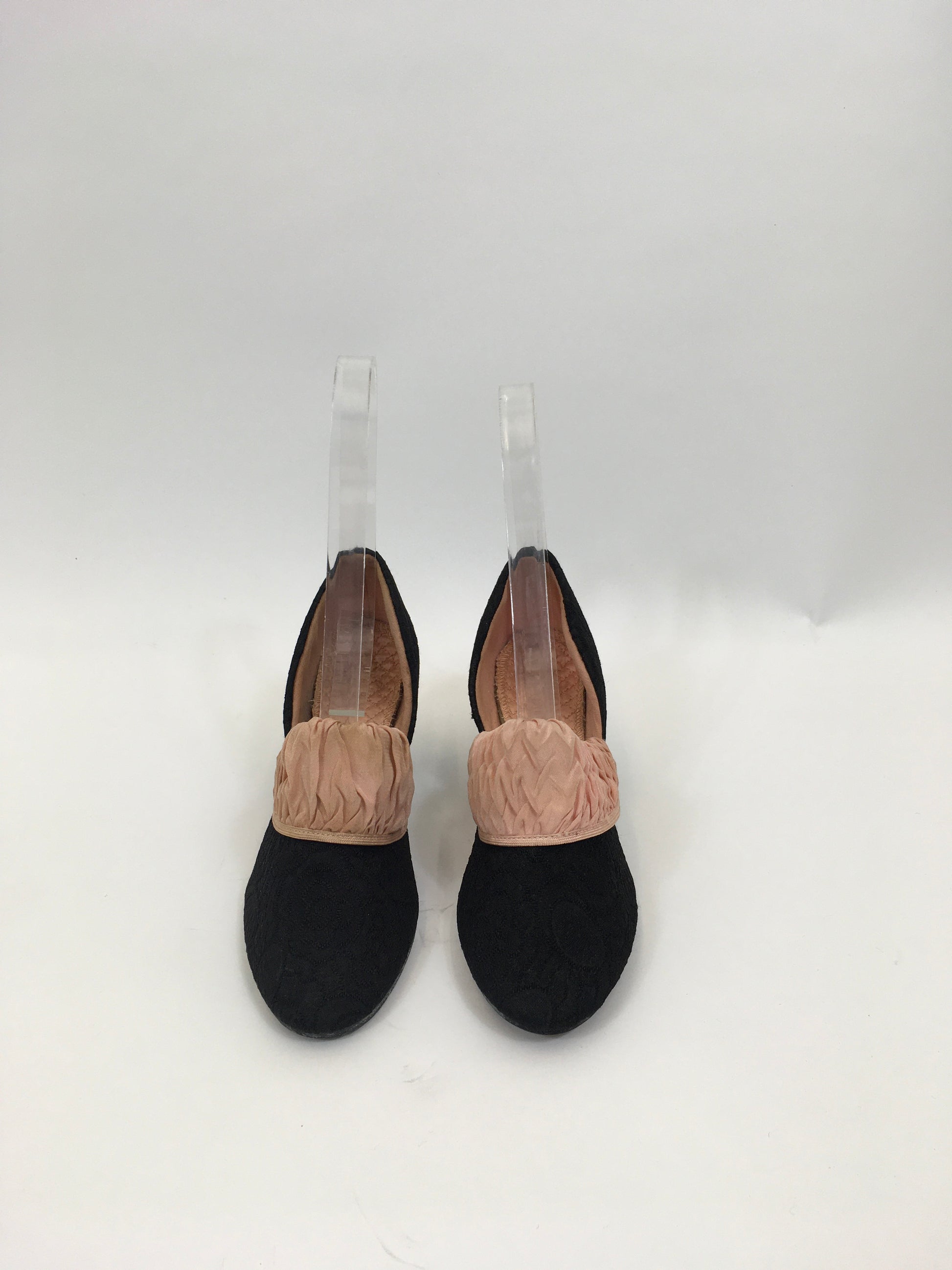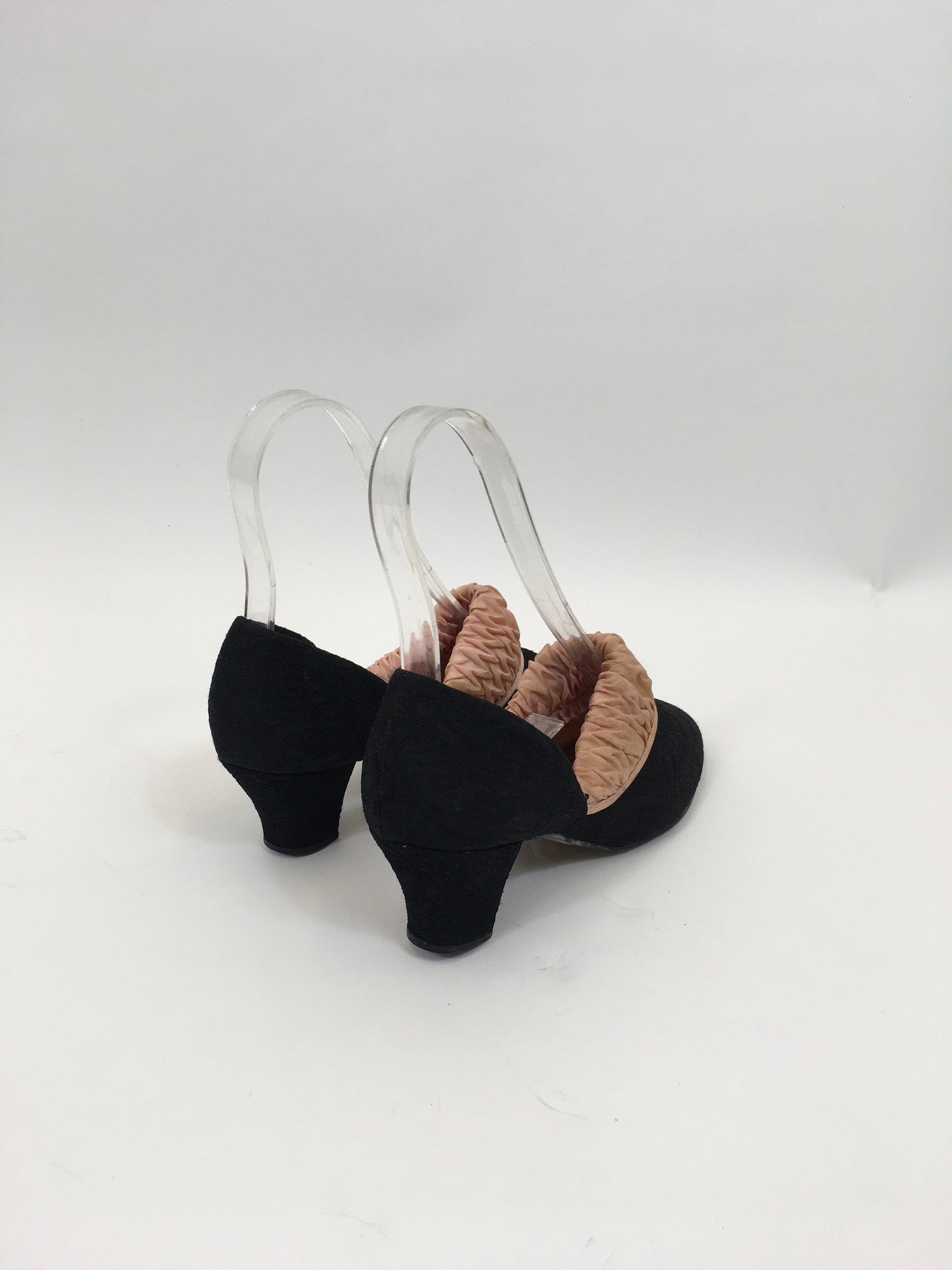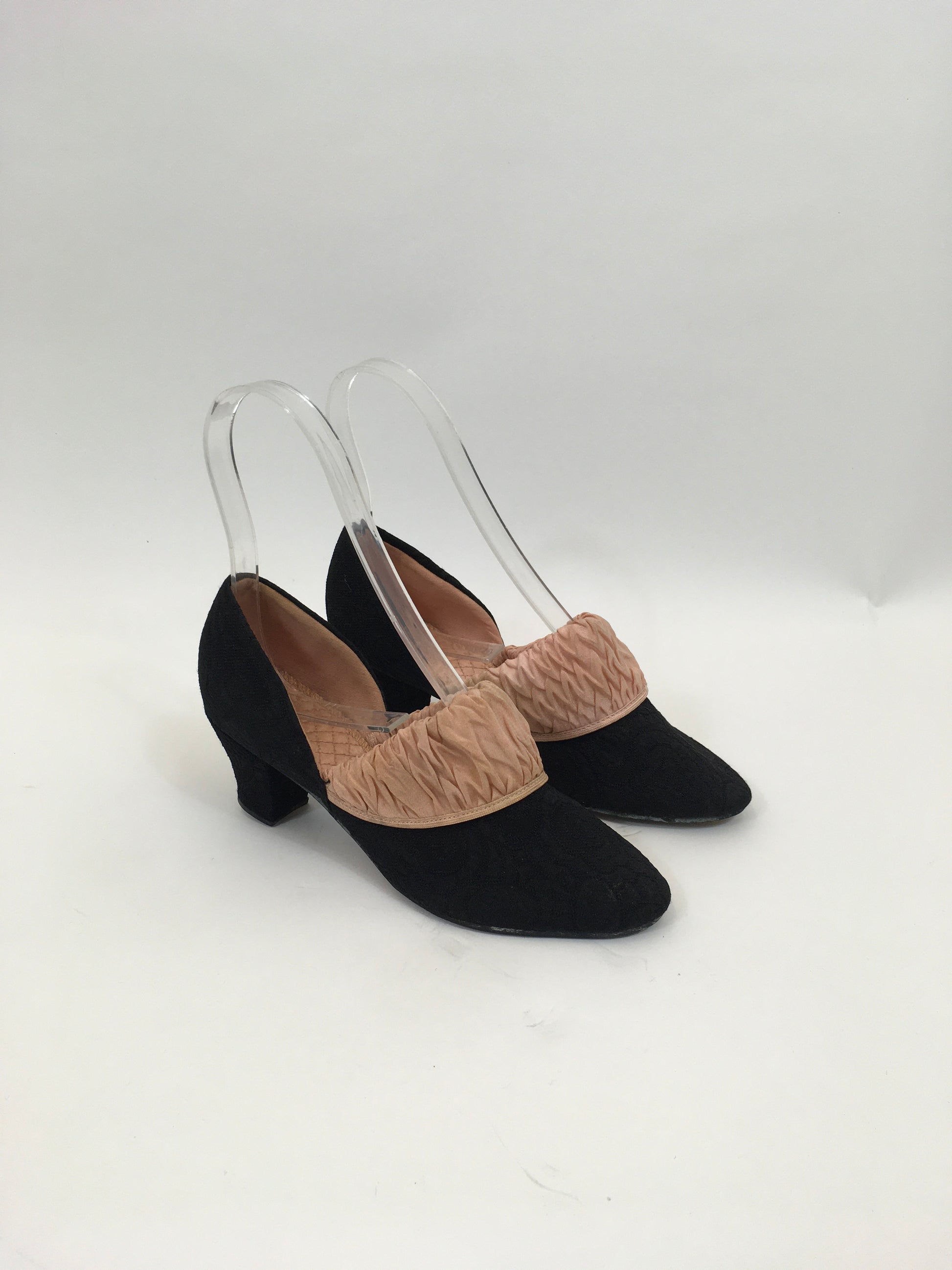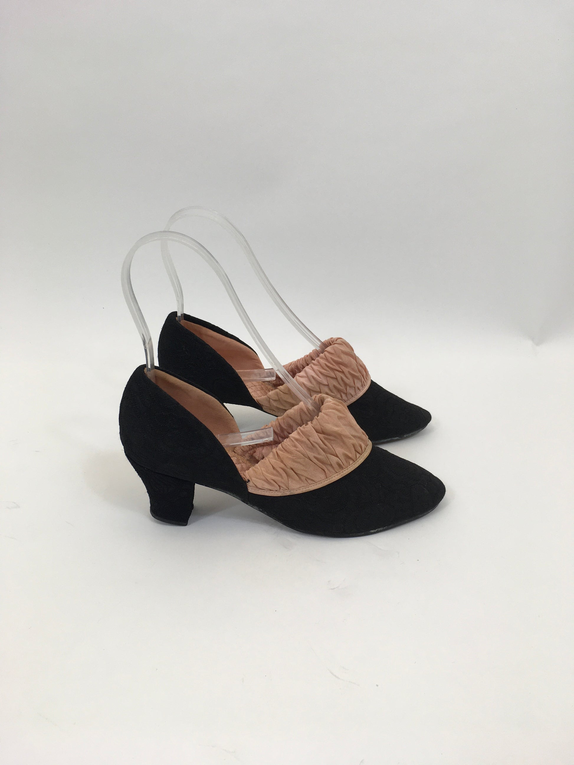 Vintage 1940's glamour slippers in Black with Dusky Pink. Fabulous pair of heeled slippers, in a beautiful textured black fabric ( almost damask type )with a gorgeous front dusky pink whelk band to the front. Inside the slippers they share the gorgeous pink colour too. A small heel of approximately 1.5". Such an iconic shape and feature of the era. "Leisure Footwear" stamped on the underneath, very sturdy and well made.
