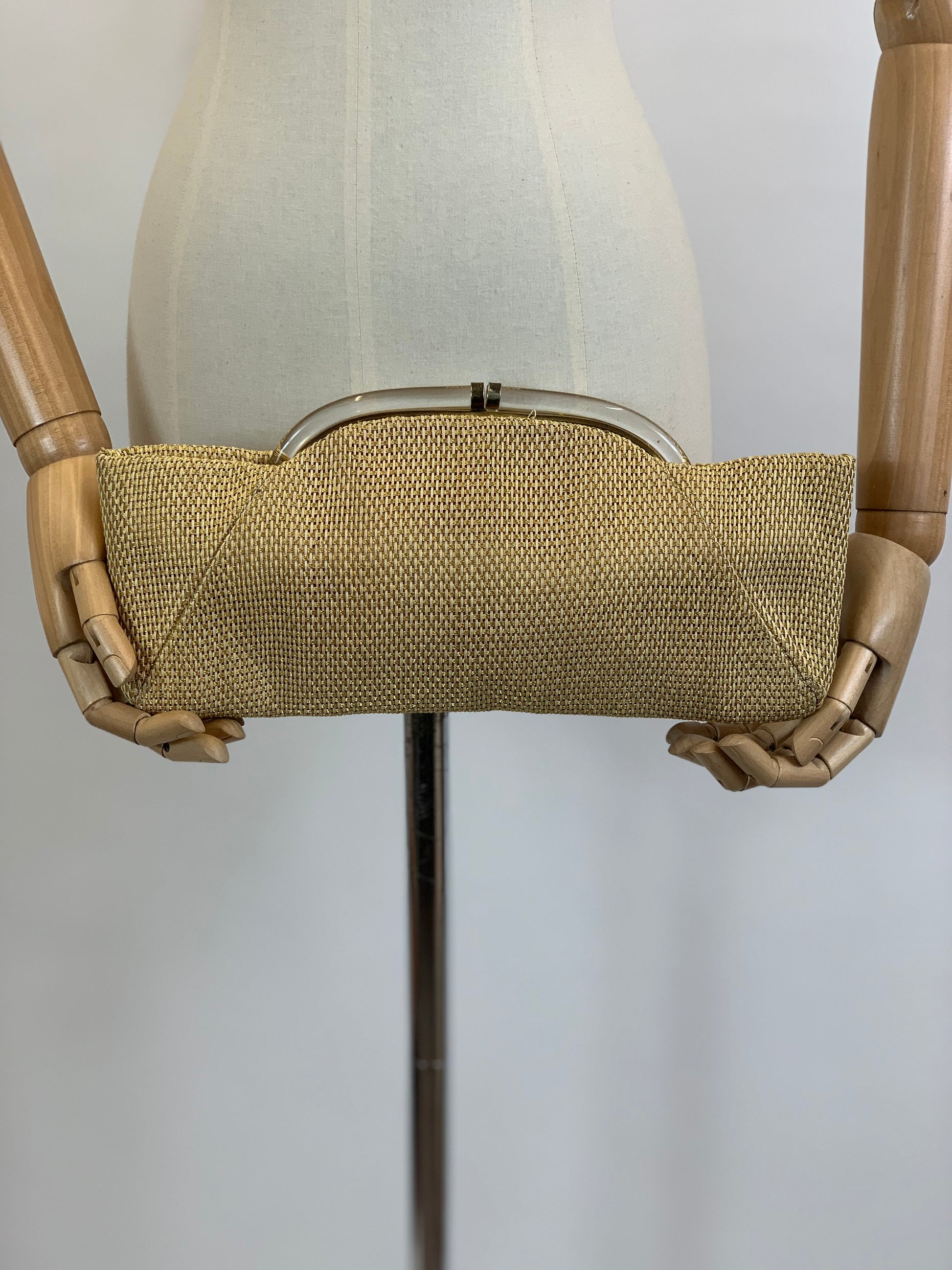 Vintage late 1940’s weave clutch bag in gold tones. A lovely weave construction on this clutch bag, all sits on a gold tone frame which has an amazing lucite bar clasp. Gold and cream fabric weave outer. Good size. Internal satin large compartment with side pockets for hankie, lipstick etc. A traditional finger strap to the back. Good strong clasp.