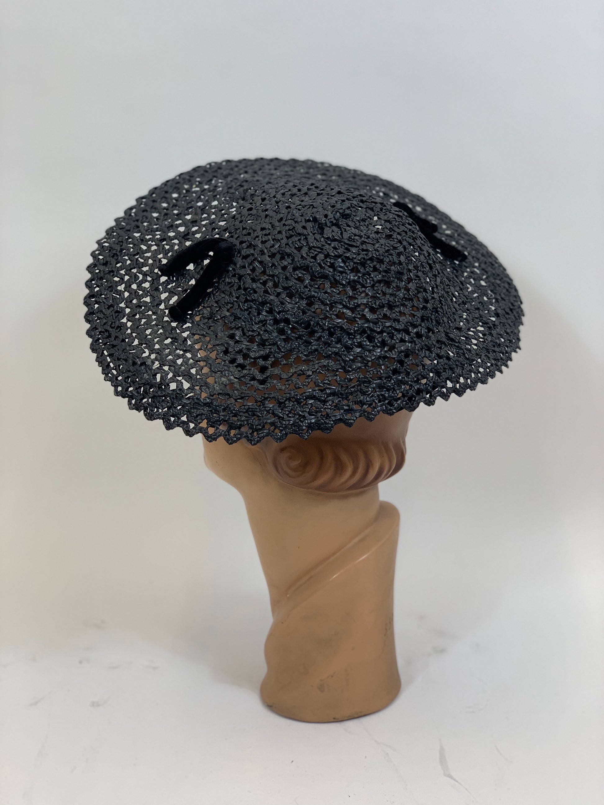 Vintage 1950’s beautiful platter hat in Black weave. Open weave structure with pretty black velvet bows adorned to the outer sides. Such an iconic shape of the late 40’s going into the 50’s with the Dior new look era of 1947, with its charm and grace. It all sits on a velvet covered wire structure with side grips to hug your head. This is so versatile fitting in with different hairstyle and different desired looks.