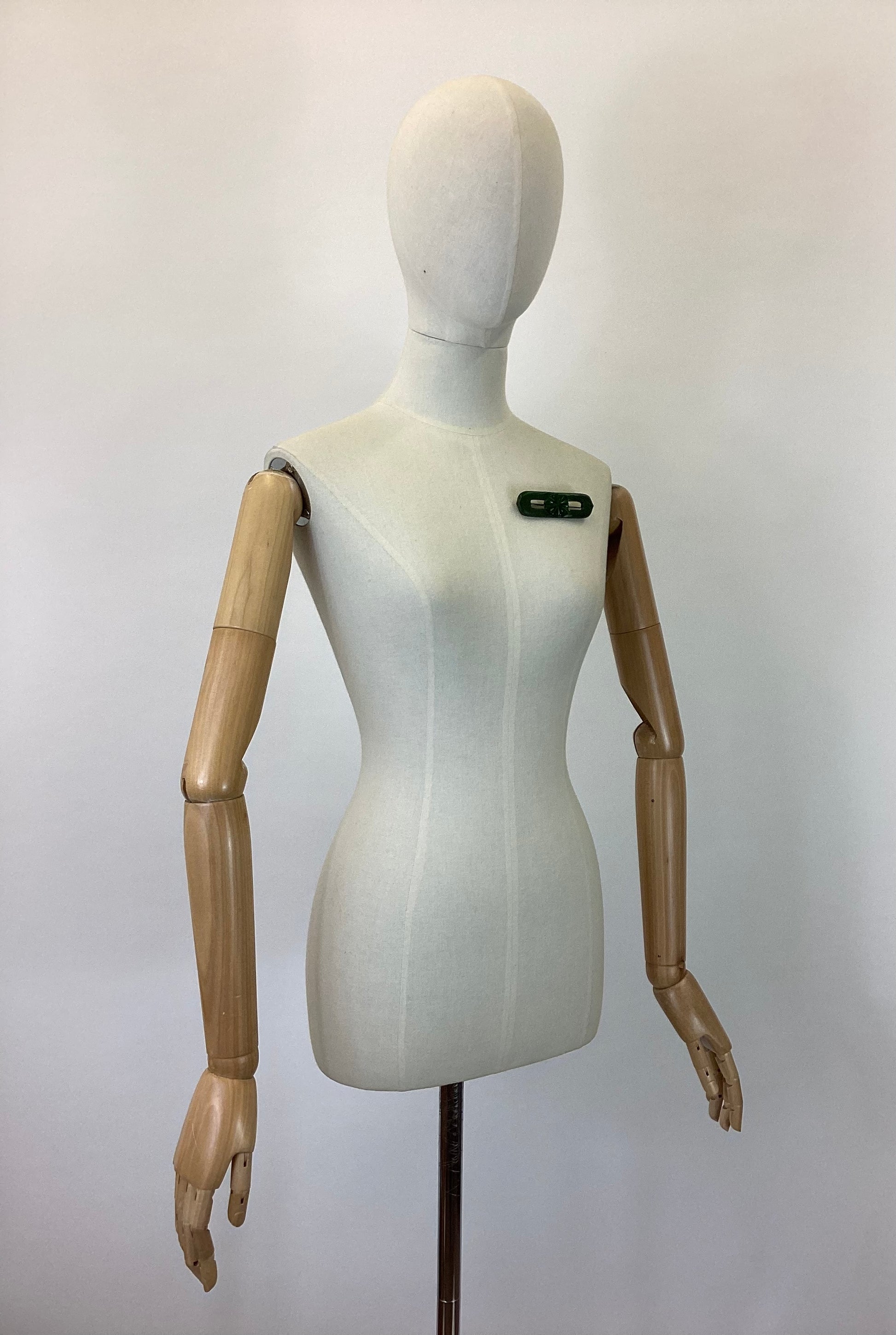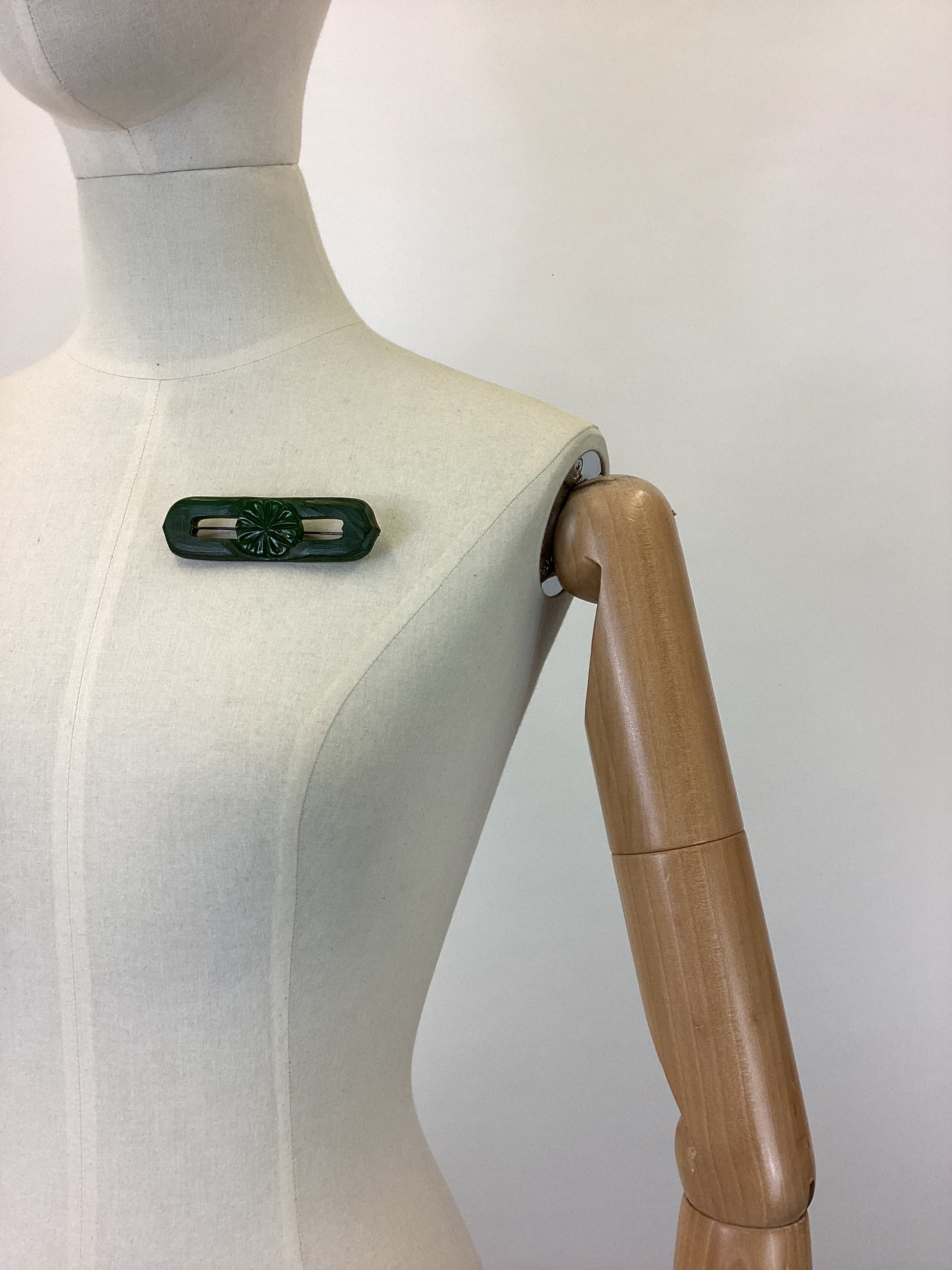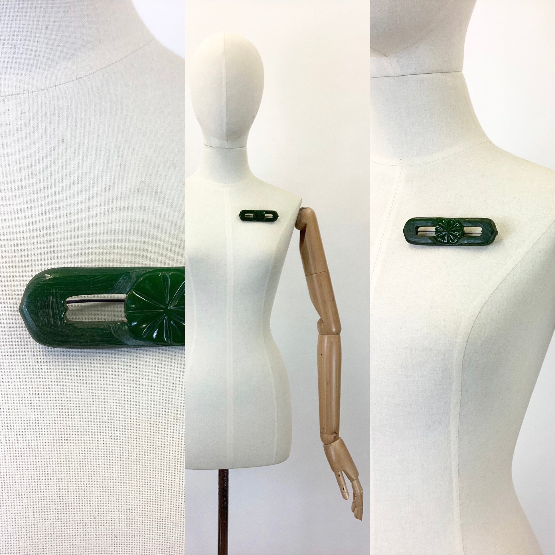 Gorgeous 30s/ 40s forest green Bakelite( not tested by ourselves) long brooch. Amazing accessory for any vintage loving wearer to compliment their outfit. Accessories always bring the whole outfit together. Good tight clasp.