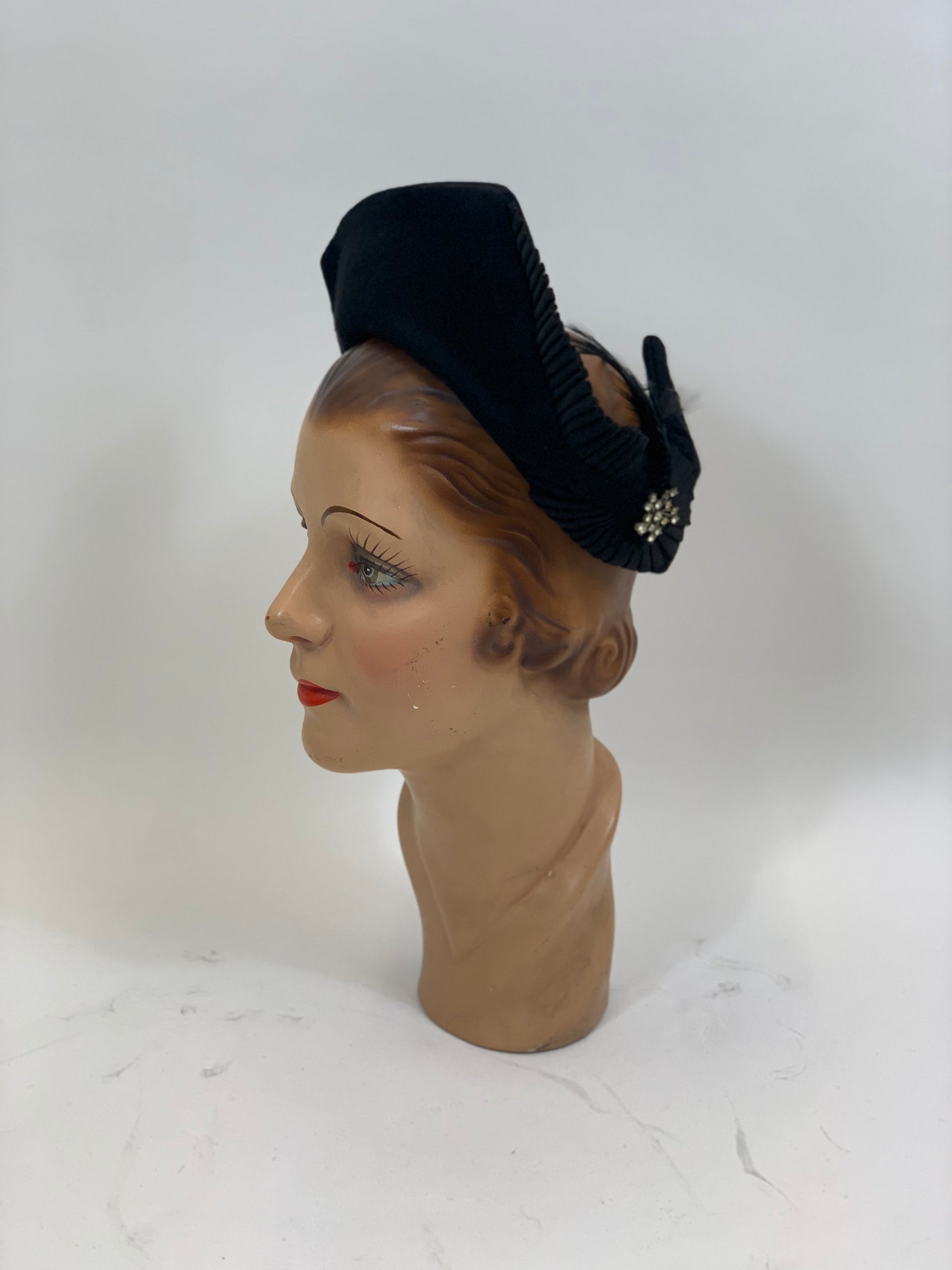 Vintage 1930’s fabulous headpiece in black. Such a wonderful piece with amazing features an open crown and extensive pleating across the top and falling down the side into a spectacular swirl encompassing a pasted jewel and feathers. With an inner structure grosgrain ribbon band.