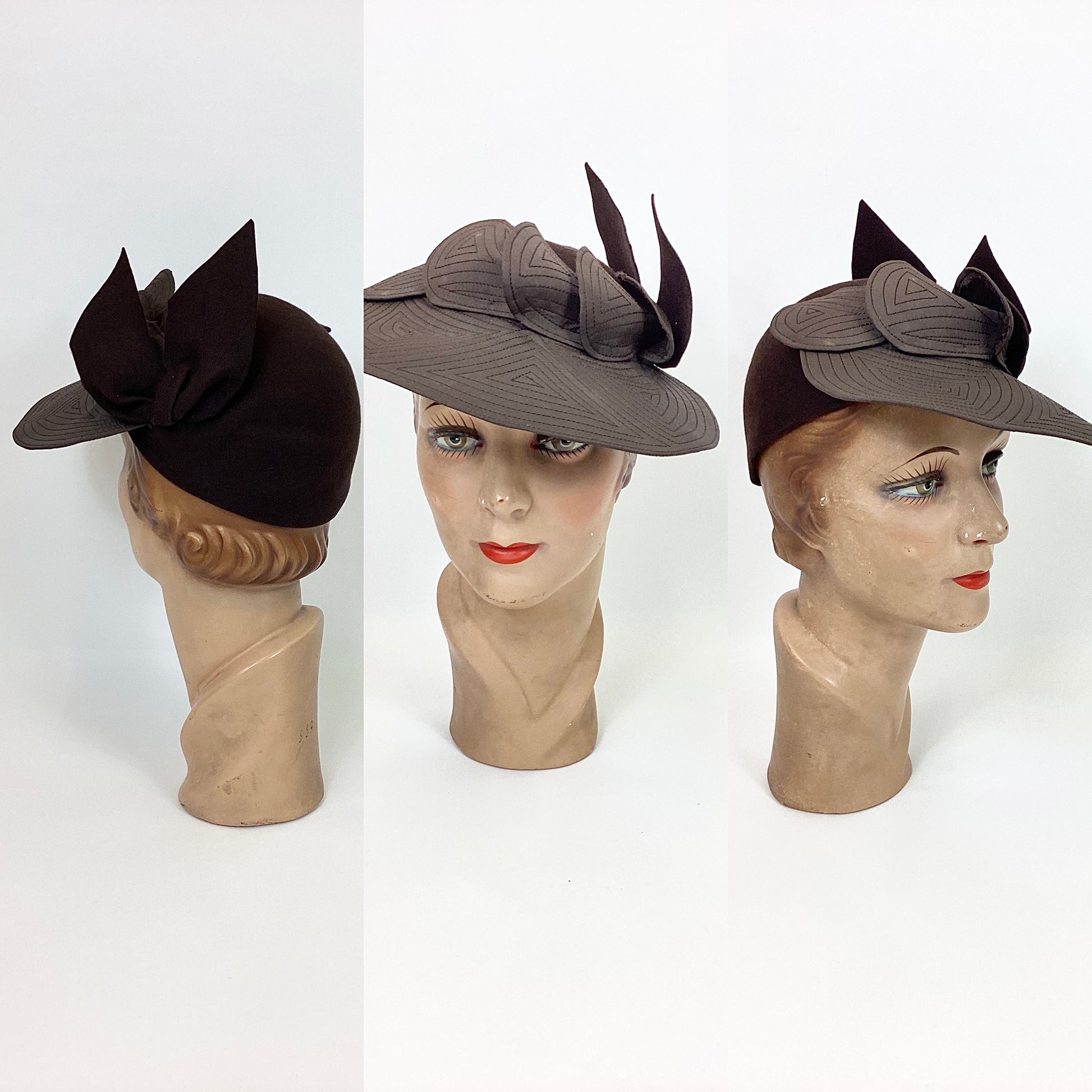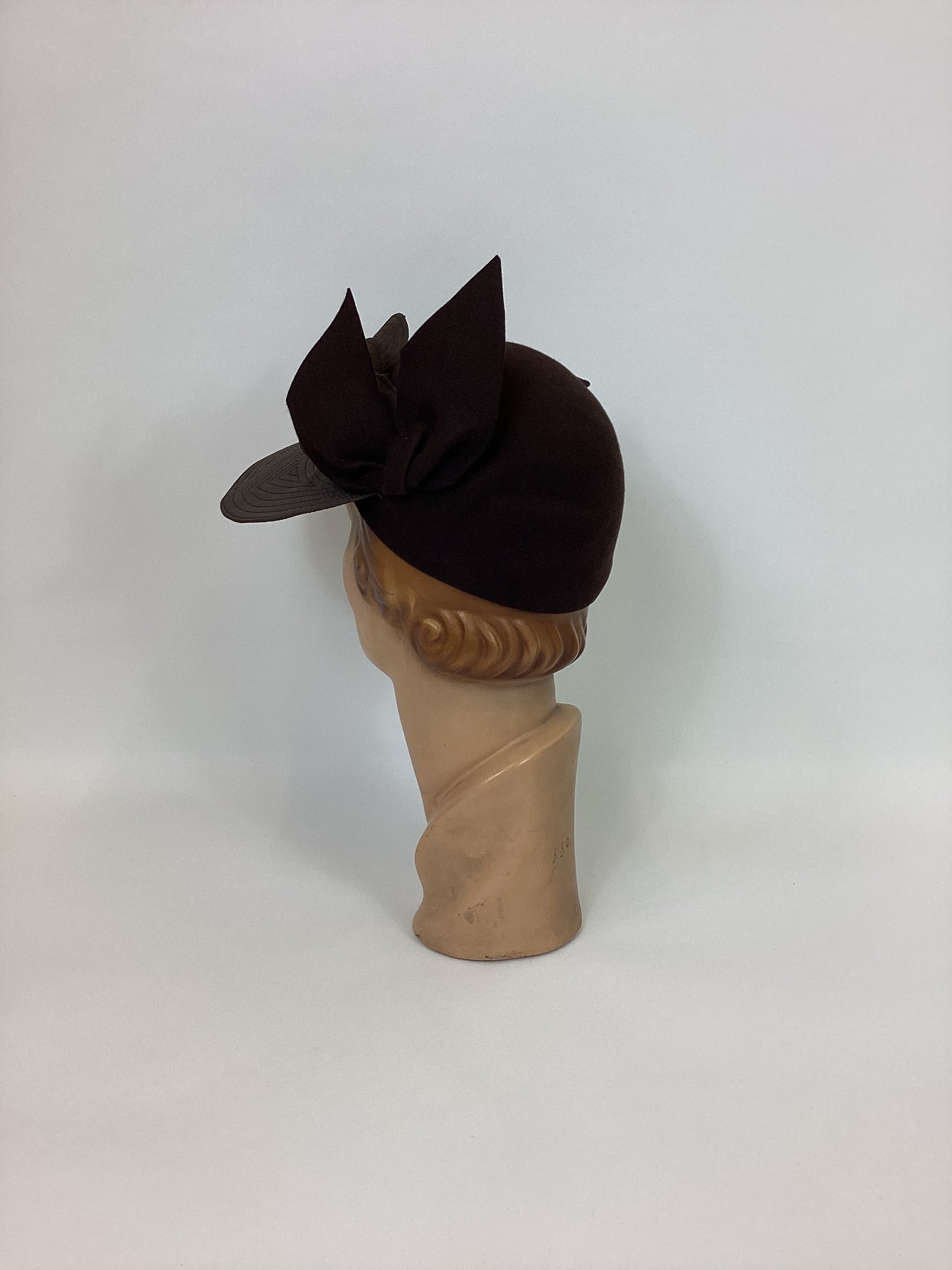 Stunning late 30s / early 40s brown hat. Structured to perfection. Made from a soft felt for the crown and then a covered felt front brim, with an embroidered stitch work pattern. To the front, adorned covered felt again embroidered leaves with a felt twisted bow to end. Stunning workmanship to create a piece of art. Inner band attached ribbon.