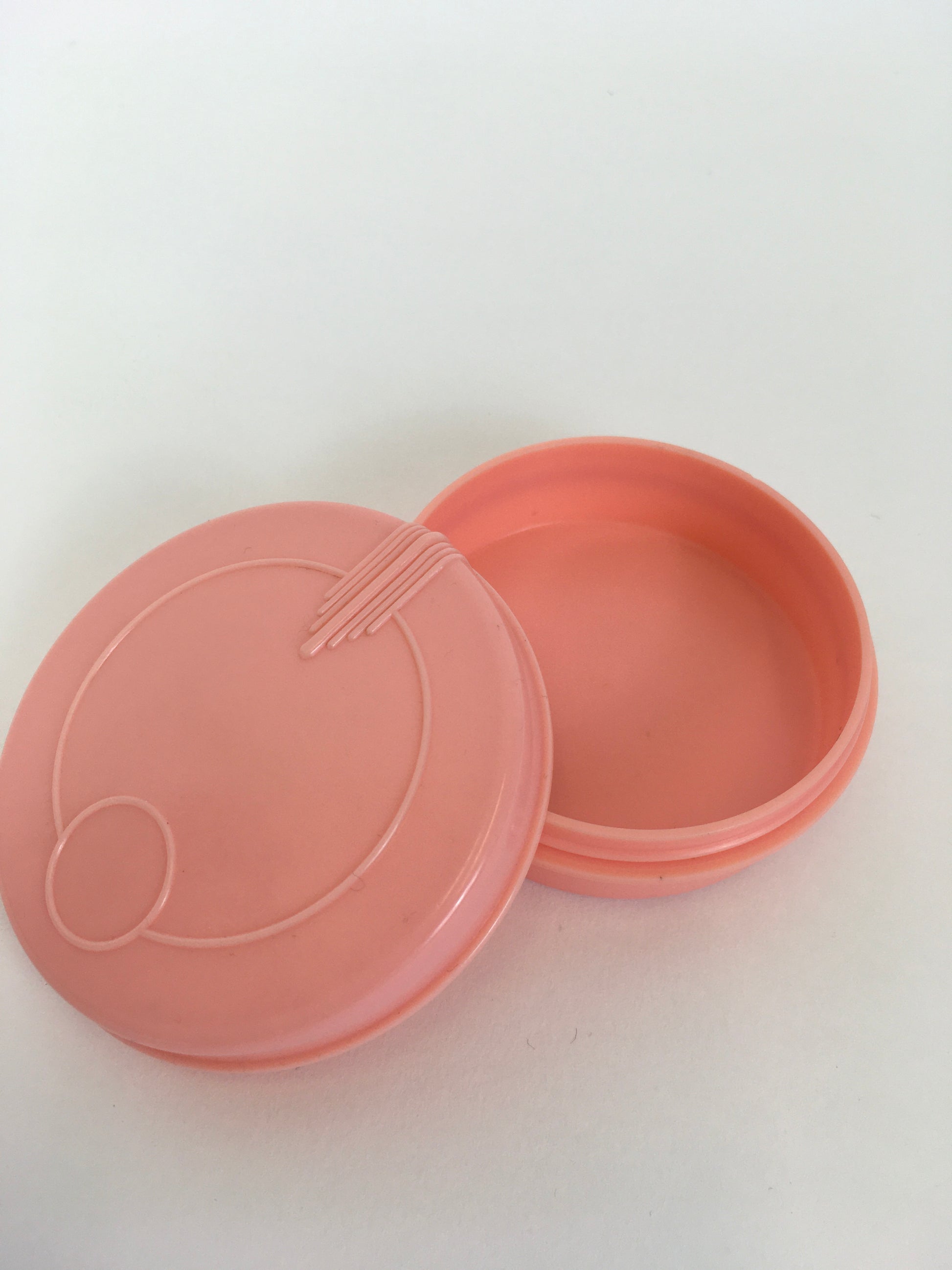 Vintage 1930’s / 1940’s soft powdered pink celluloid vanity pot, with deco motif and screw top lid. This piece measures 3’ diameter and is 1’ deep, great for storing Bobby pins, trinkets, makeup or bits and bobs and looks perfect on your vintage dressing table. A lovely gift to yourself or someone special.