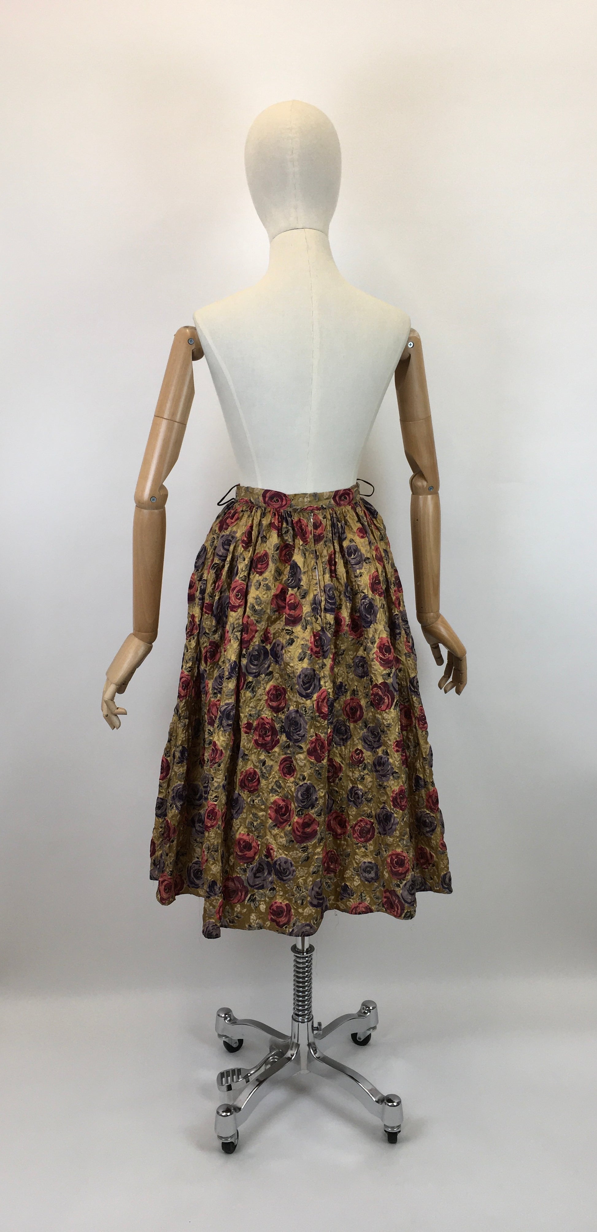 Vintage 1950’s fabulous ‘ Jayne Colton Ltd ‘ skirt in a beautiful wintery colour pallet of rich gold, warm berries and purples. It creates a classic 1950’s silhouette and features a waistband, with hook and eye fastening and metal zip and full pleated skirt. Made from nylon this piece has a natural fullness and can be worn without a petticoat with similar shaping. The print features classic florals and looks beautiful paired with plains or warm knitwear.