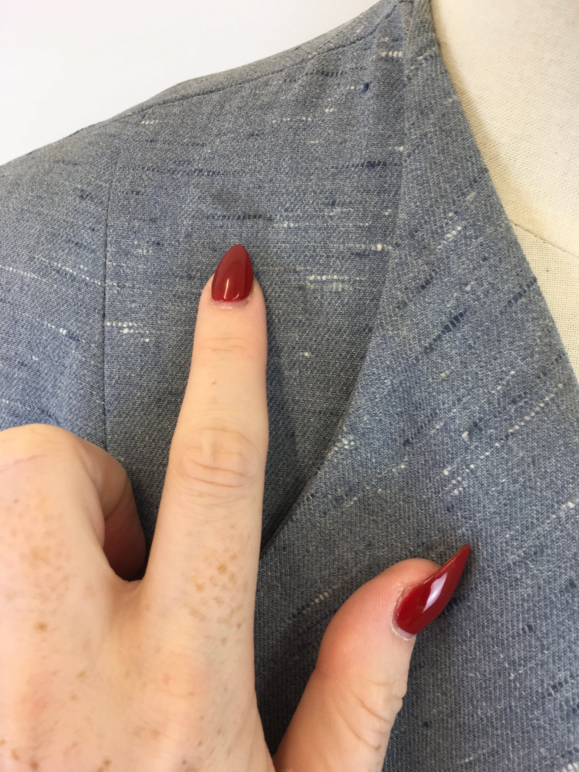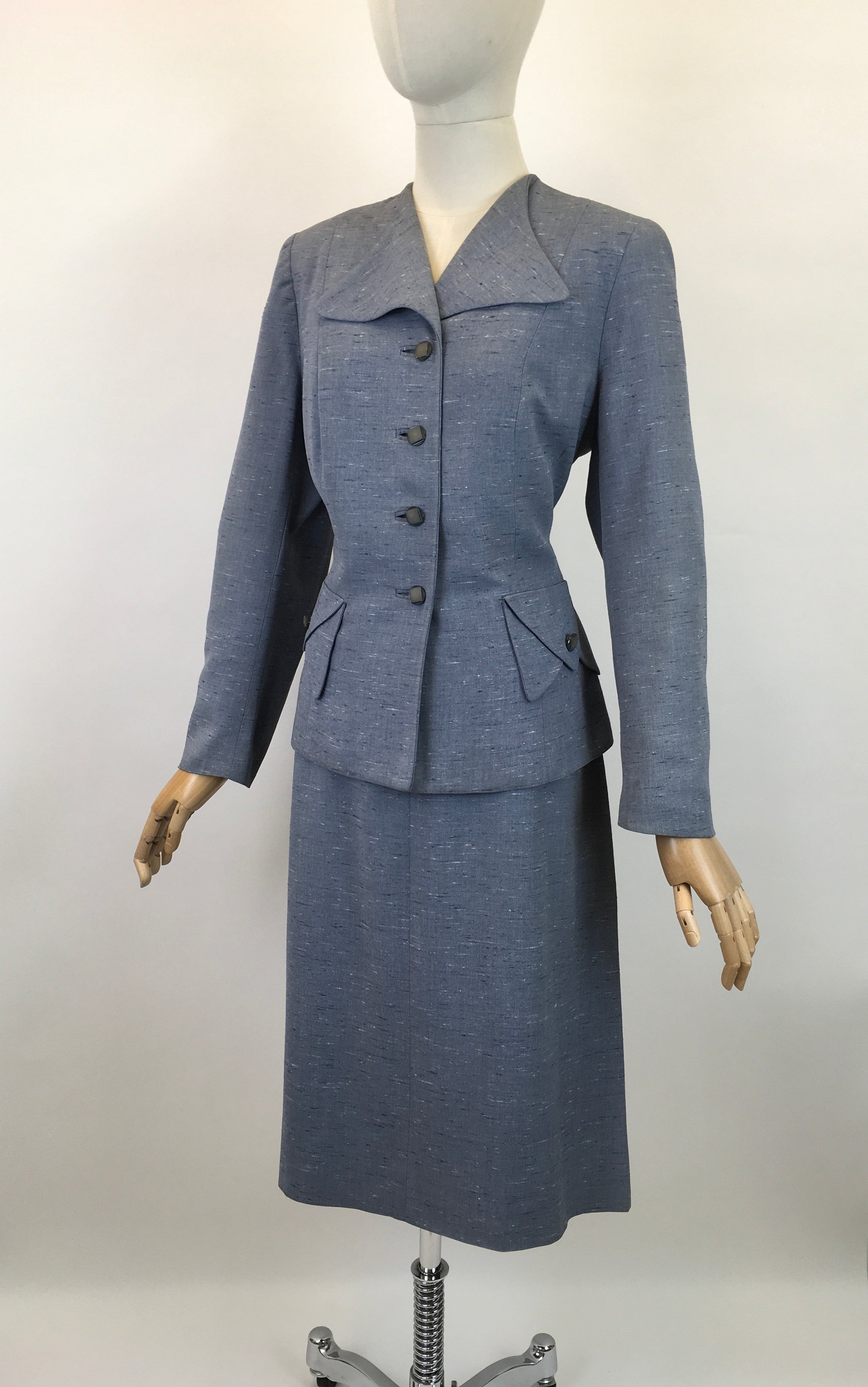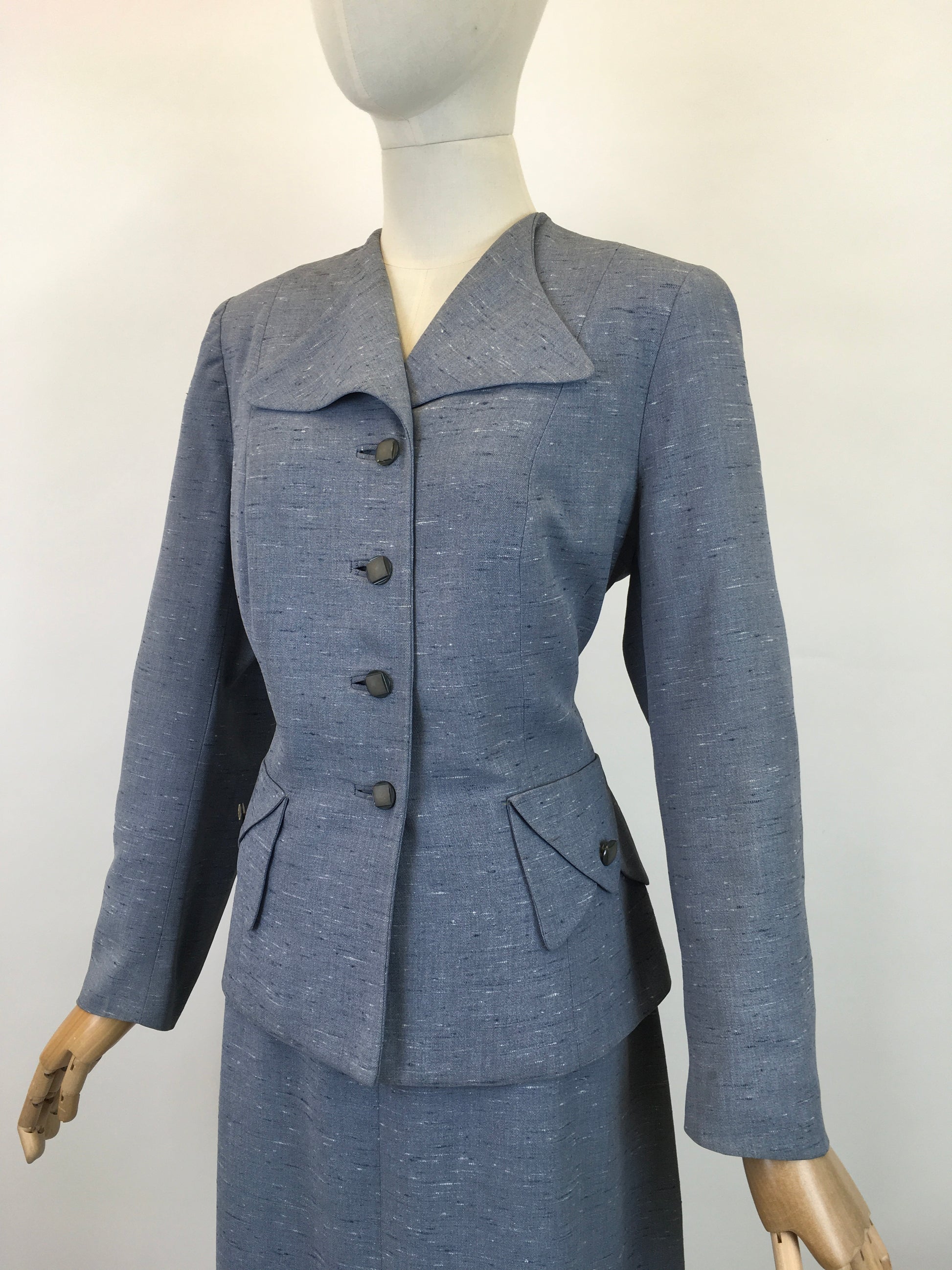 Vintage late 1940’s early 1950’s atomic fleck 2pc suit in a lovely powdered blue. Featuring a classic silhouette this suit has a lovely shoulder line, collar, button detailing to the front and pockets with an a line skirt.