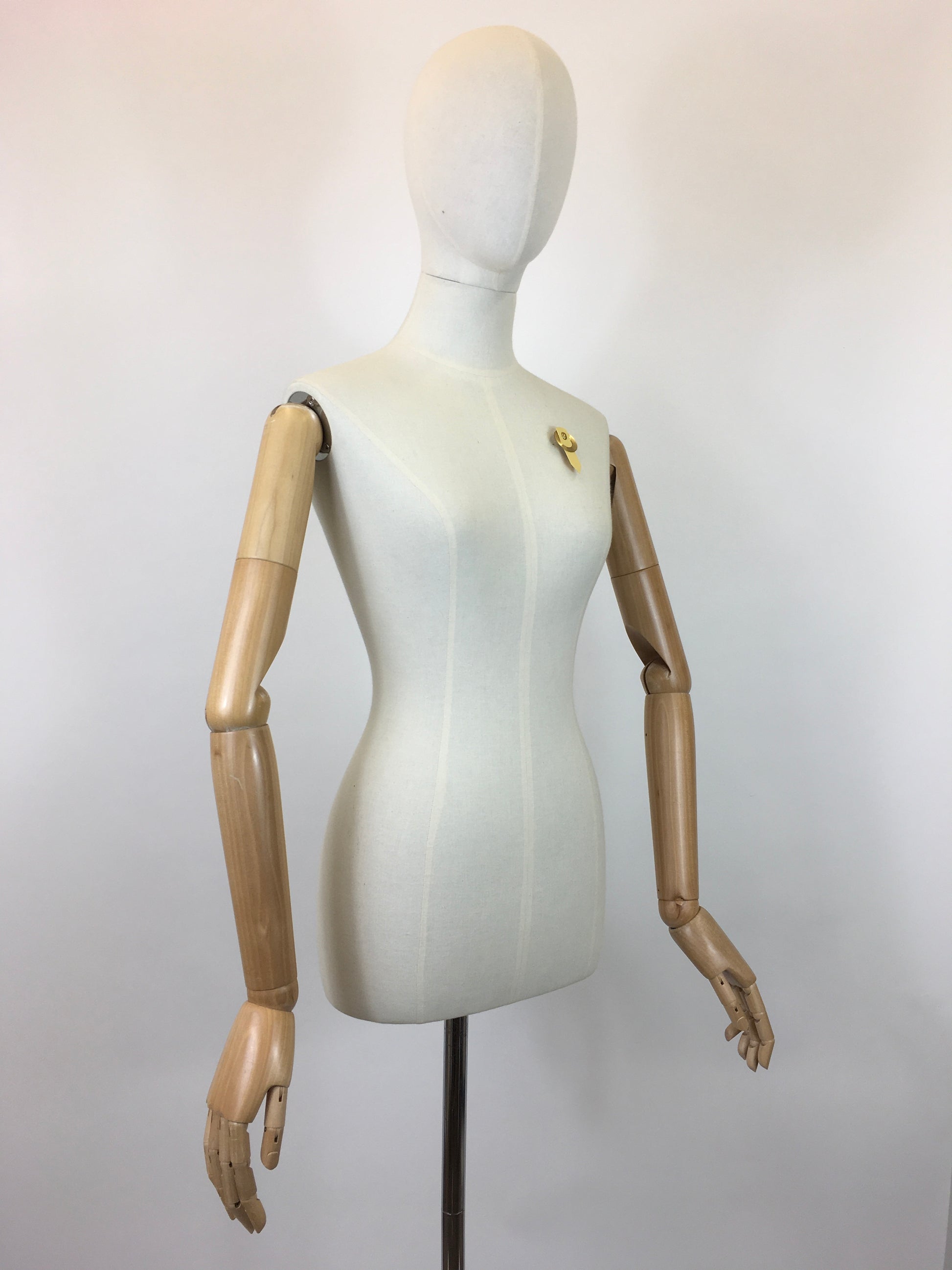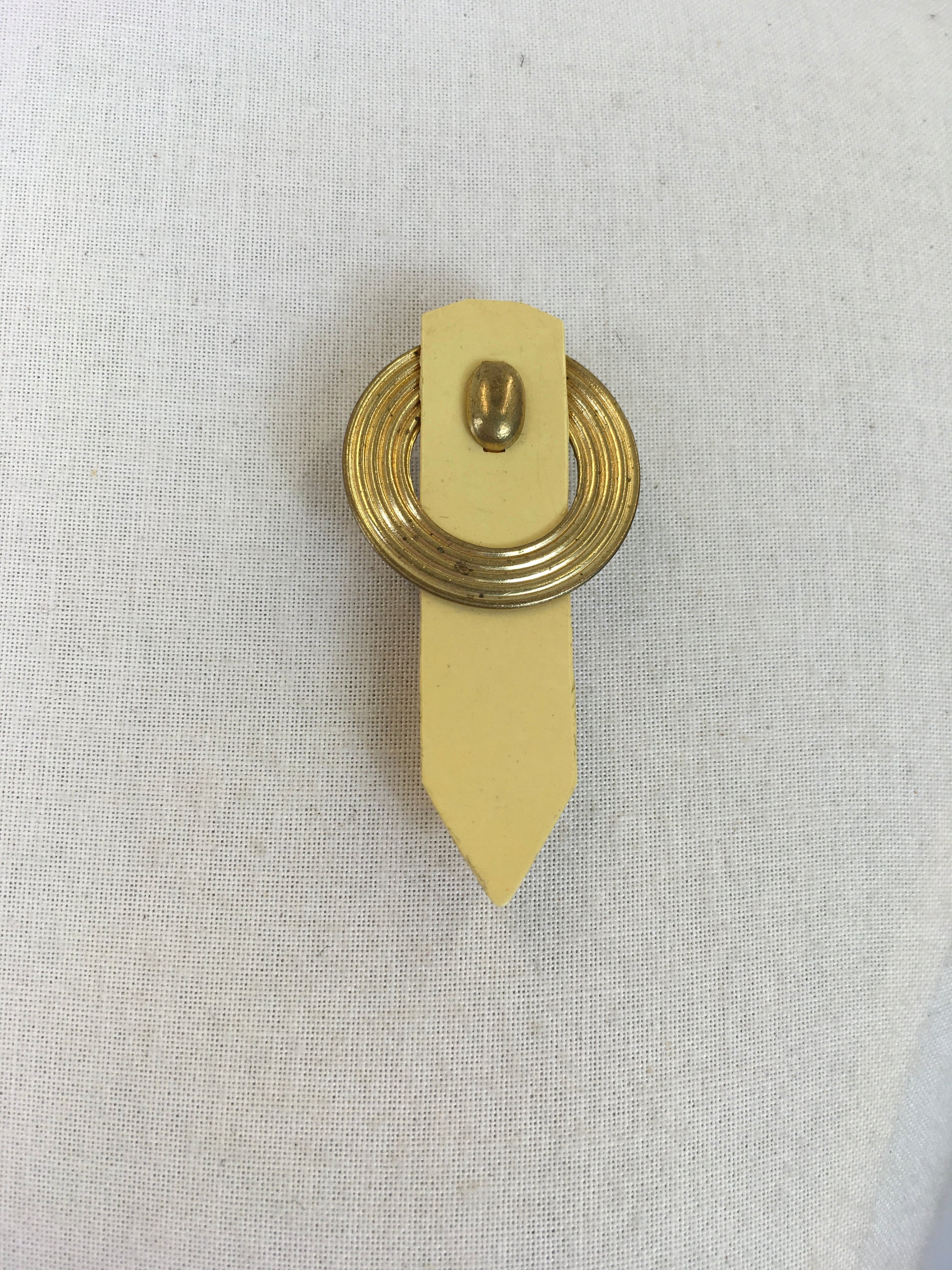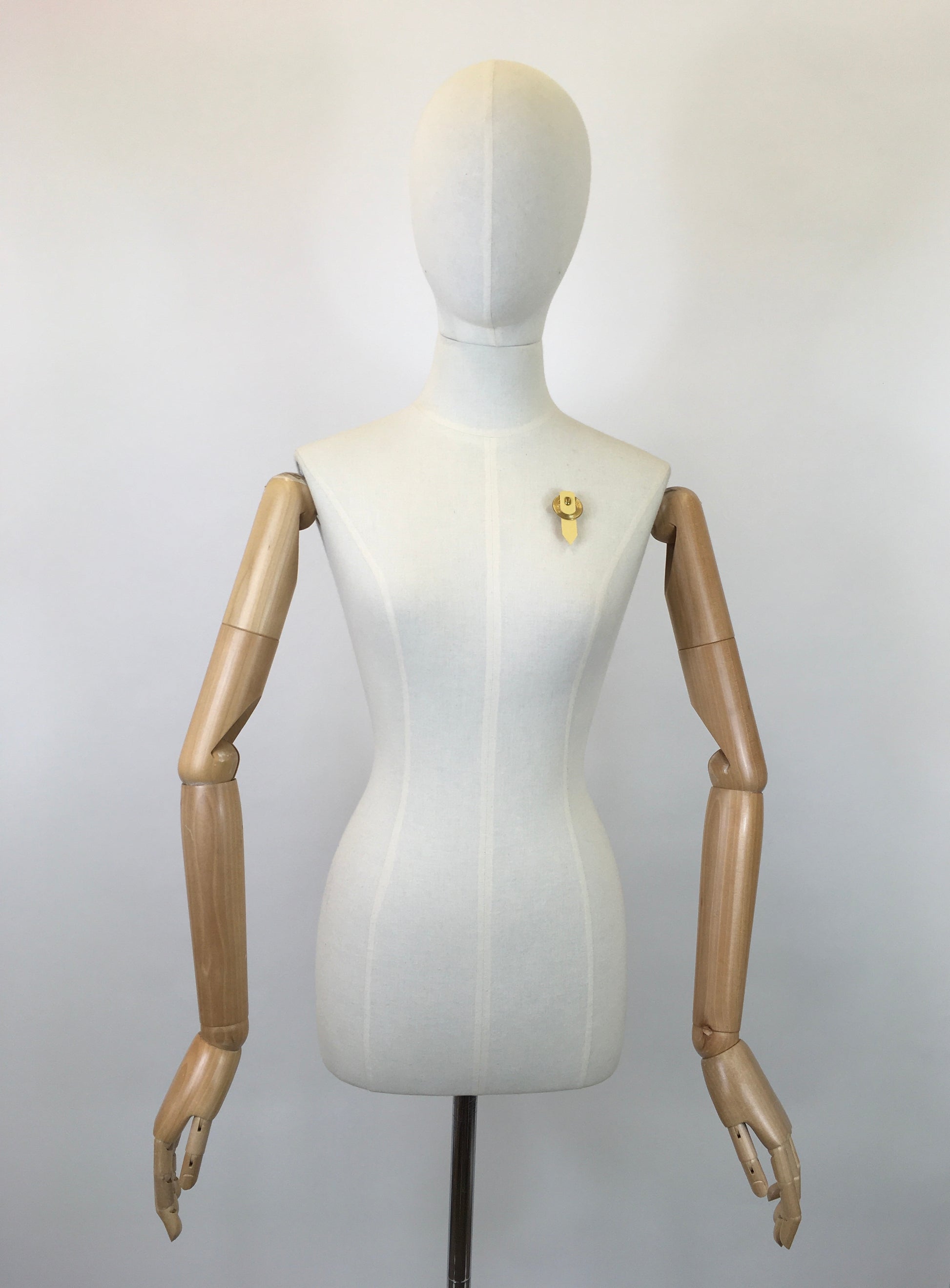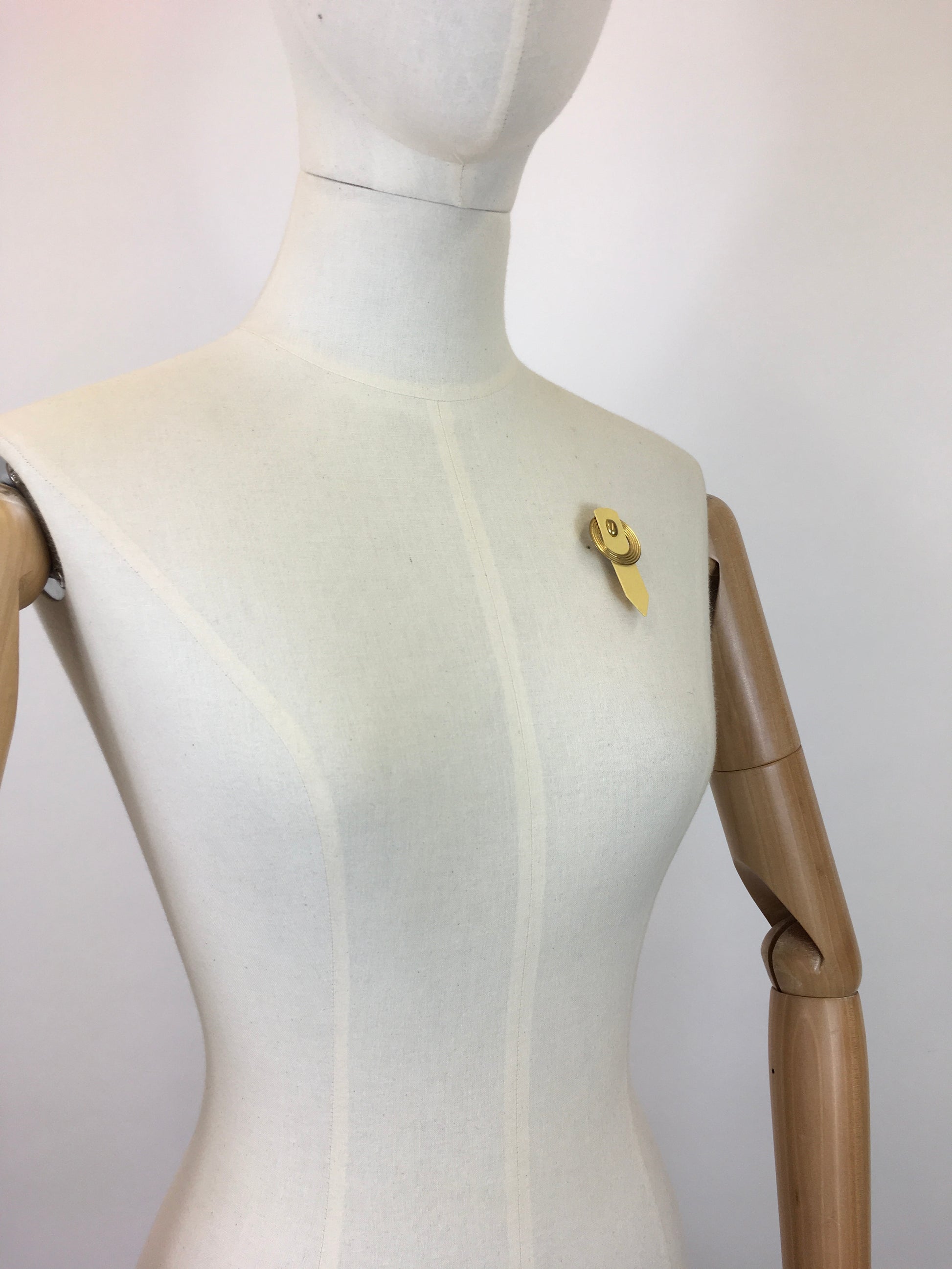 Vintage 1930’s celluloid brooch in corn yellow with a gold circular shaped accent. This is such a lovely piece, subtle and classic in its shape and style. A lovely statement piece to add to a cardigan, jacket or coat.
