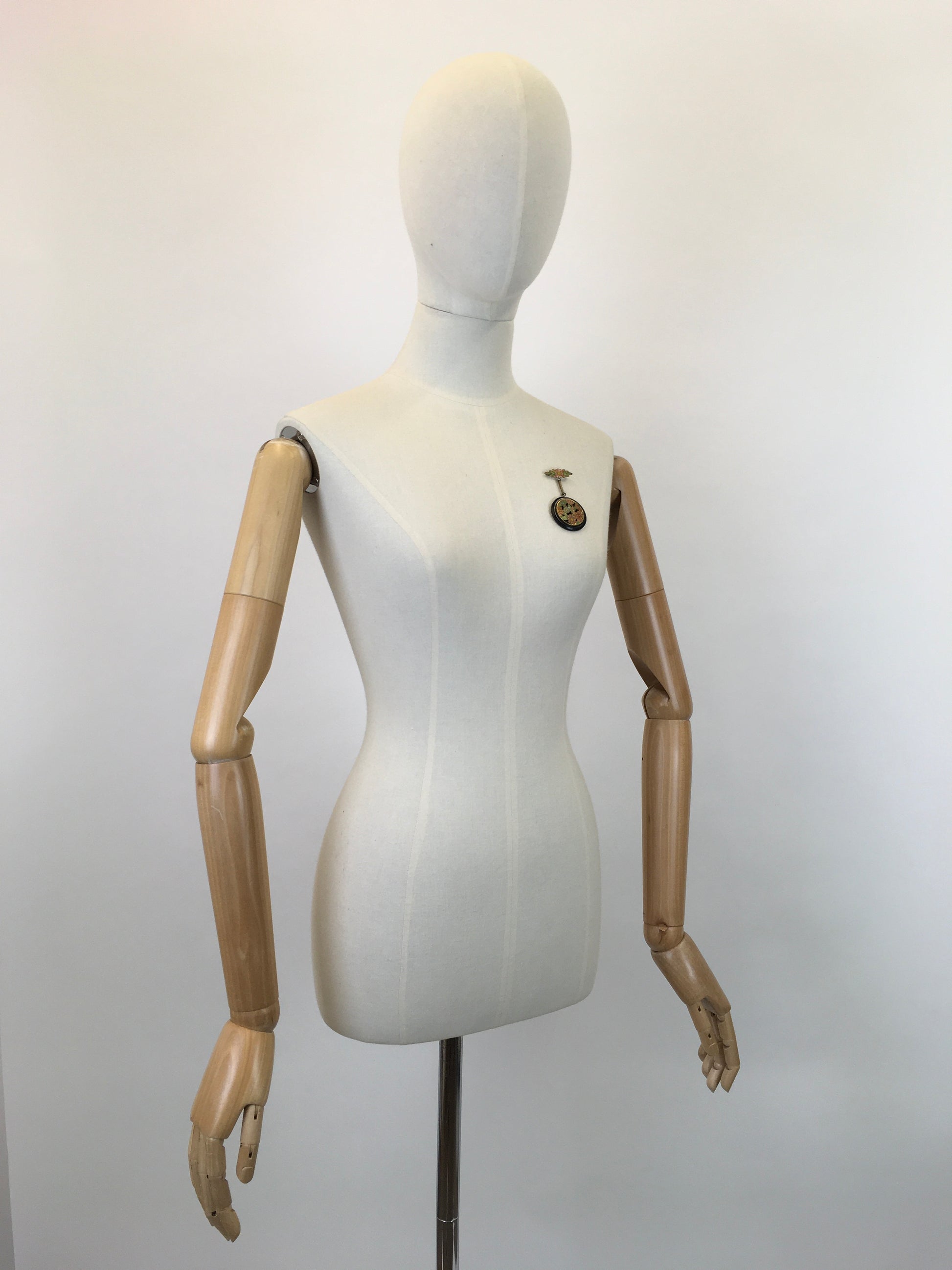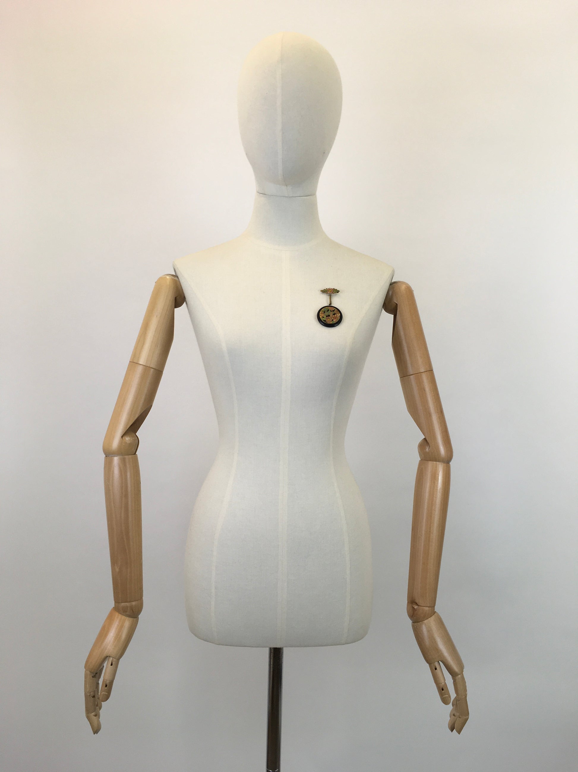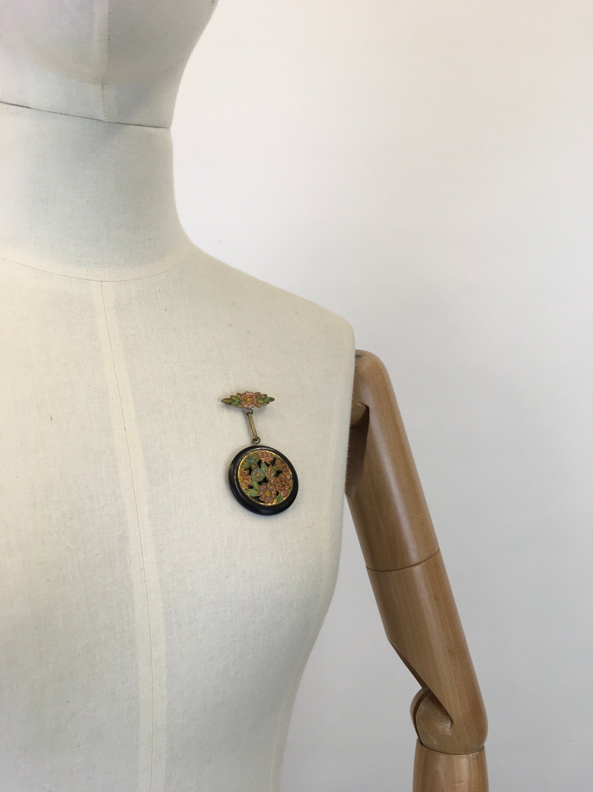 Vintage 1930’s dangle brooch with a floral enamel overlay. This is a lovely piece on a black base filled with enamel florals in pinks, greens, blues and yellows. It measures 3.5 cm x 6 cm and makes a lovely statement on a cardigan, dress or lapel of a jacket or coat.