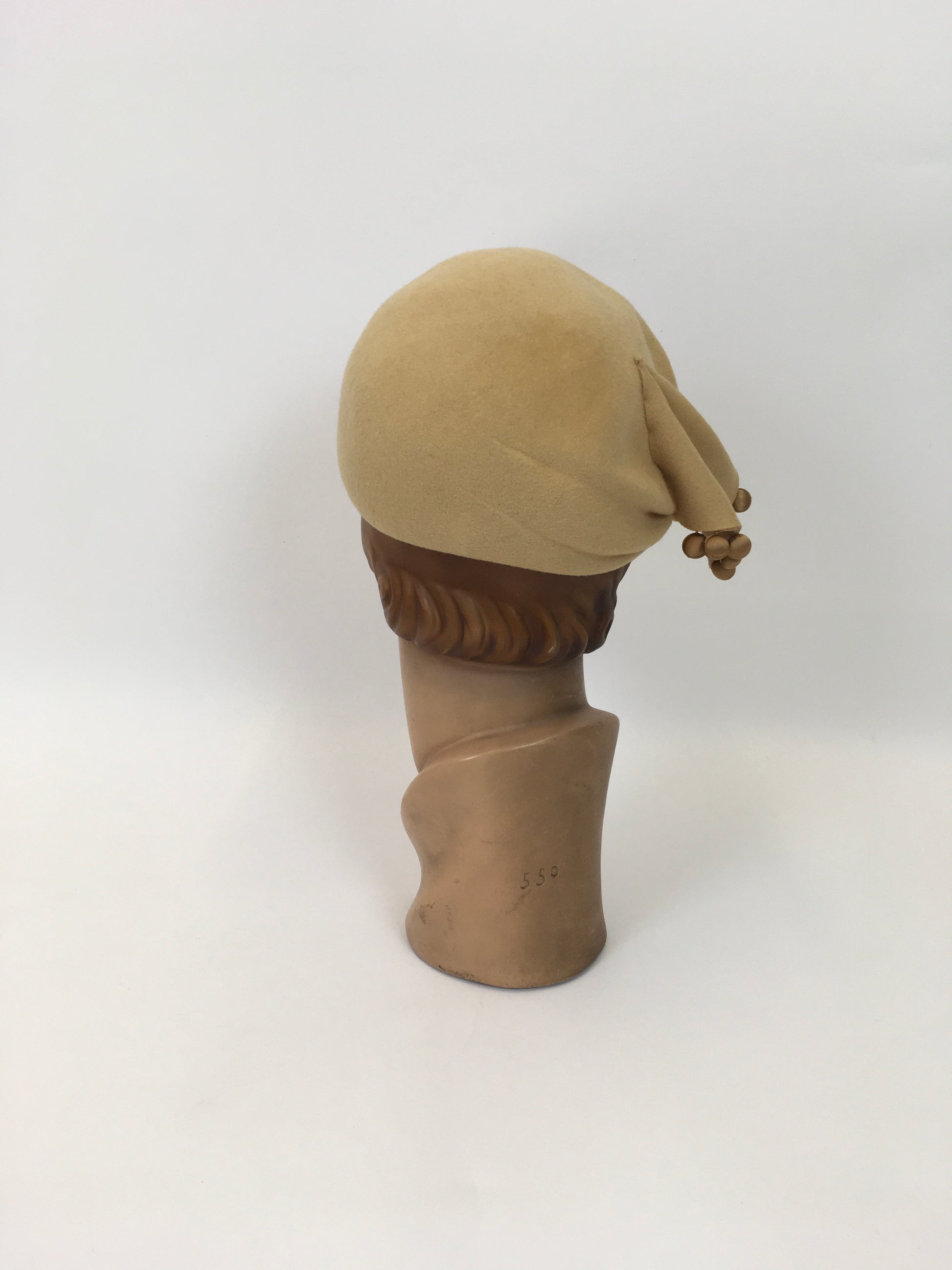 Vintage late 1940’s early 1950’s felt headpiece in a light mustard. This is a lovely stylised piece which is shaped and ruched to the side with pleating. It is adorned with satin gold bobbles which hang from its edge. This piece will look great worn with many outfits and different hairstyles. It’s stamped to its inner side with ‘ Henry Pollack’.