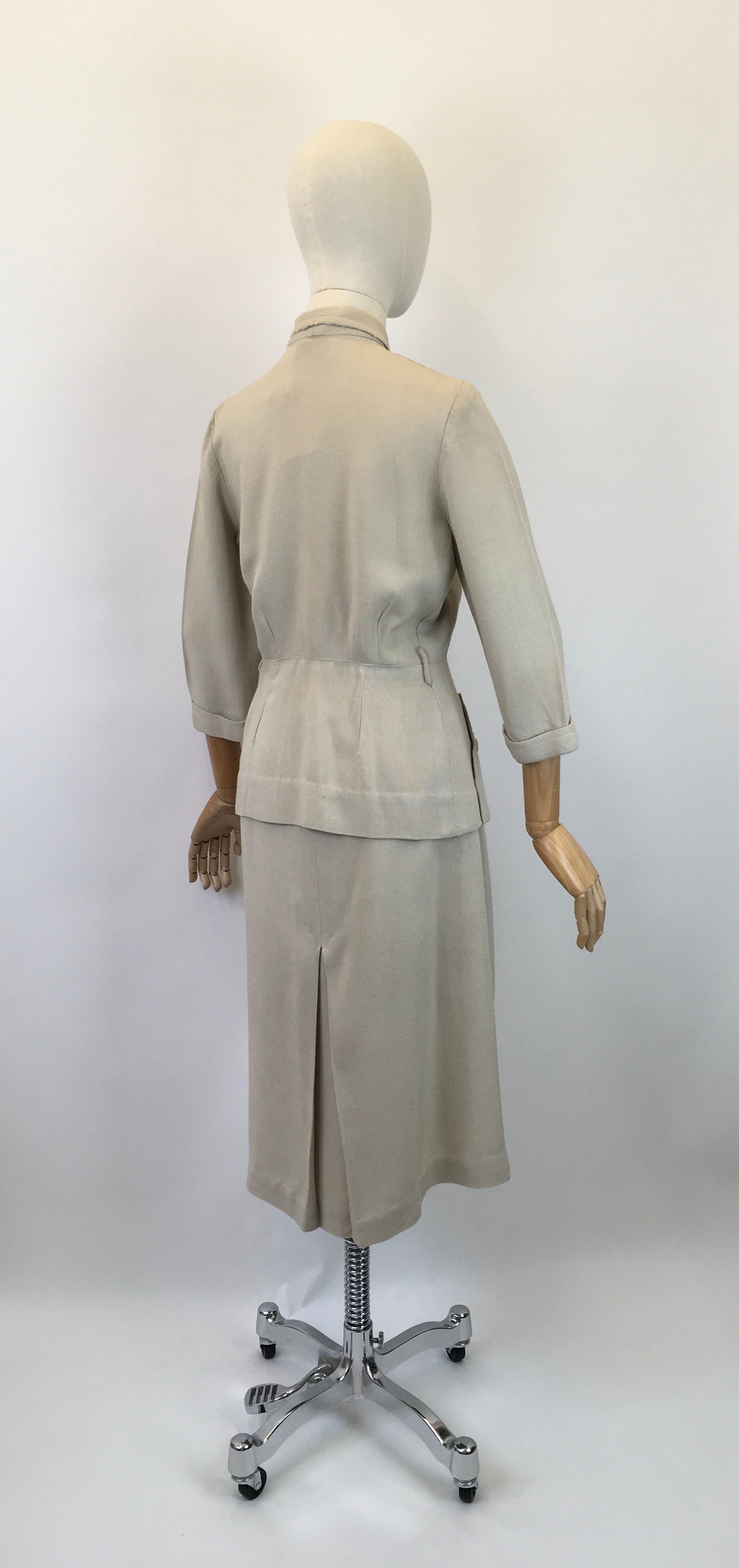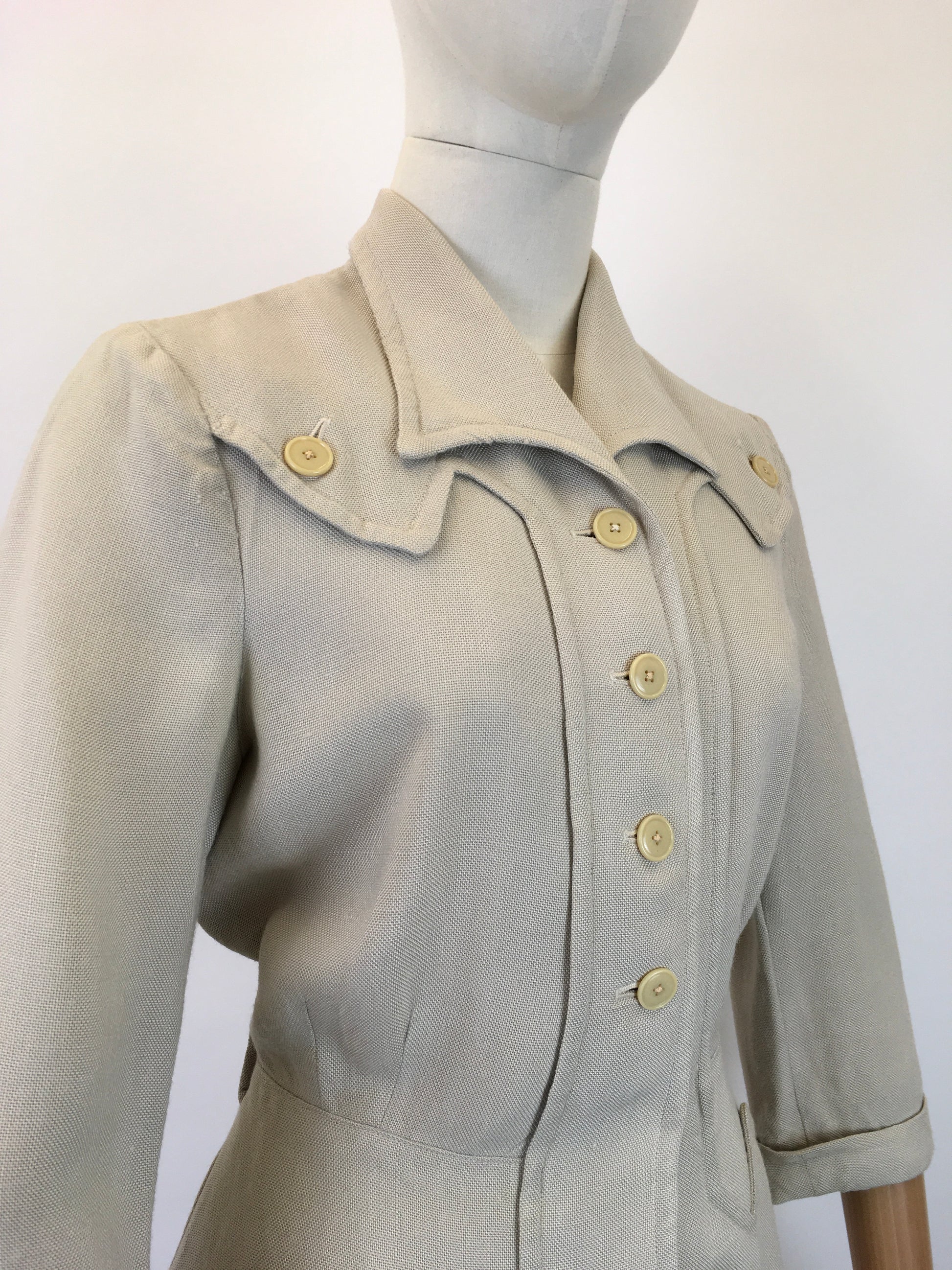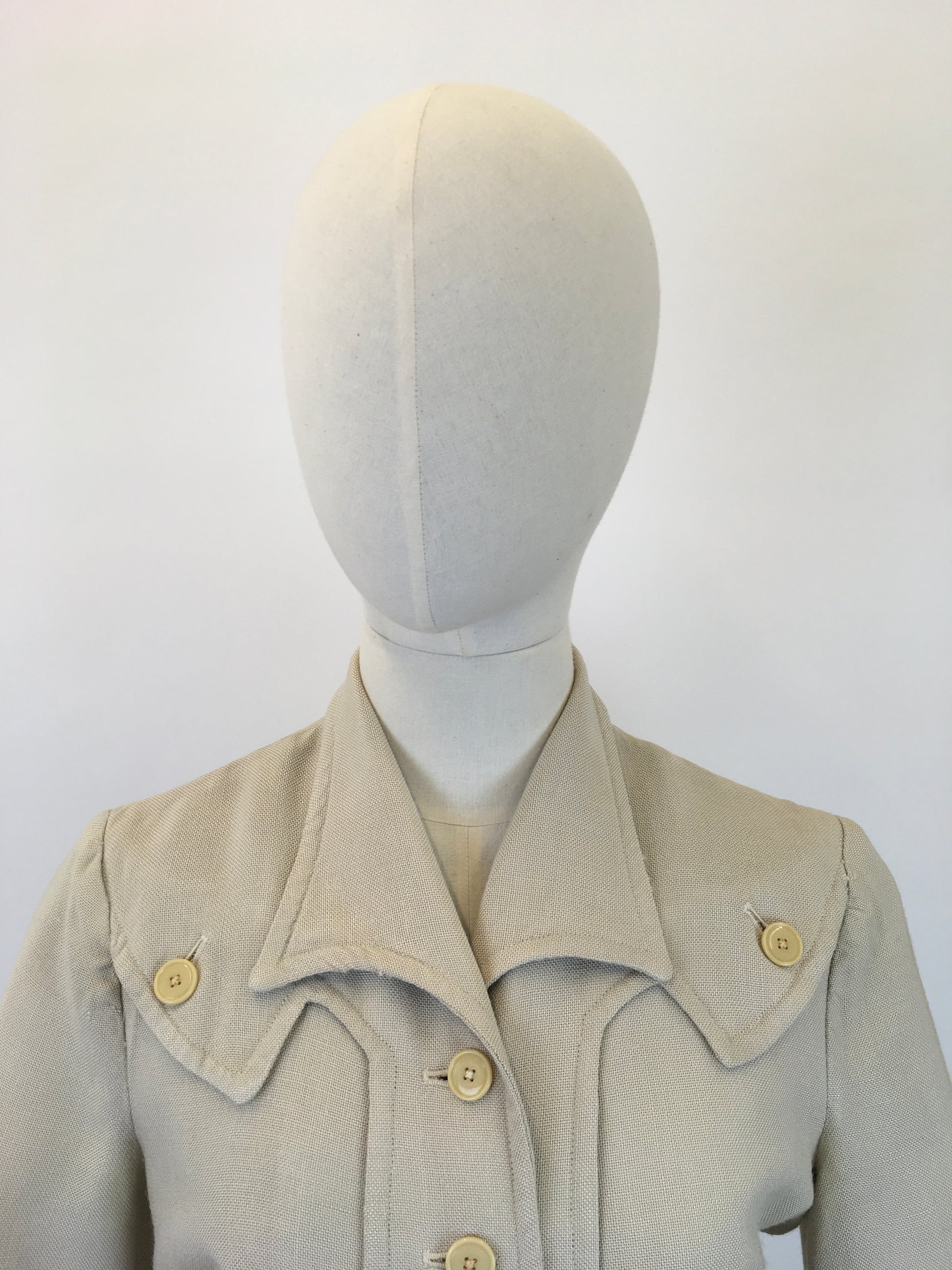 Vintage 1940’s sensational moygashal linen 2pc suit in soft cream made by ‘ Fashion Sport’. This set has such a classic 1940’s silhouette and the Jacket features amazing shaping and details. The jacket has built in shoulder pads to enhance the line, structured seamwork, button front fastening, pointed collar and  3/4 length sleeves with turn back cuffs. The skirt has box pleats to the hem and fastens with a metal side zip and hook and eye fastening.