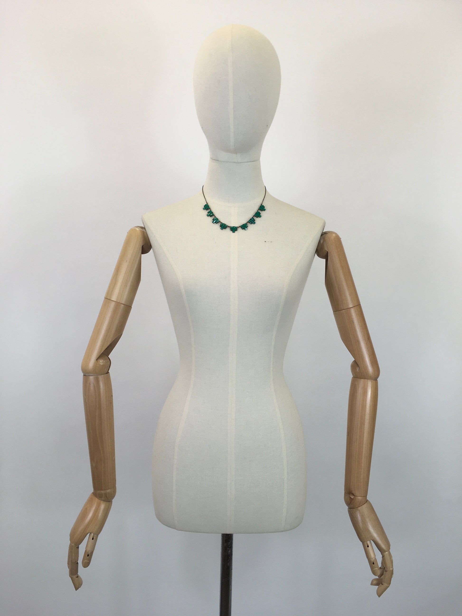 Vintage 1930’s Art Deco shaped necklace with jade green glass. This is a lovely piece from its time with a subtle nod to its Art Deco era with the shaping of the drops. The clasp is sturdy and strong.