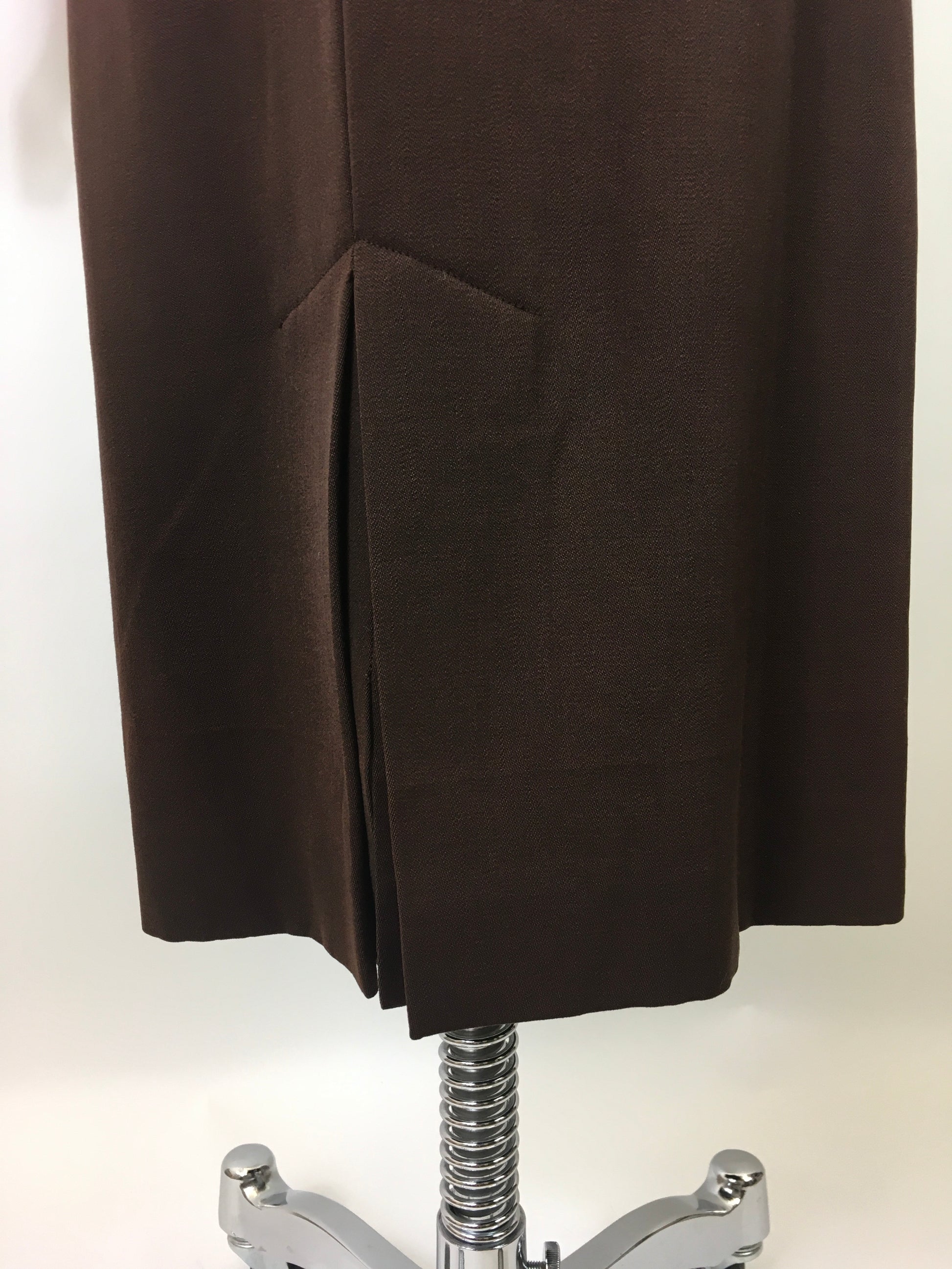 Vintage sensational 1940’s American 2pc suit by ‘ Betty Hill, California In a rich chocolate brown with stunning details. This 2pc showcases an excellent structure and epitomises 1940’s American Fashions of the time. The jacket features a shaped collar with stitched arrow detailing to its points, bound edged in a contrast stitch-work detailing which is mimicked in the pockets. It features a full length sleeve and fastens to the front with 3 chunky oranged buttons. The skirt creates a fabulous silhouette and is typically a line fastening with a metal side zip and top button. What is particularly interesting about the skirt is the double kick pleated detailing to its back hem. It creates a stunning movement to the skirt.