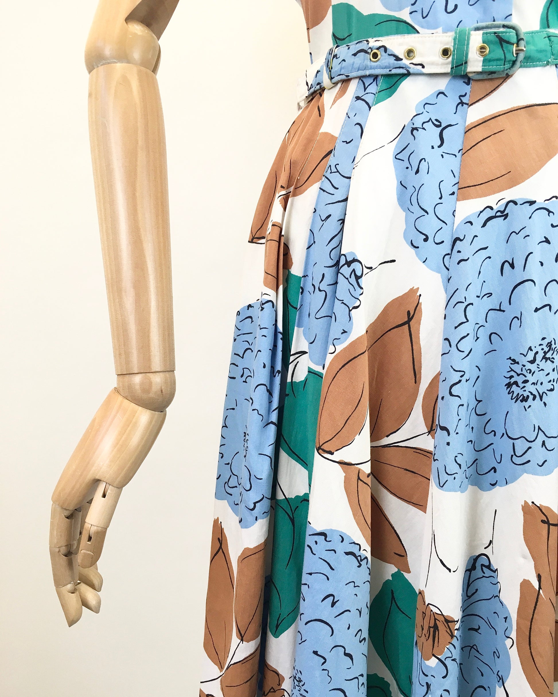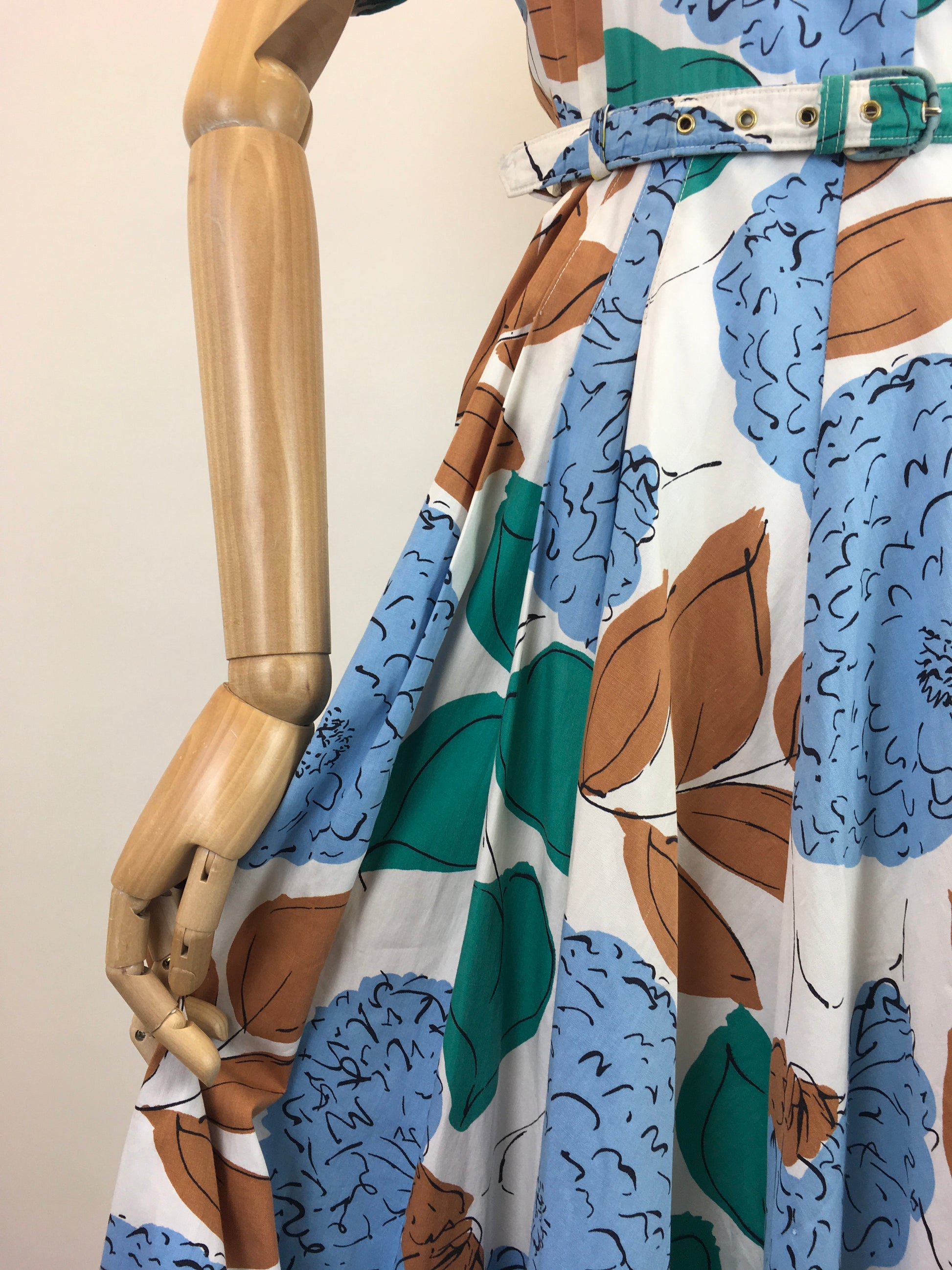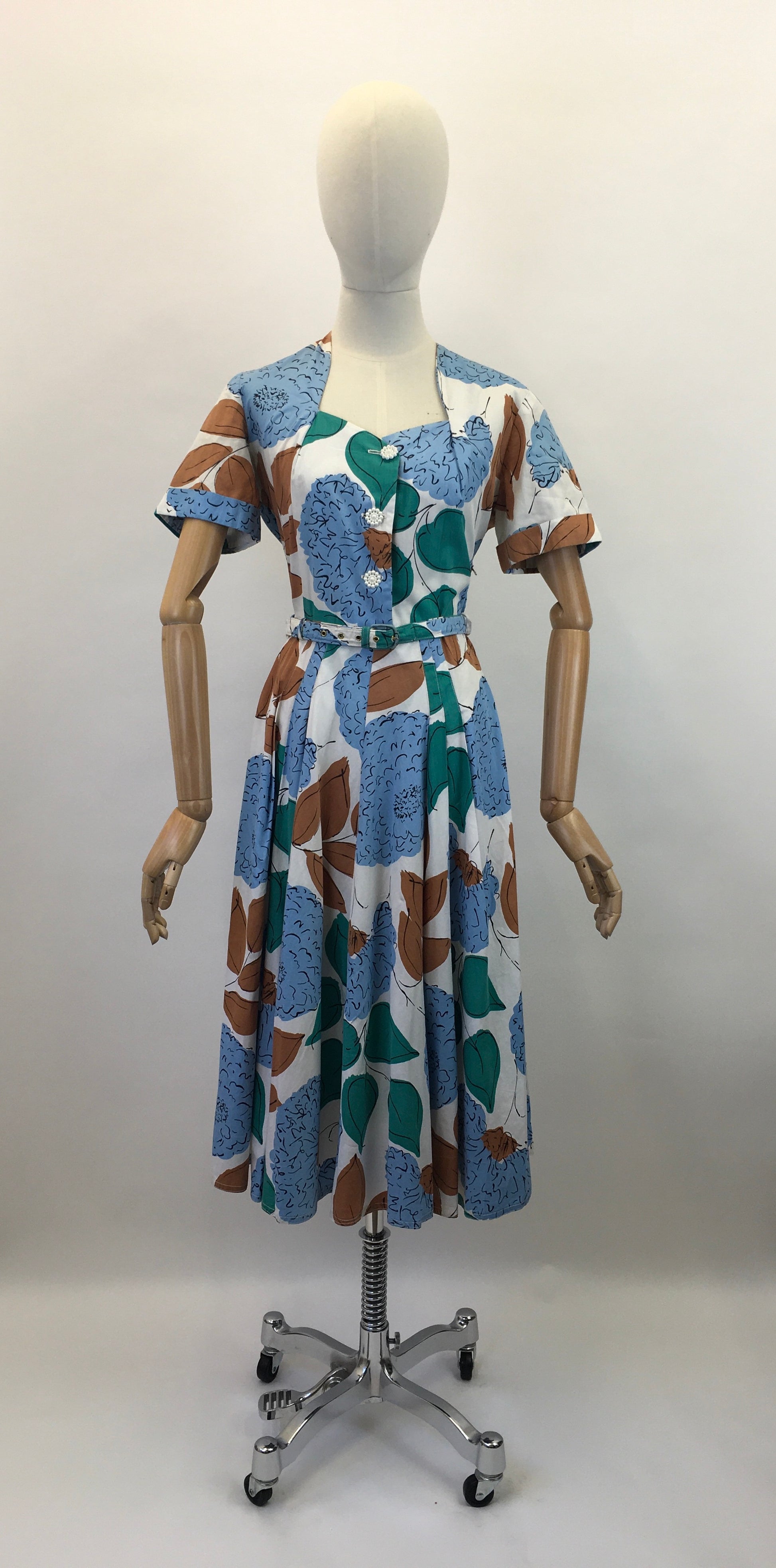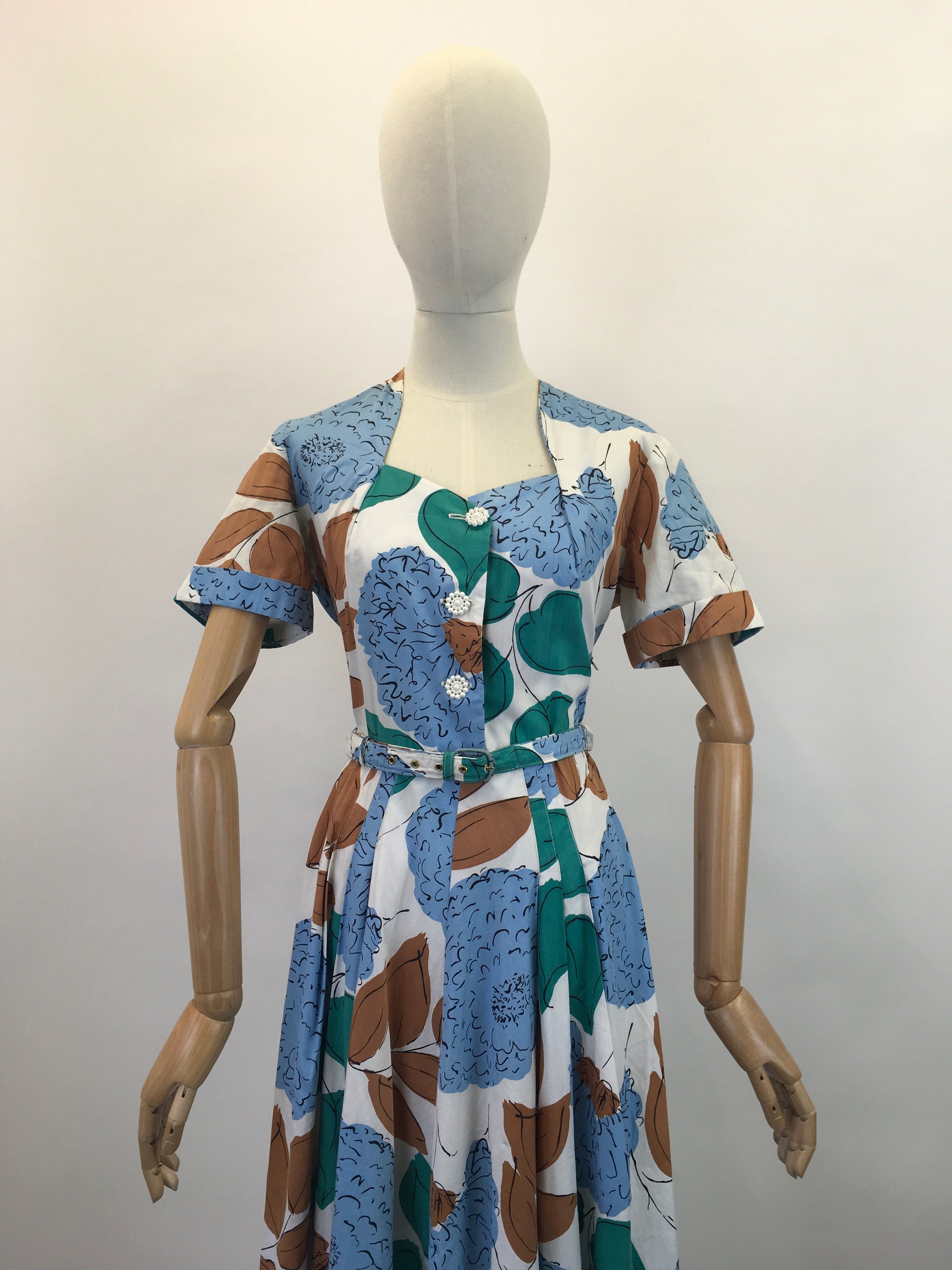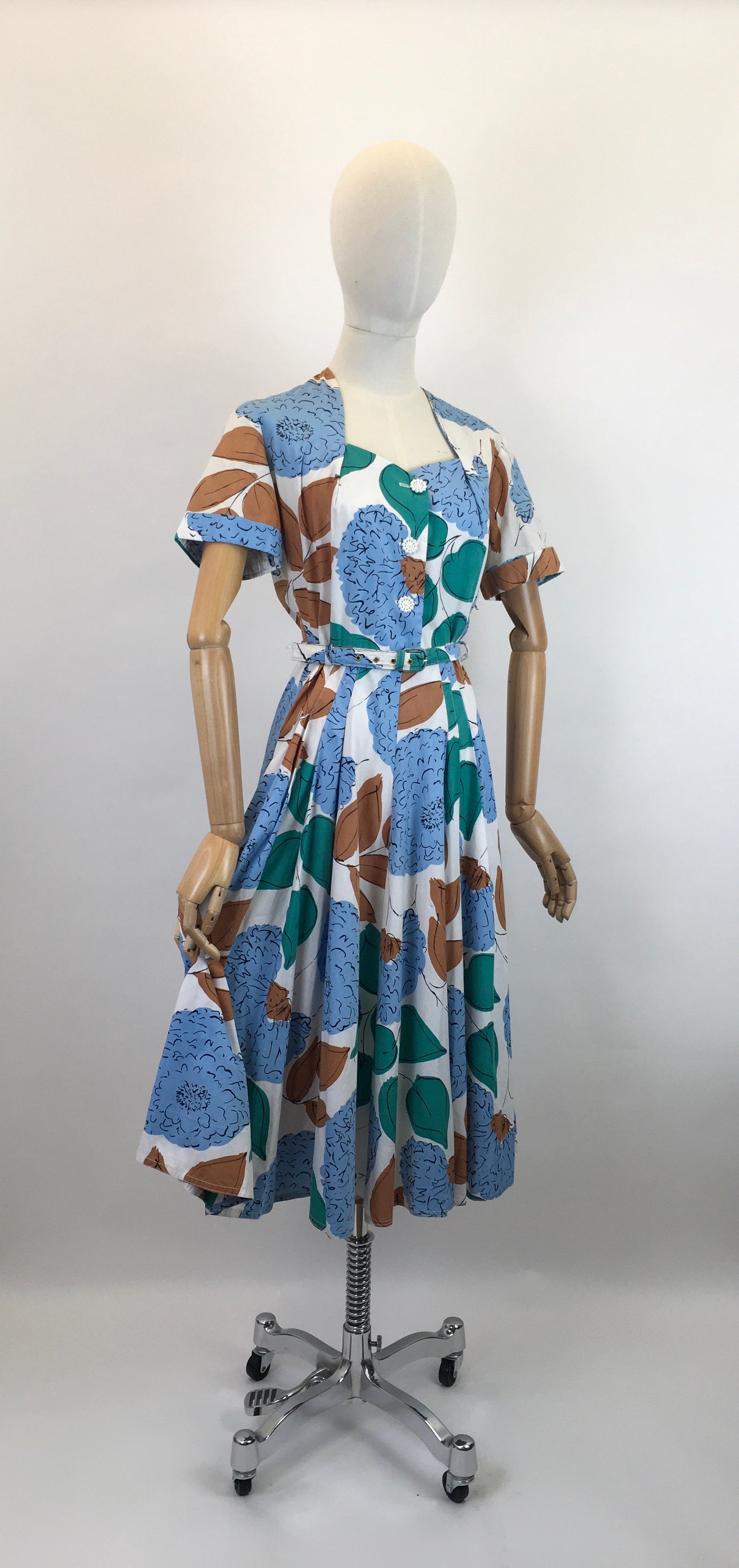 Vintage late 1940’s floral cotton day dress in airforce blue, caramel brown, emerald on a crisp off white. This piece has a lovely silhouette and features an almost sweetheart neckline, short sleeve with turn back cuff with floral button front fastening. It pulls in at the waist with its matching belt and falls into a very full circle skirt with slight pleated to the front adding further fullness. It also fastens with a side metal zip. This is a darling piece great for transitional seasons with layering and varying accessories.