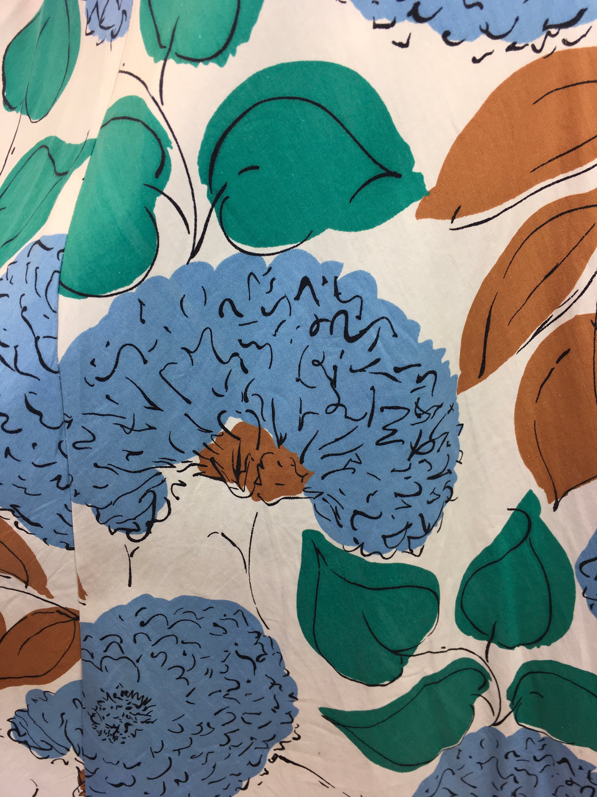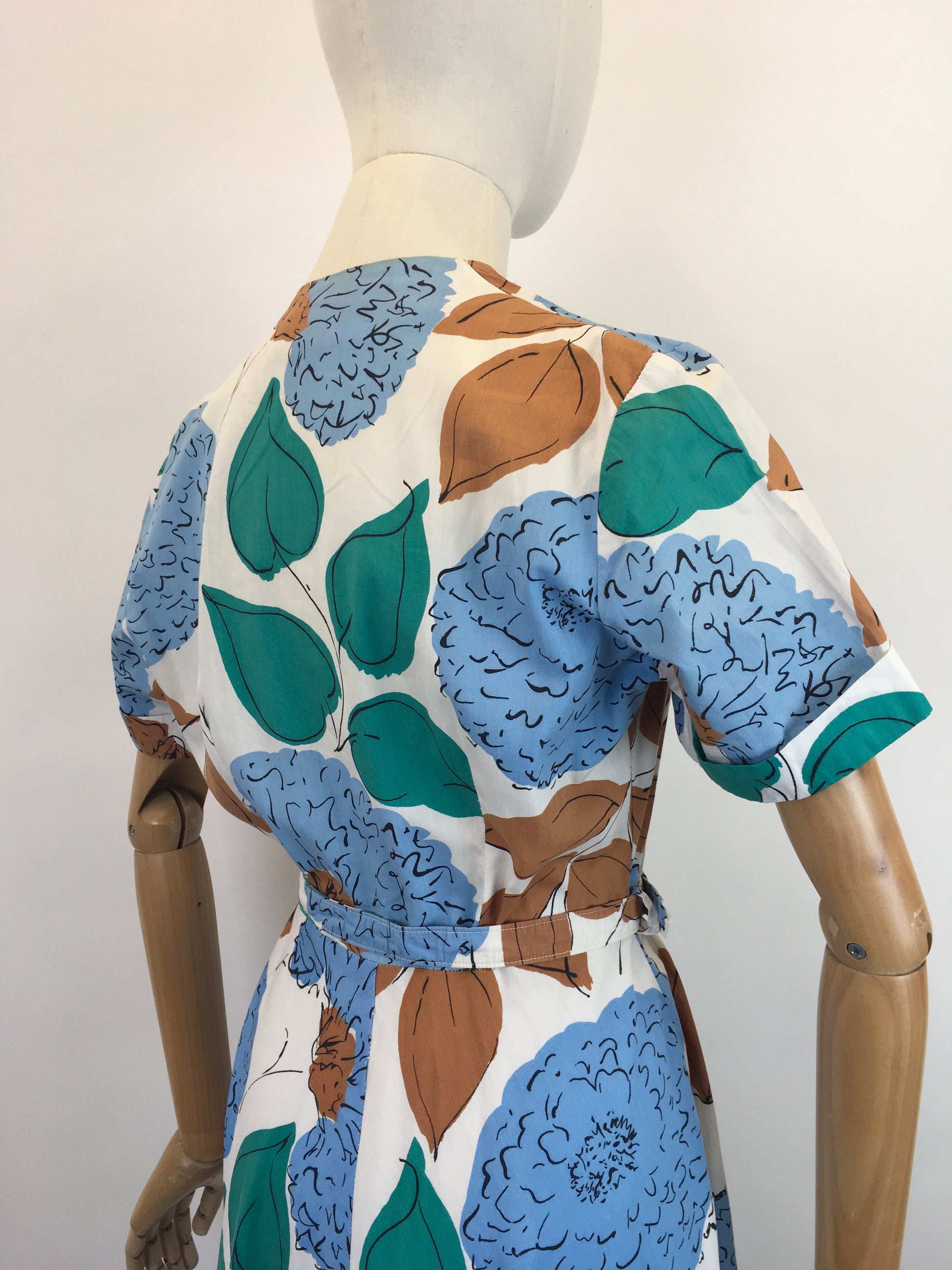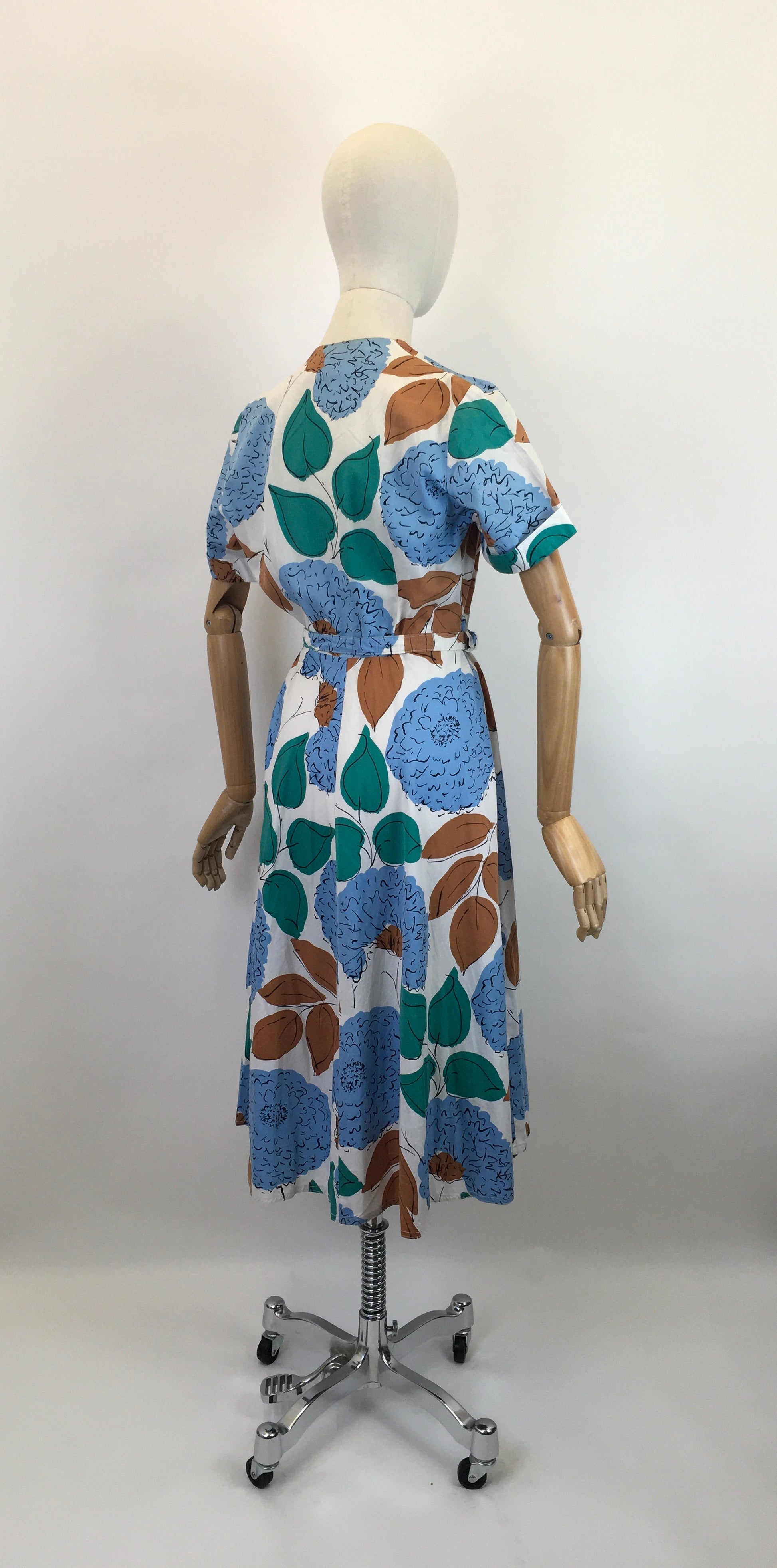 Original Late 1940’s Floral Cotton Day Dress - In Airforce Blue, Caramel Brown, Emerald on Crisp Off White