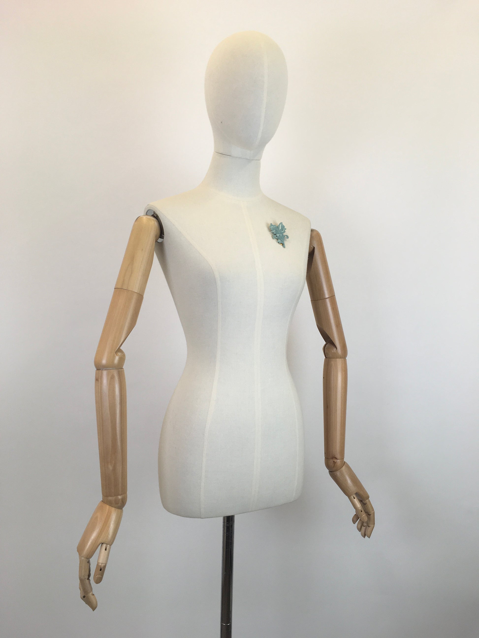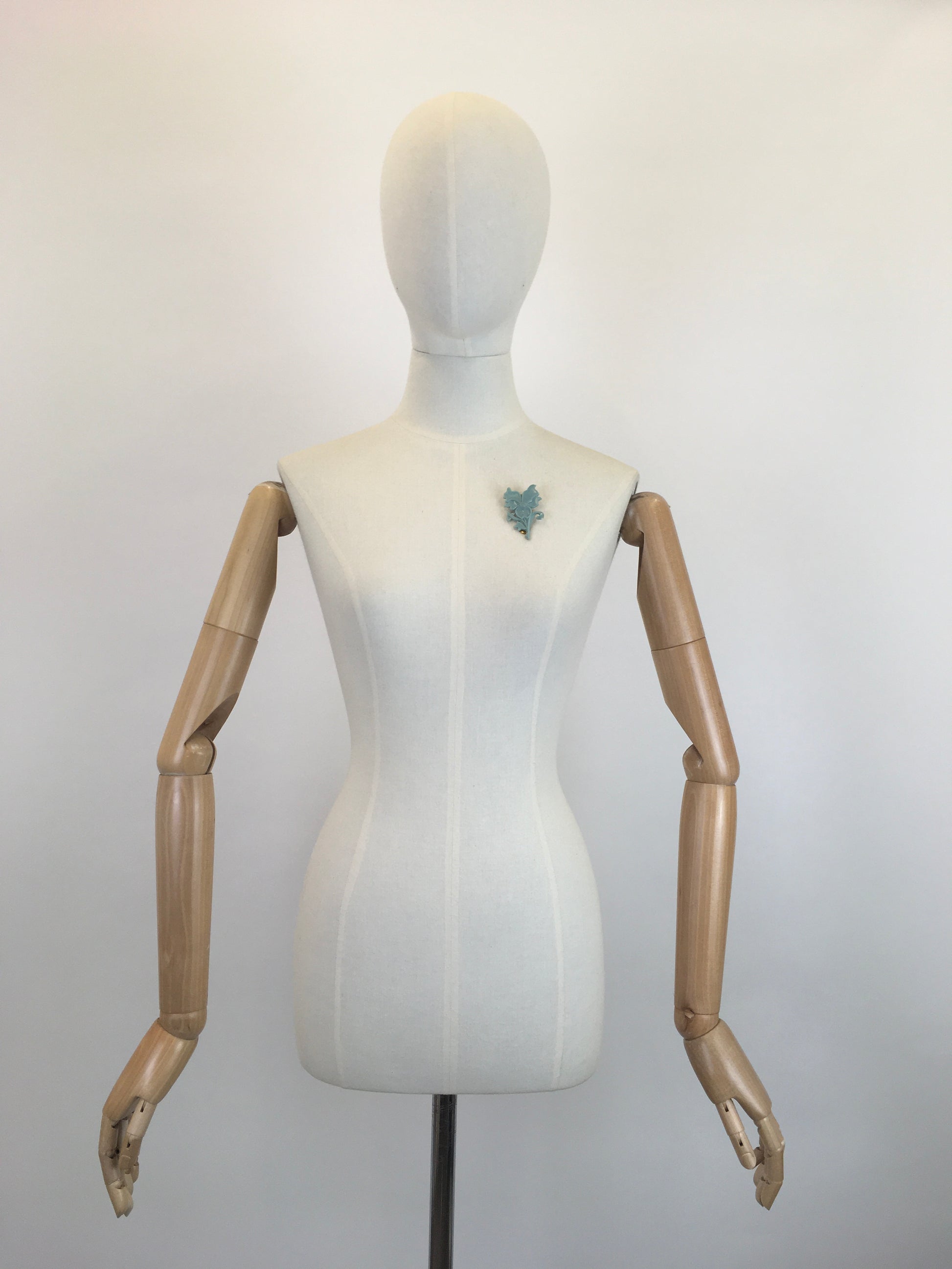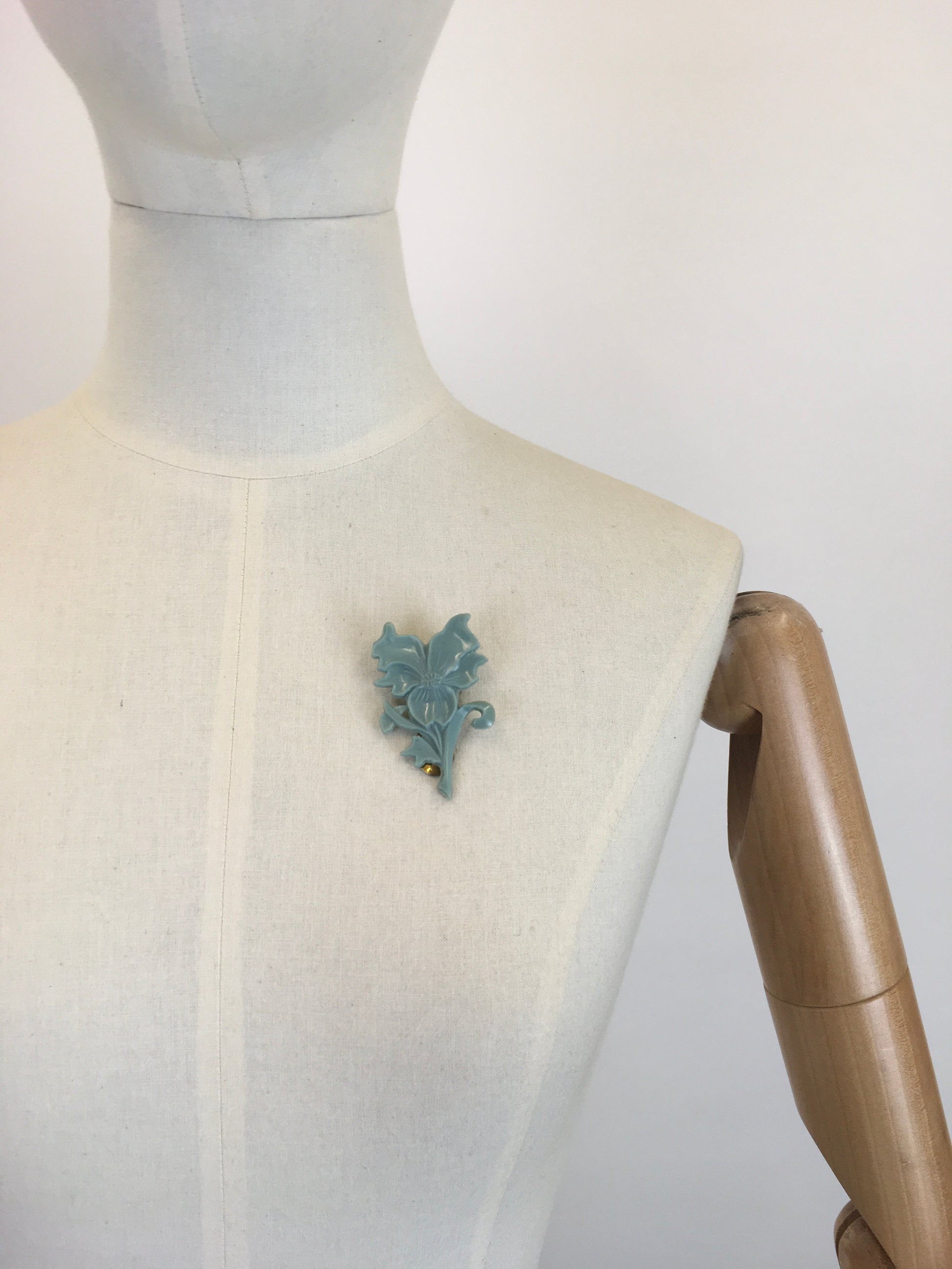 Vintage late 1930’s early 1940’s plastic floral dress clip In a divine pale duck egg blue. This lovely piece has a simple delicate elegance and looks beautiful clipped centrally to a dress or cardigan. It also look beautiful on a coat.