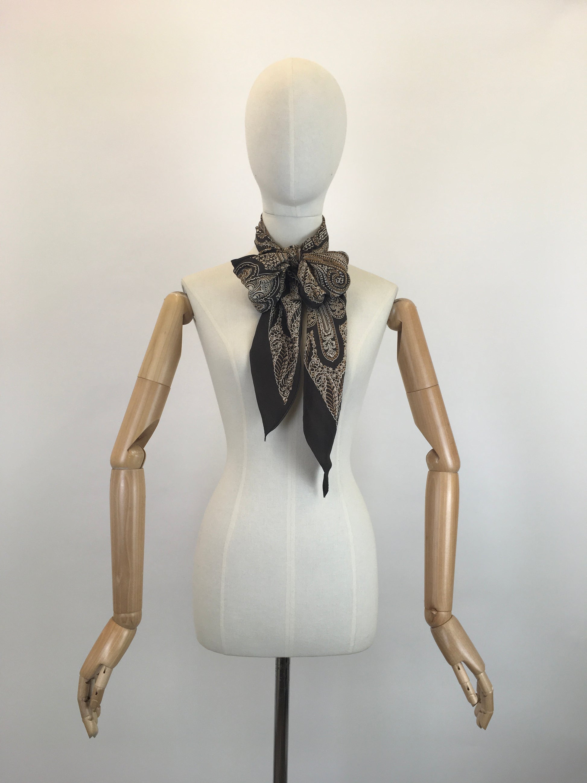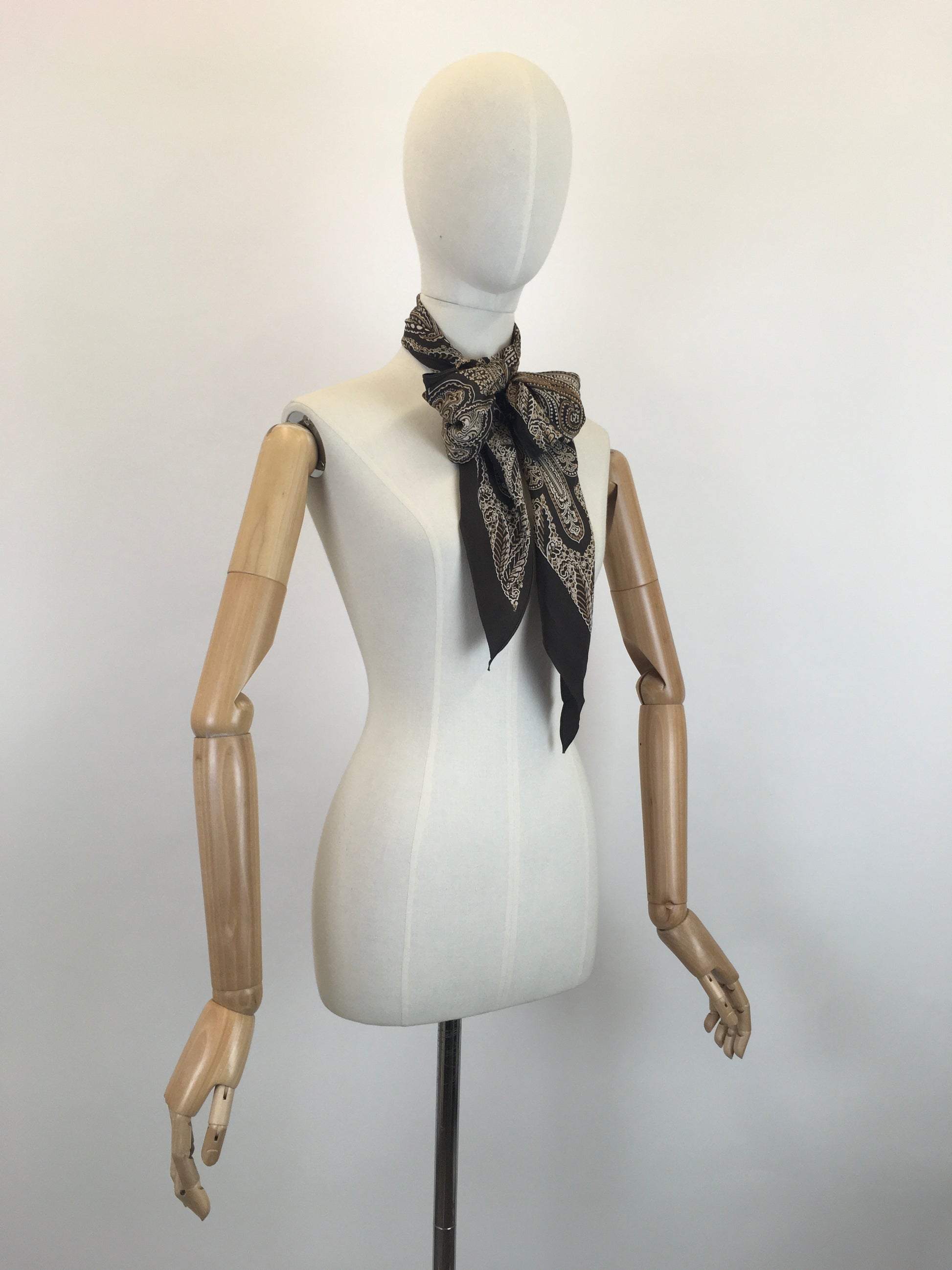 Vintage 1930’s stunning deco pointed scarf in warm browns, taupes and mushroom. Measuring 68’ x 11’ this piece is joyous and can be worn in multiple ways including round the neck, in a bow, in the hair or even styled as a belt. A stunning piece from this era which makes a lovely gift or treat to yourself.