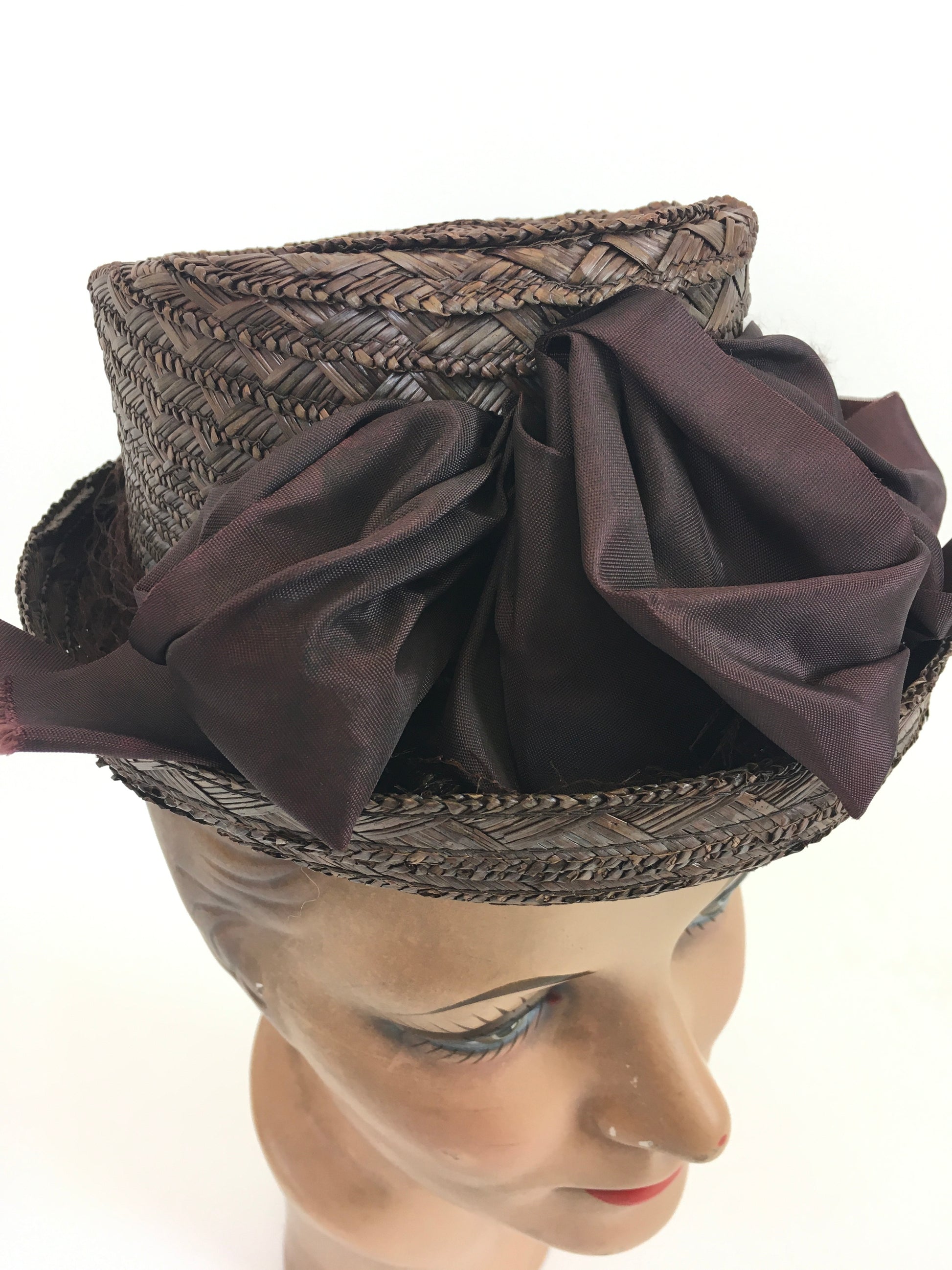 Vintage fabulous 1940’s American tilt topper hat in a warm chocolate brown. This is a great fun piece and sits on the head and can be worn tilted on angles for varying looks and hairstyles. It features a grosgrain bow and brown netted veiling. One Size , it can be pinned to the head or worn with elastic for ease of wearing and security.