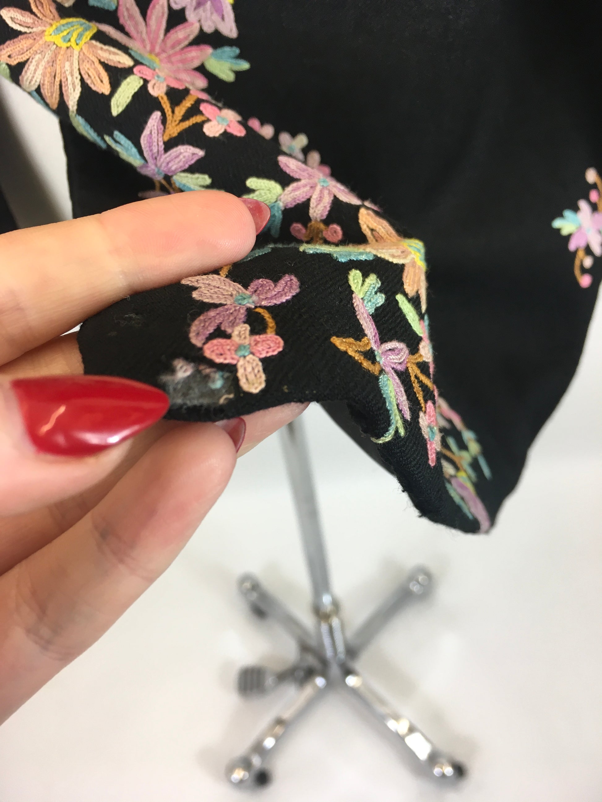 Vintage late 1930's early 1940's edge to edge jacket with exquisite embroidery details in soft pastels. This is a divine piece to add to any vintage wearer or collectors collection. It features a mandarin collar, full length sleeve, edge to edge bodice and can be worn simply over blouses and slacks, layered over suits or even worn in a modern style with t shirts and jeans. This piece is beautifully made and even features sewn in weights to the hemline. The embroidery detailing is exquisite and depicts trailing florals and leaves in shades of pastel blues, mints, pinks, lilacs and fawns. Whilst currently there are no shoulder pads, some could be sewn in to accentuate the shape if desired.