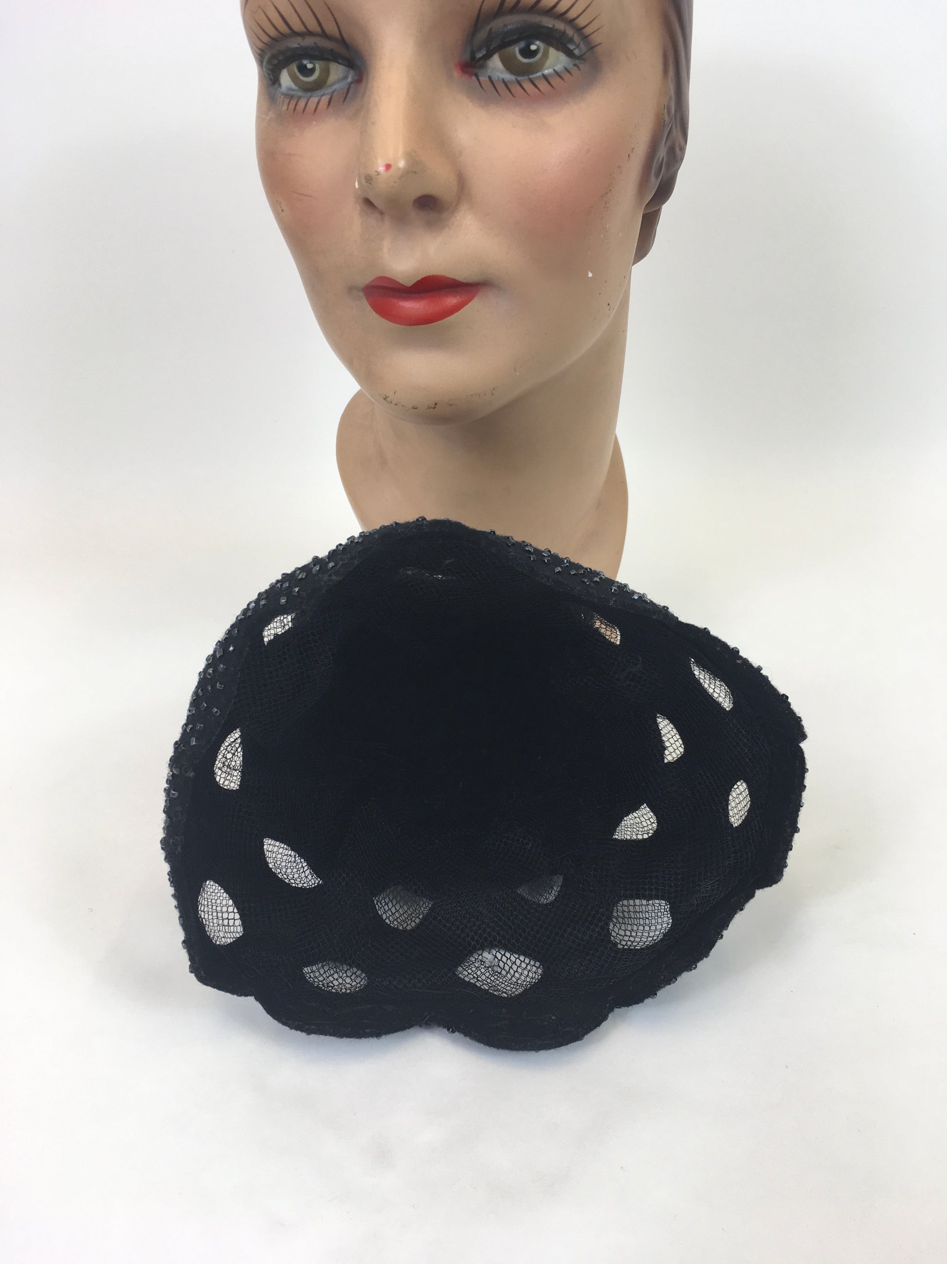 Original 1950's Fabulous Black Tilt hat - With Bugle Bead, Ric Rac and Netting Embellishment