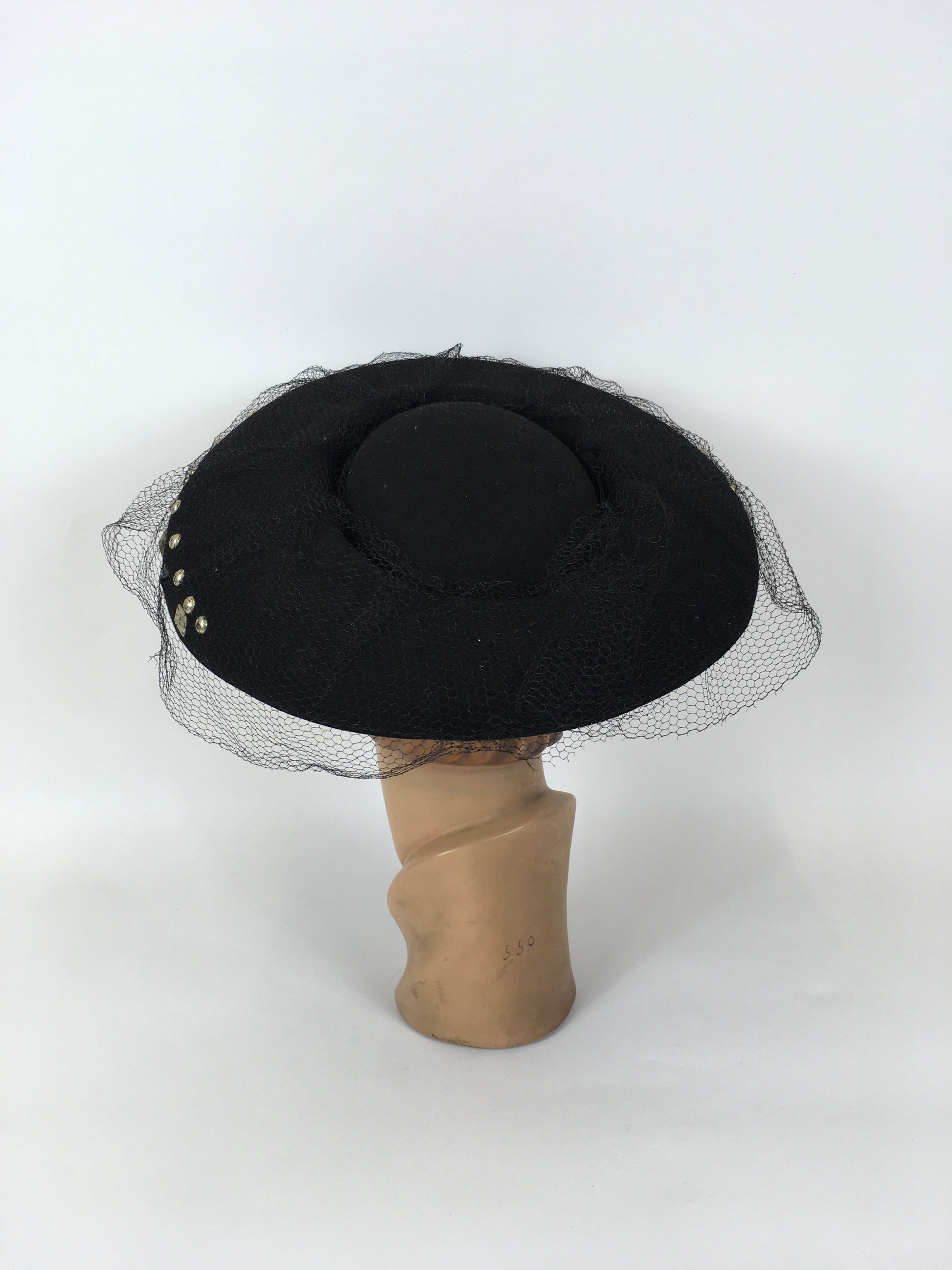 Original 1940’s SHOWSTOPPING Black Platter Hat - With Coloured Stud Work Detailing & Veiling