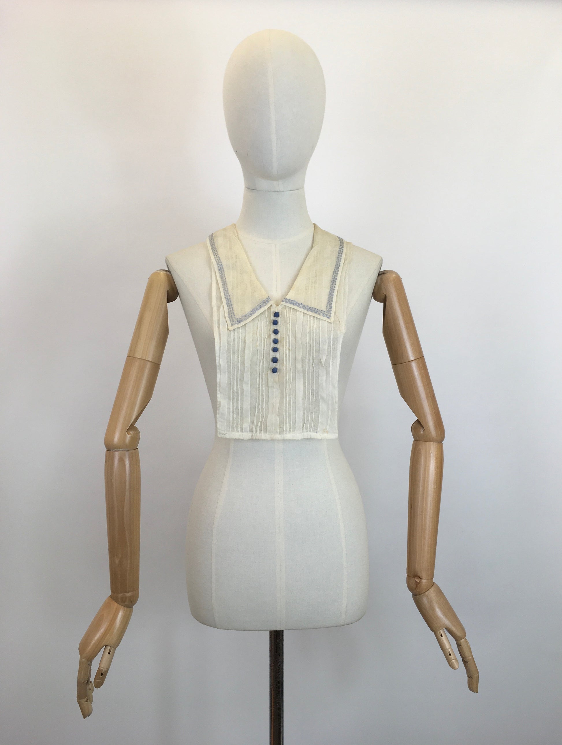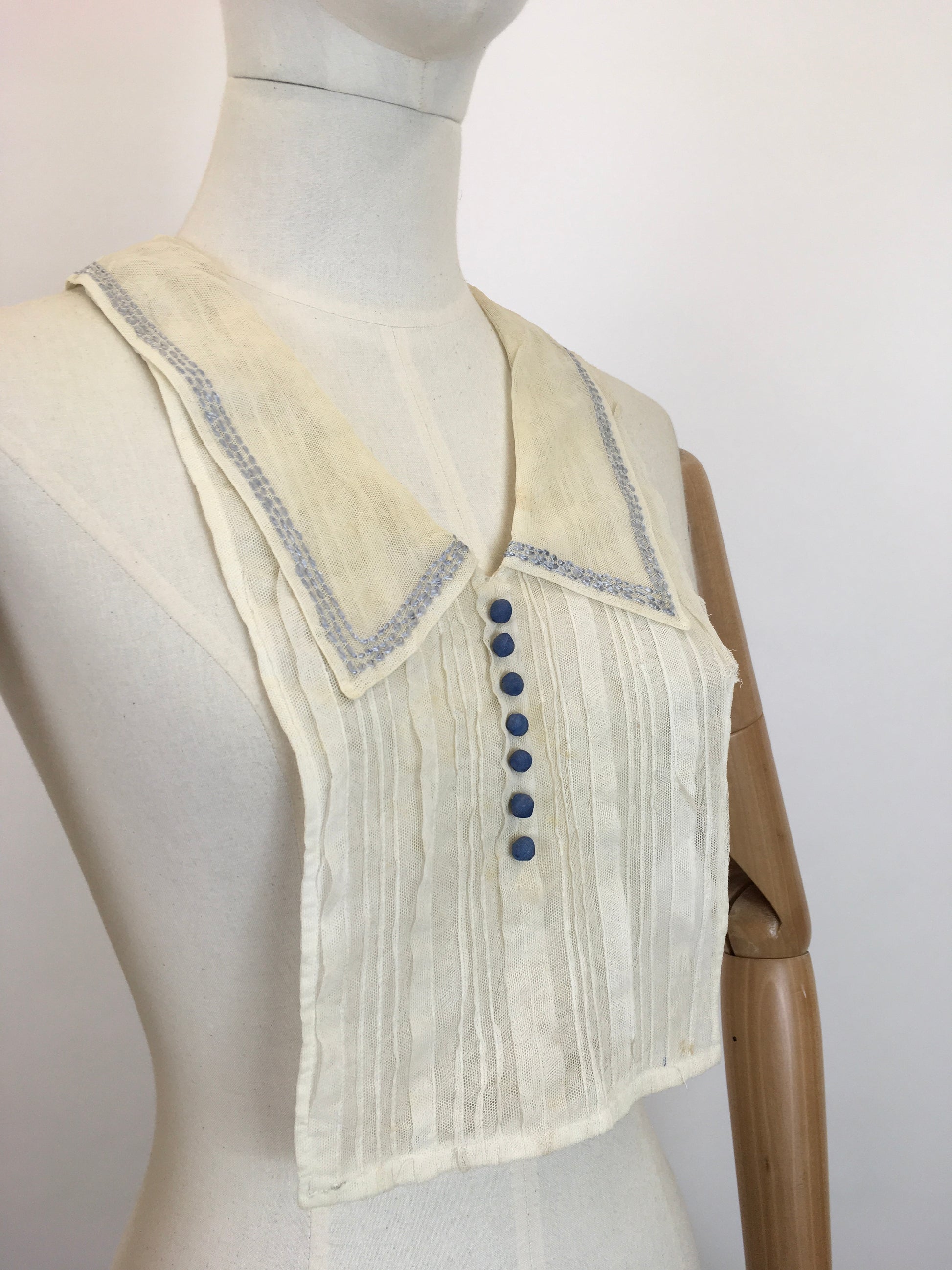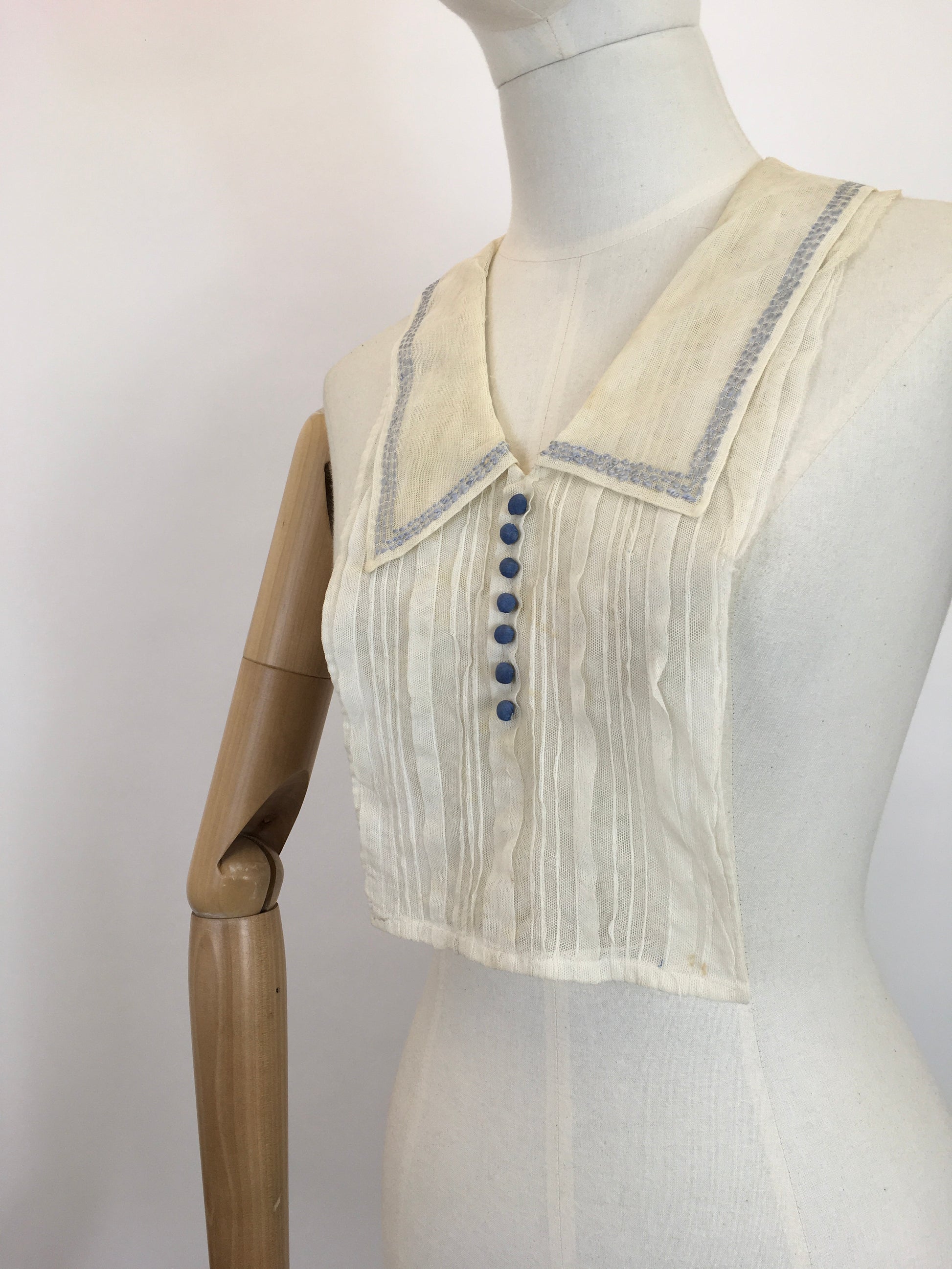 Vintage 1910/ 1920's stunning fine collar with front panel and exquisite embroidery. This piece is a lovely example from its time and features a round the neck sharp pointed collar and front bib panel, made from a fine sheer net with stunning embroidery in powder blue with 7 matching buttons to the bib front. These are great for wearing with dresses that need an extra detailing.