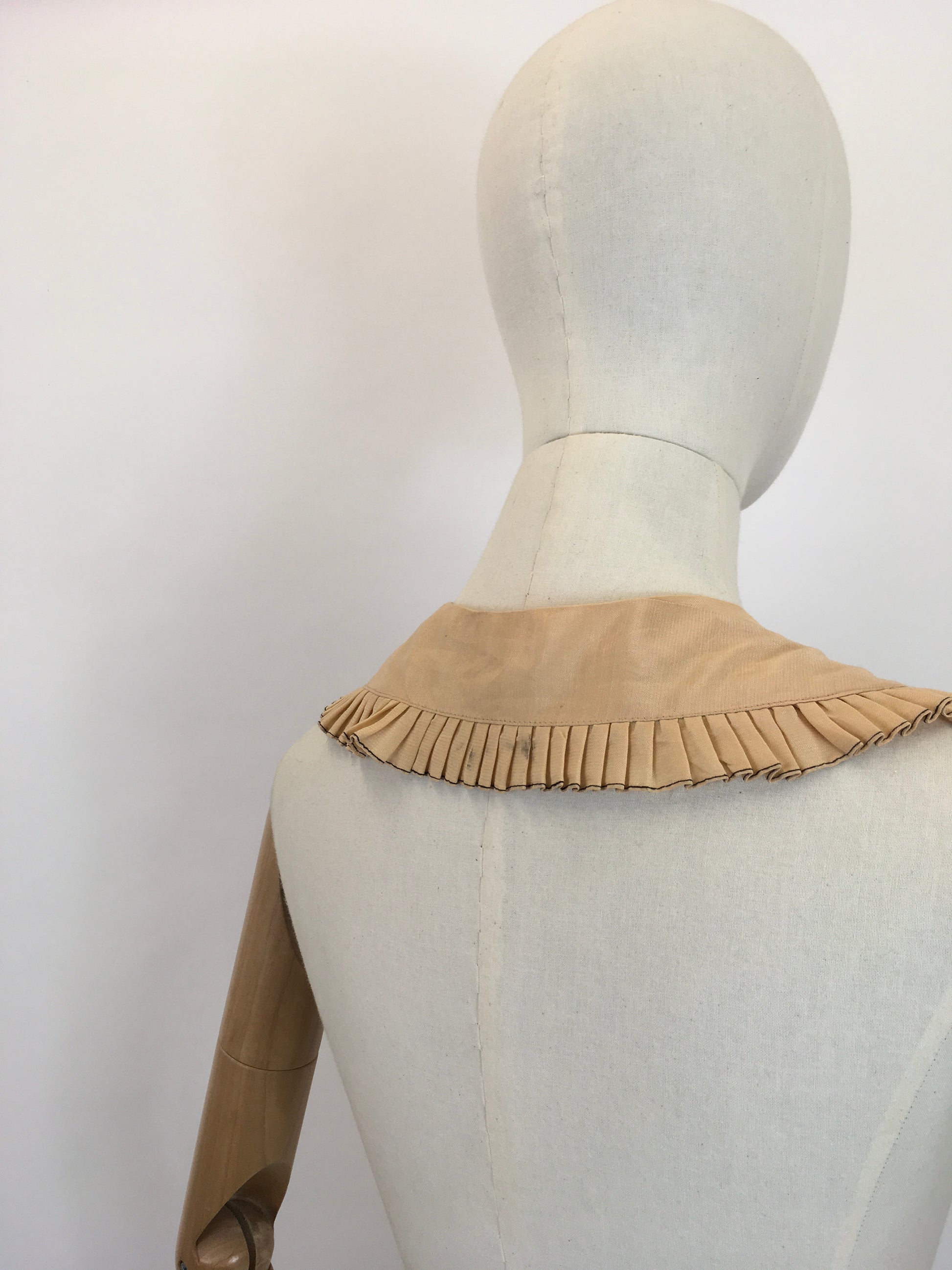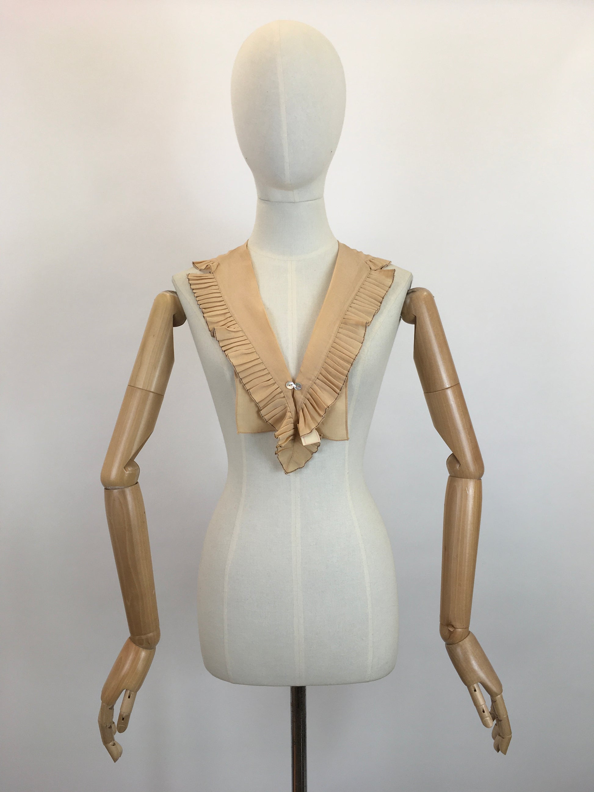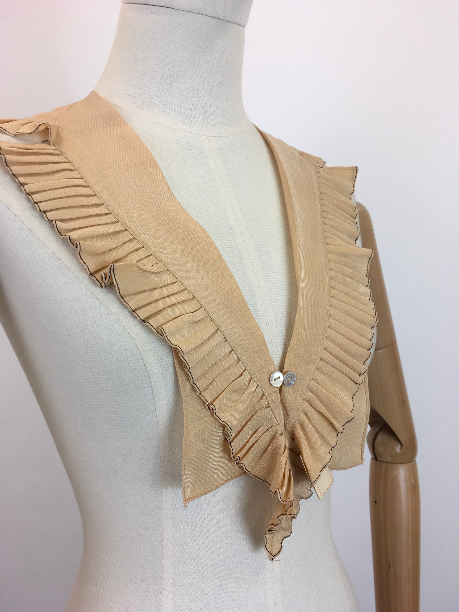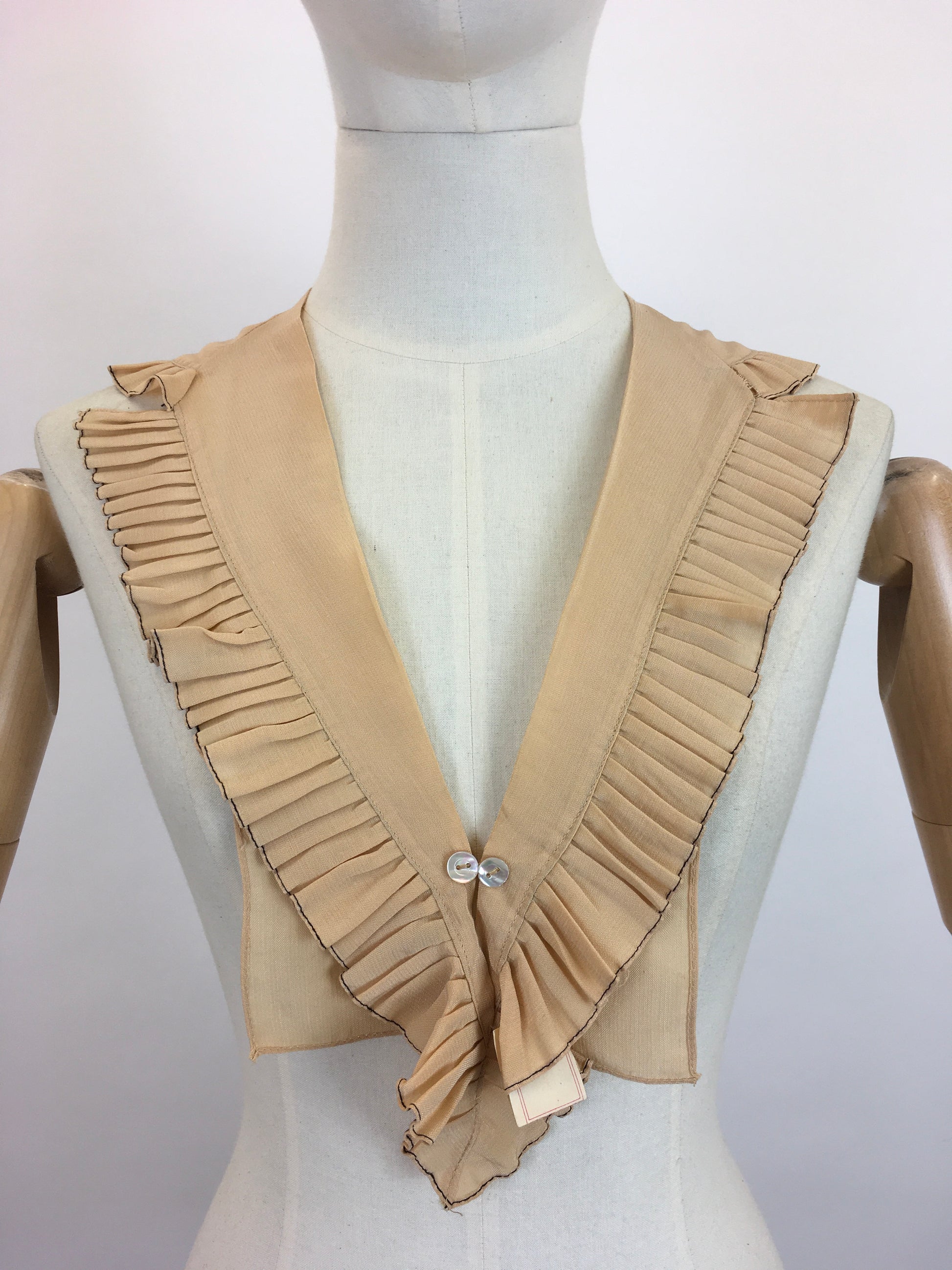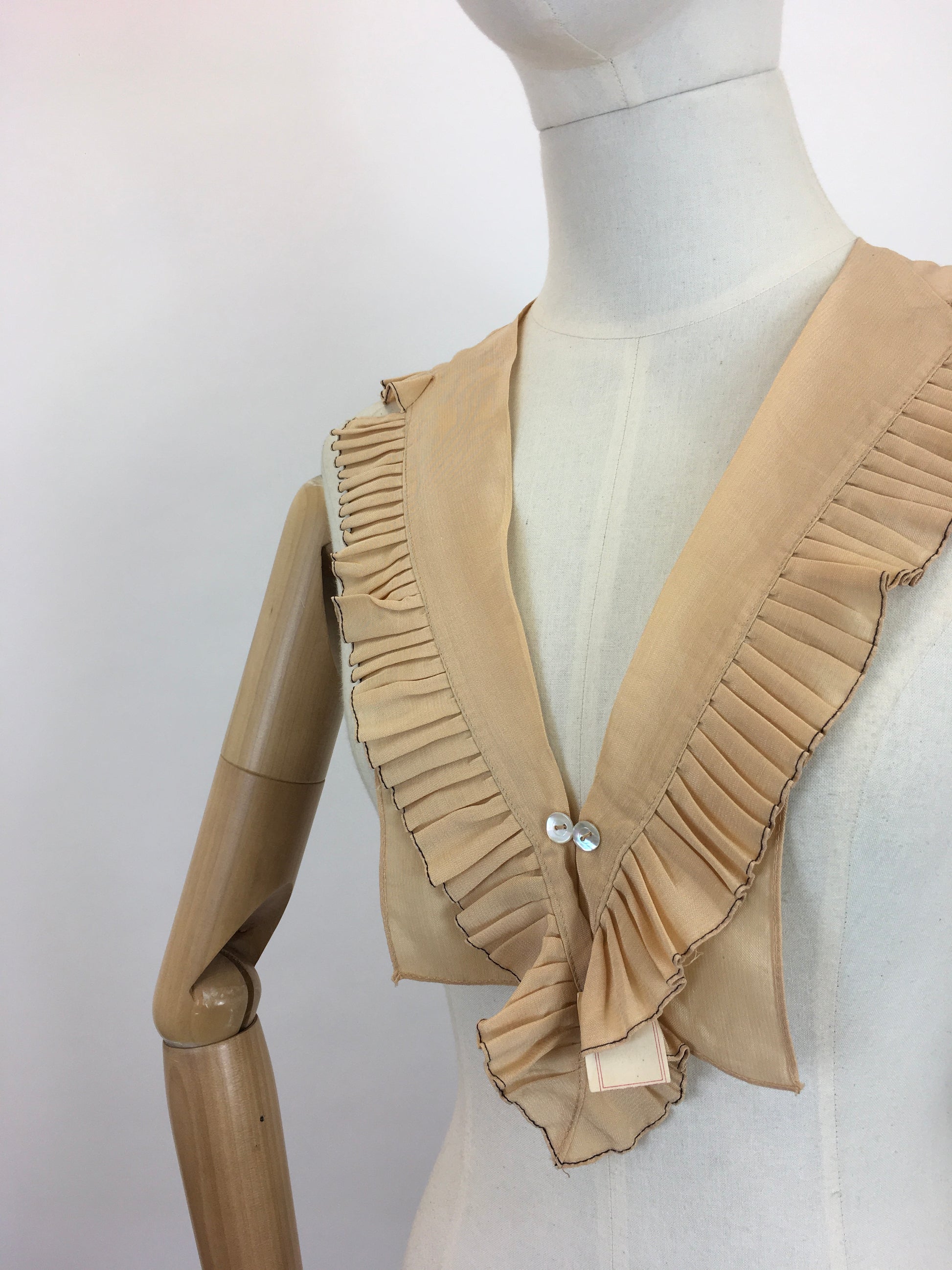 Vintage 1920's / 1930's fabulous DEADSTOCK jabot collar with pleated ruffled edge in a peachy fawn. This is a beautiful example from the period and great that its never been previously worn. It still has its original paper label attached to the hem. This piece will look great worn under dresses, incorporated into dresses and under suits.