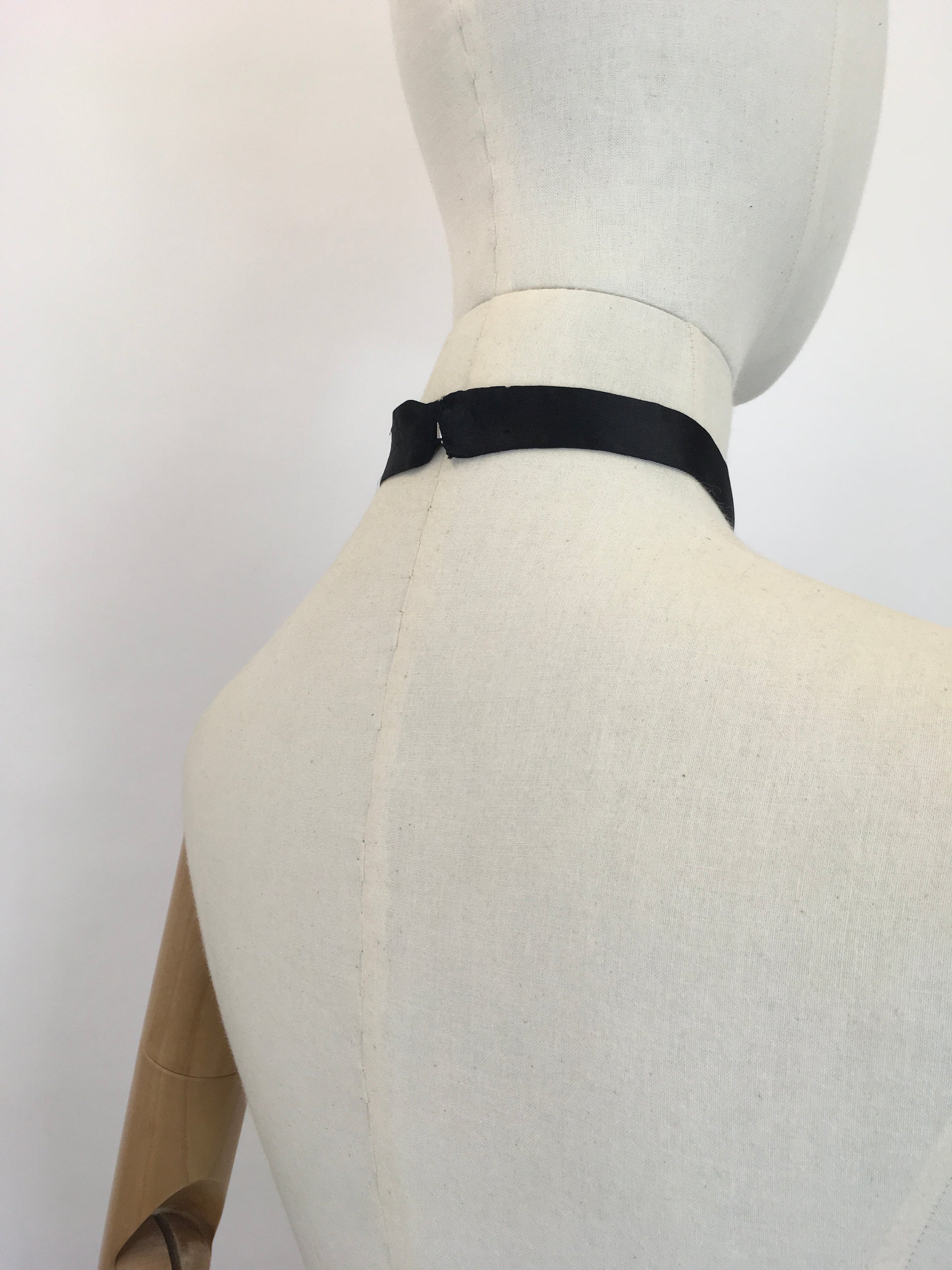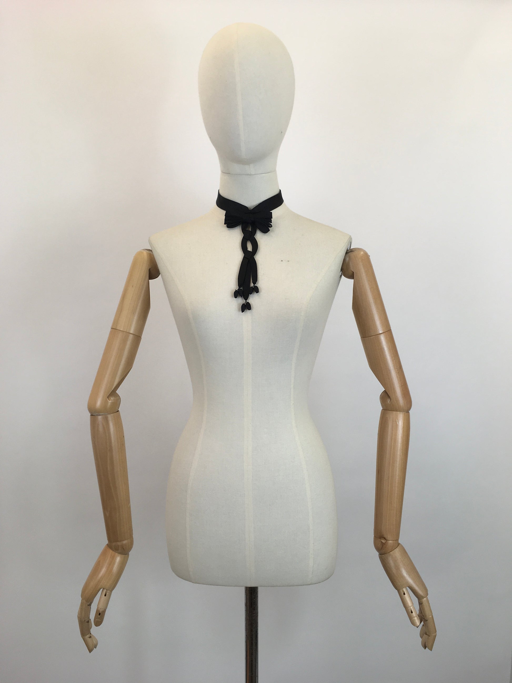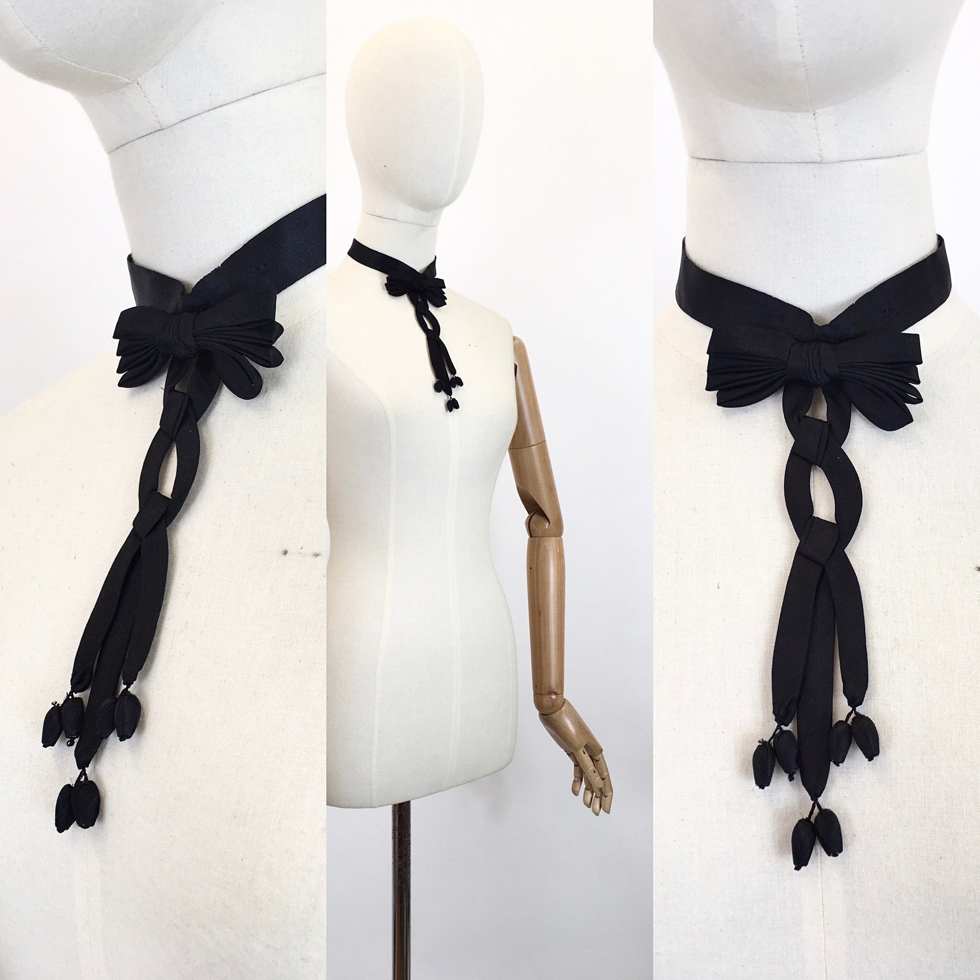 Vintage 1930's sublime choker silk adornment in a rich black. This is a beautiful example from its time and has such exquisite detailing. It features a simple band construction which fastens with a deep metal hook and eye to the nape of the neck. To its front it has a little bow with pleated details which falls into a plaited section with tassels. A great addition to wear around the neck to enhance detailing to a blouse or dress. A beautiful addition to any 30's or deco lovers haberdashery and accessory stash.