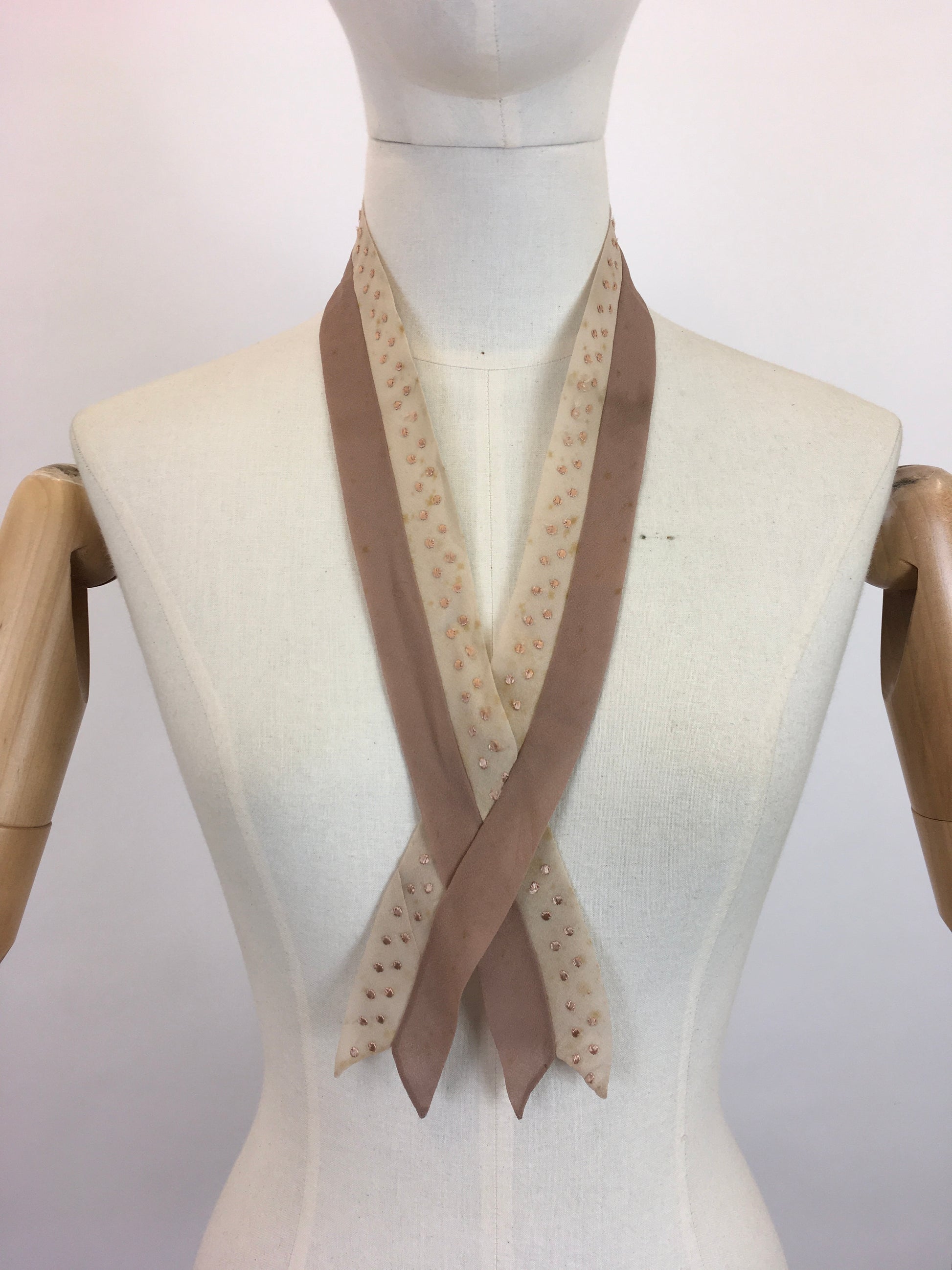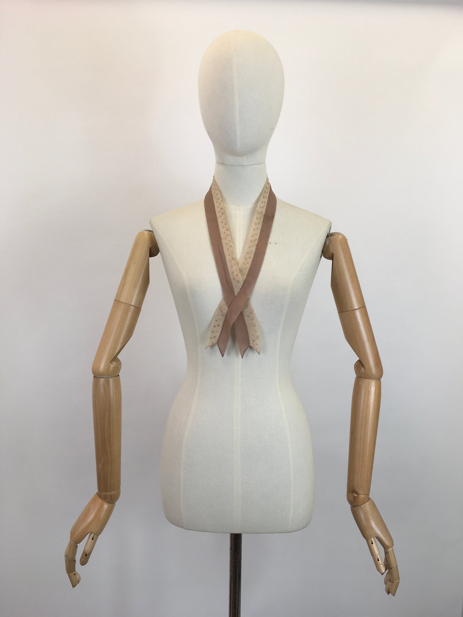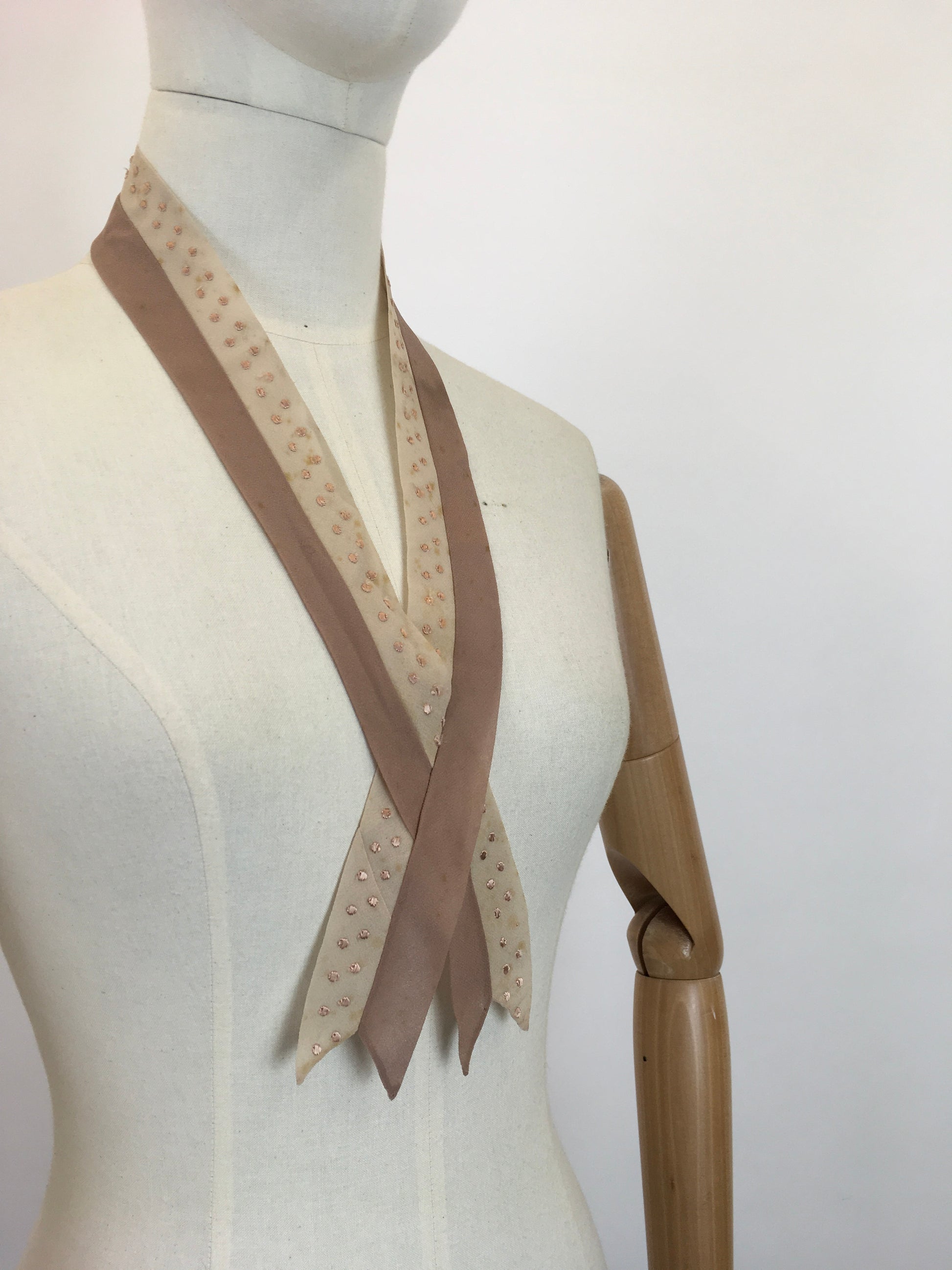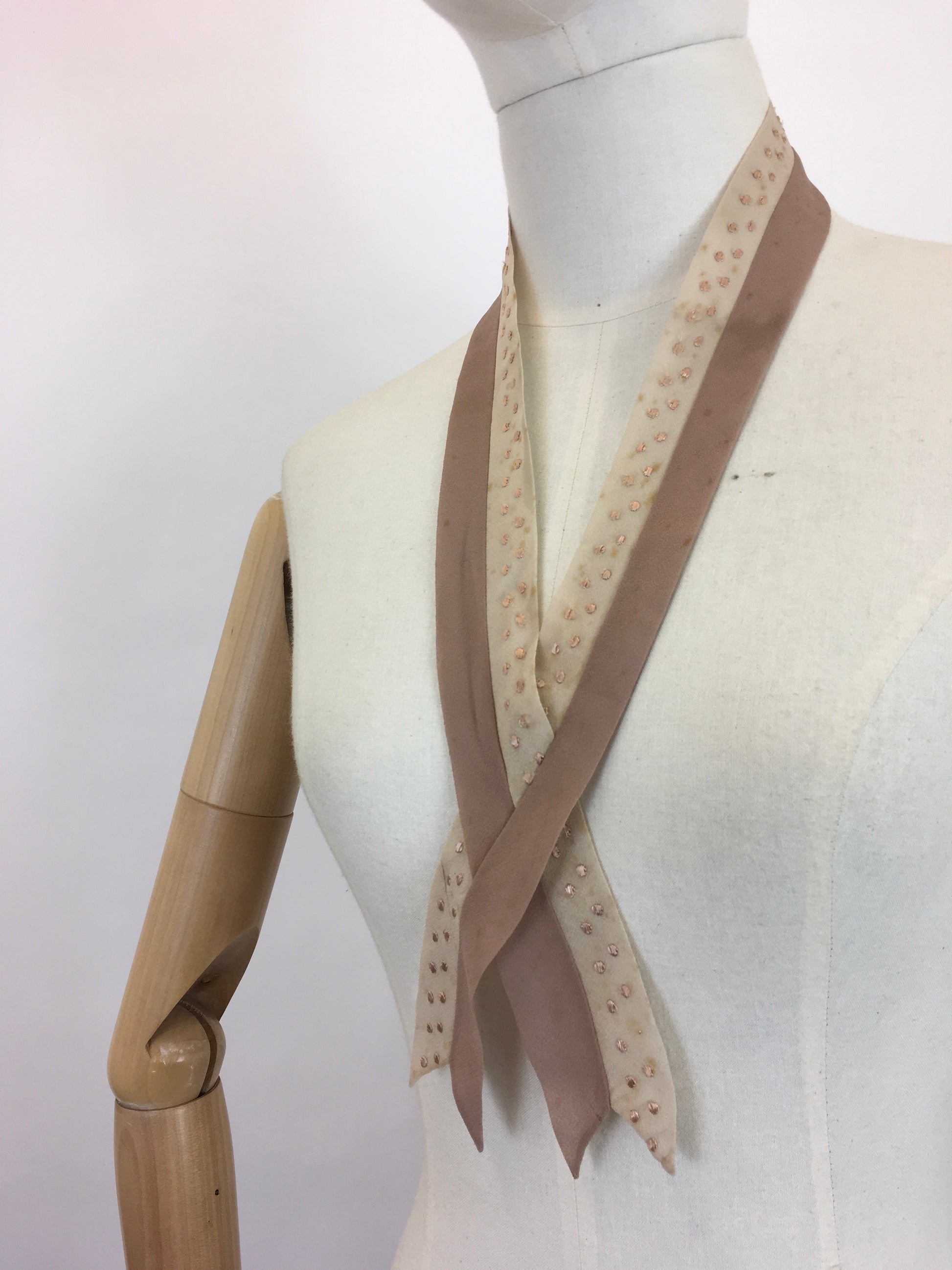 Vintage 1930's darling double chiffon collar in soft fawn and cream with dot embroidery. This piece is so of its time and showcases the simplistic but chic styling of the era. Its designed to sit around the neck to add framework detailing to blouses, dress or even lightweight summer coats. A beautiful example from the period. A lovely addition to any 30's wearers accessory and haberdashery stash.