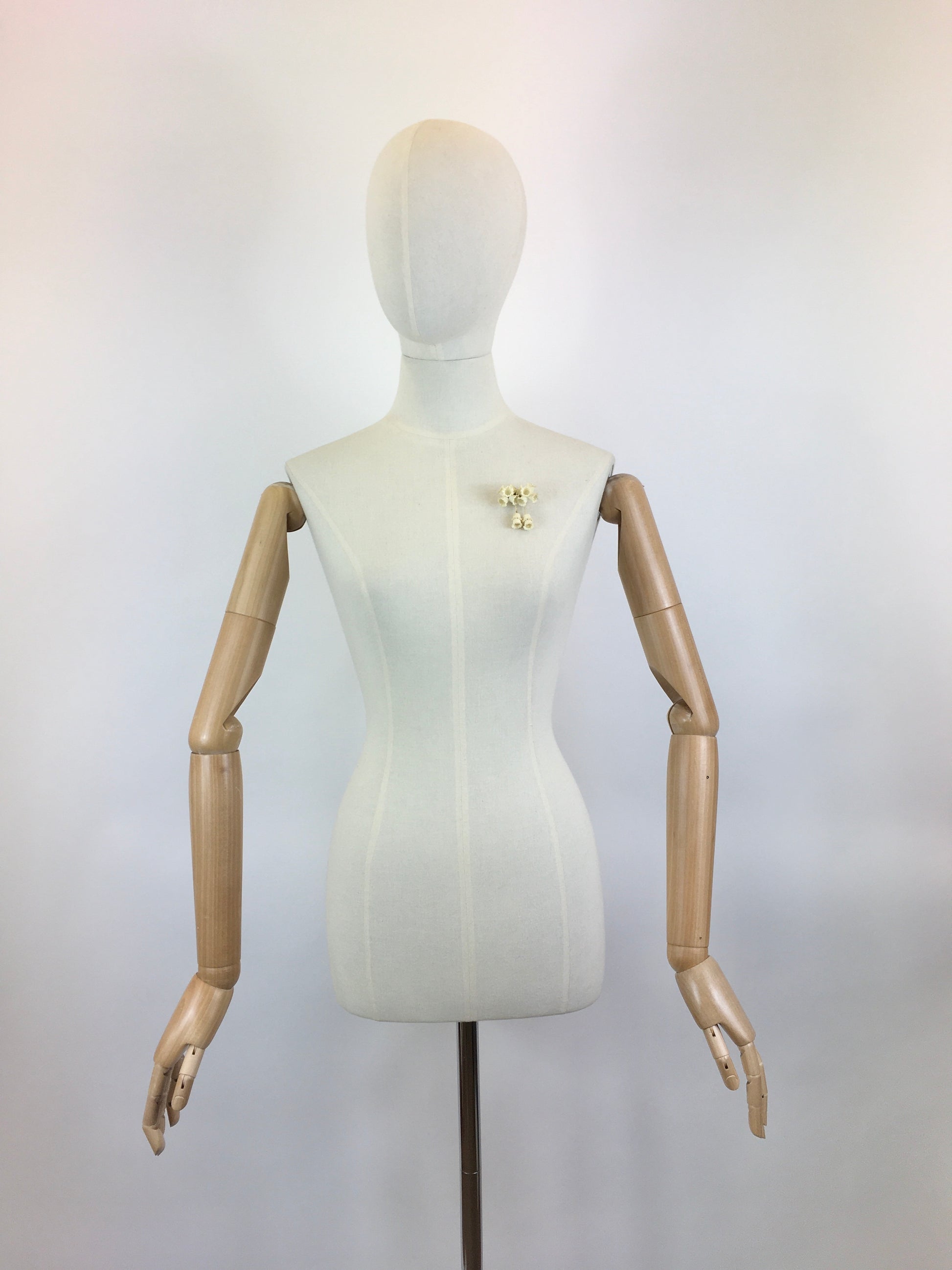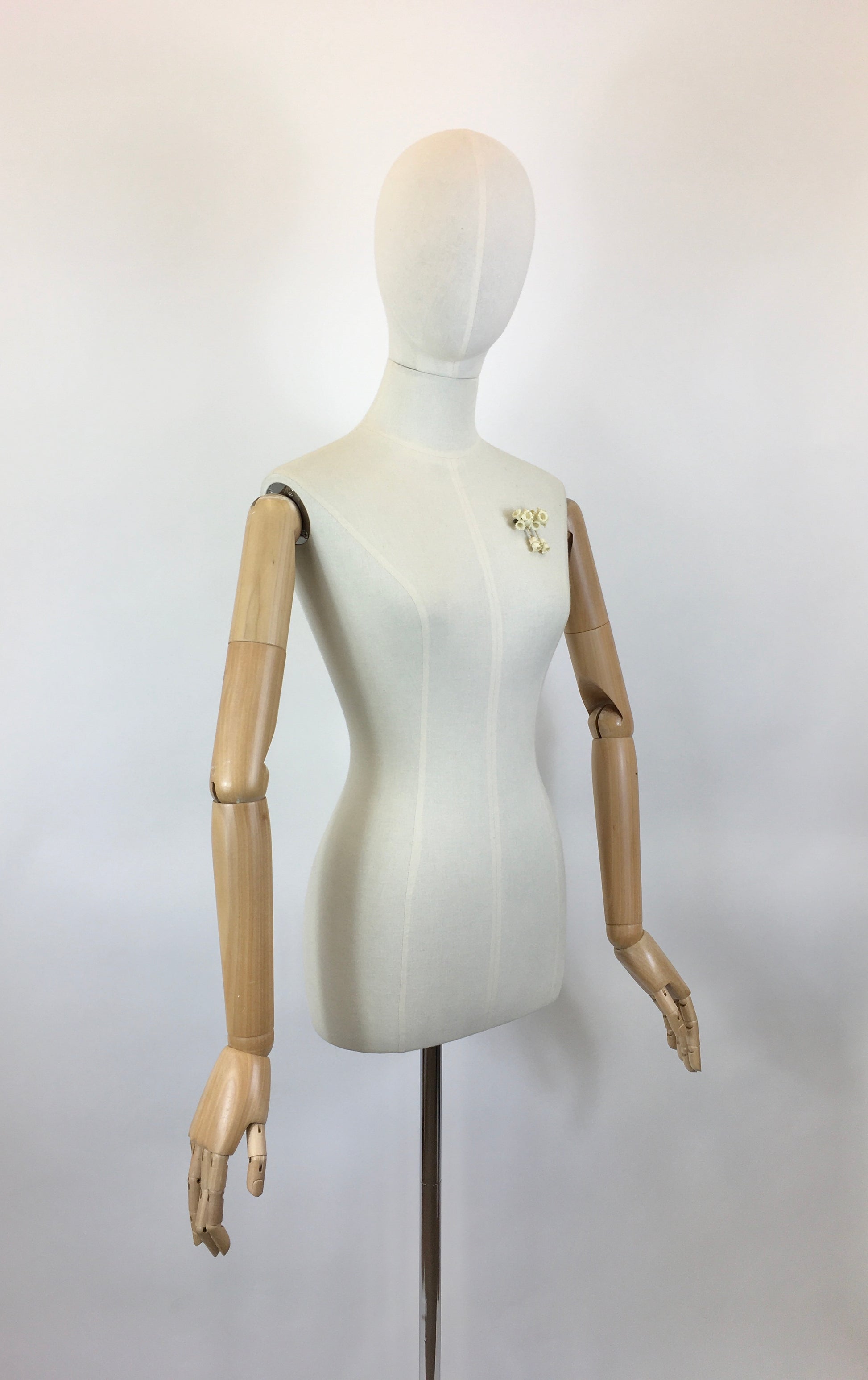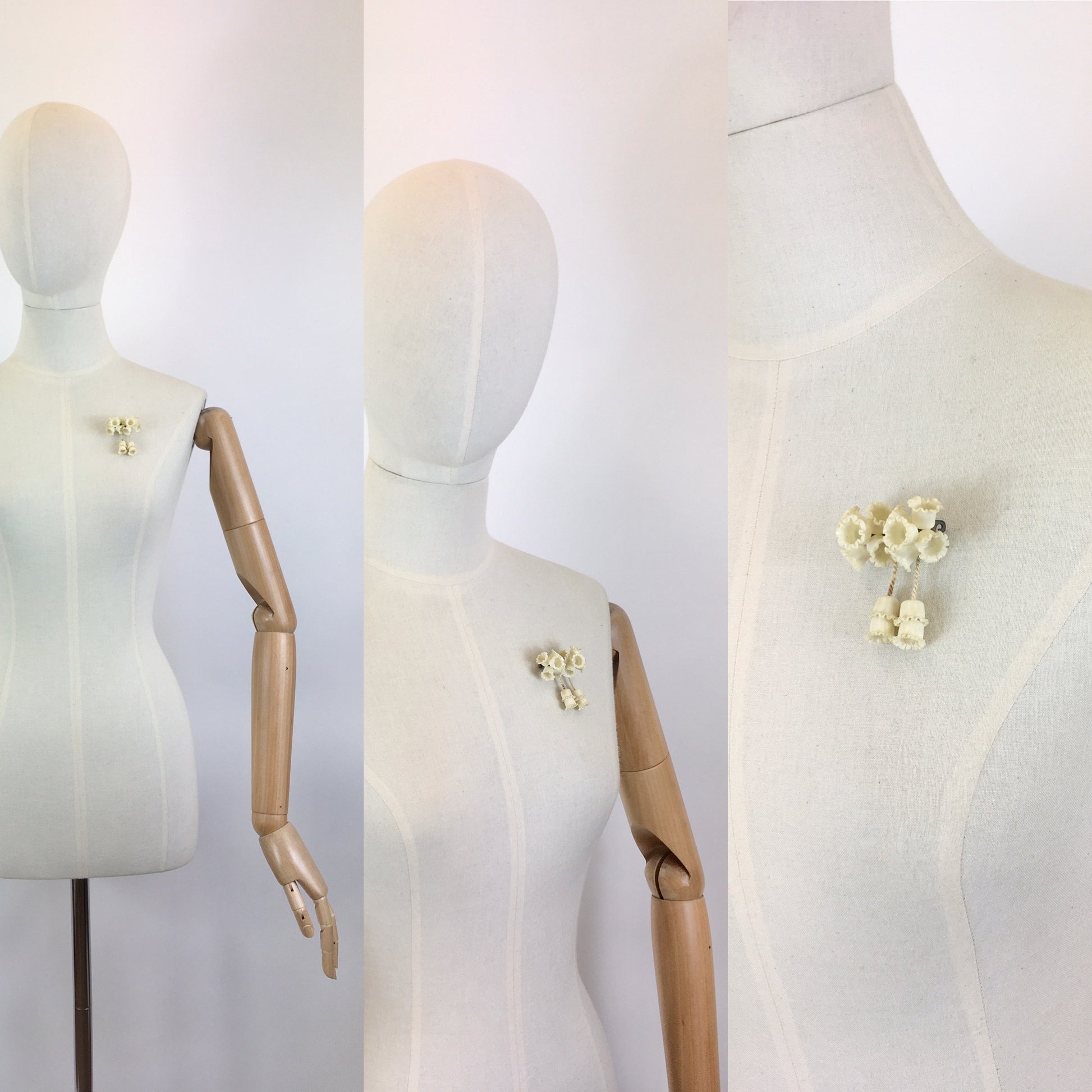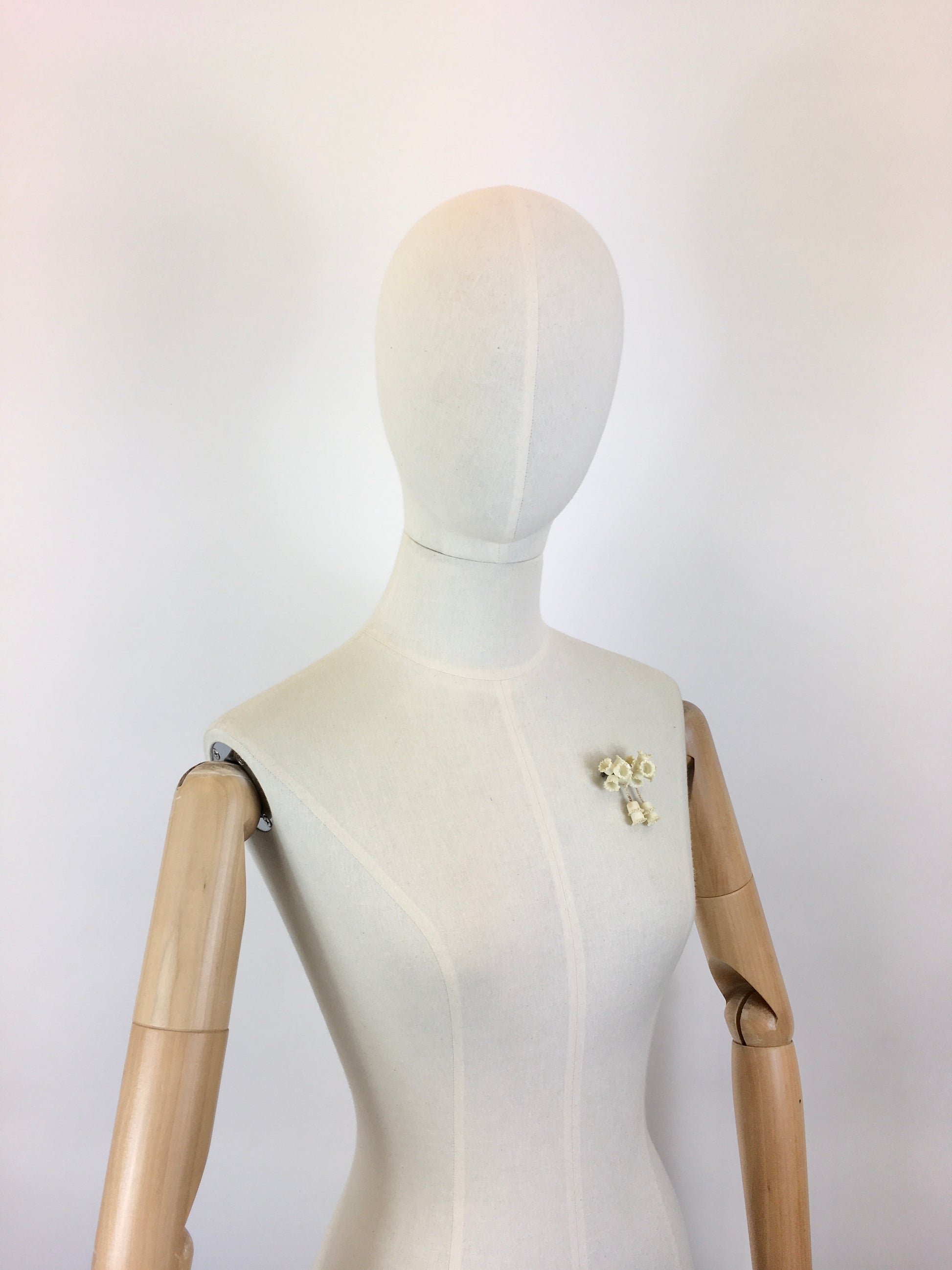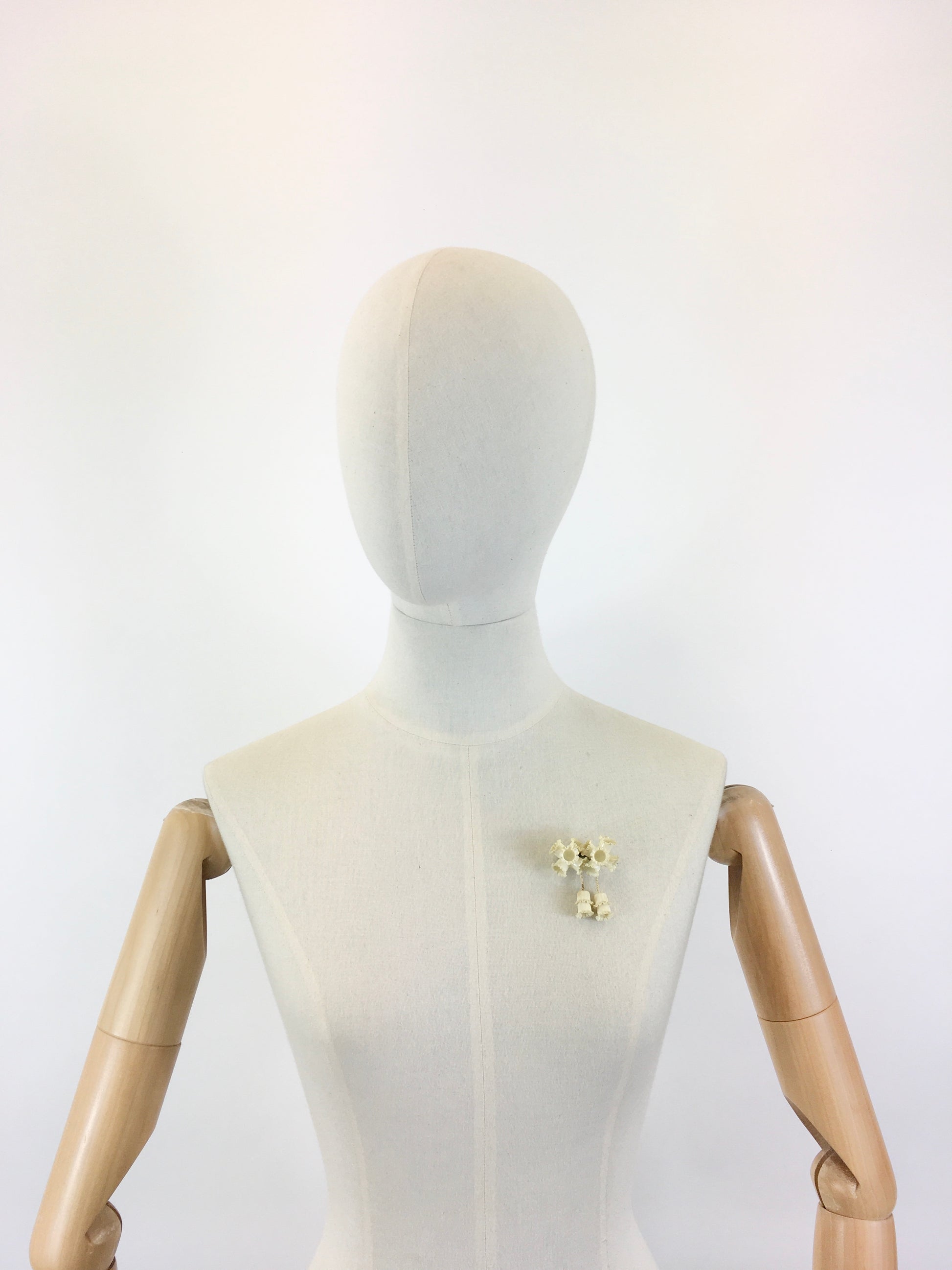 Vintage 1930’s cluster of Canterbury bells brooch in a darling cream celluloid. This piece measures 1.5’ x 1.75’ and makes a lovely statement piece for any dress, suit, cardigan or lapel of a coat. Such a tactile piece with exquisite detailing. Please see condition report below.