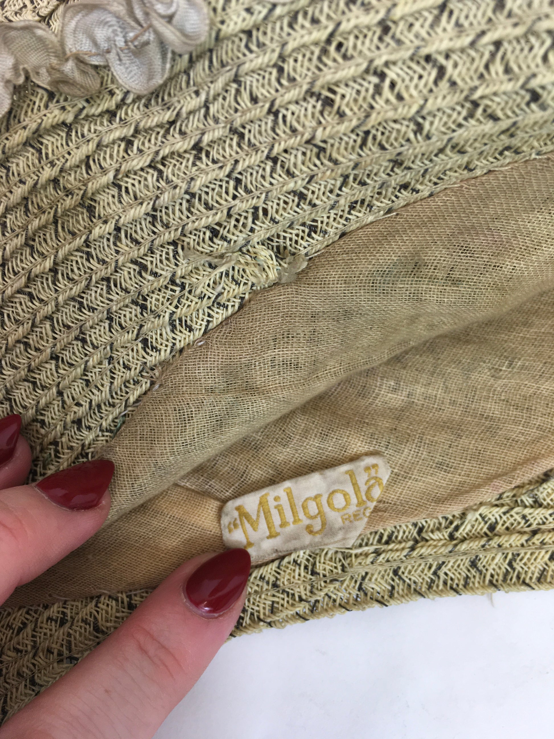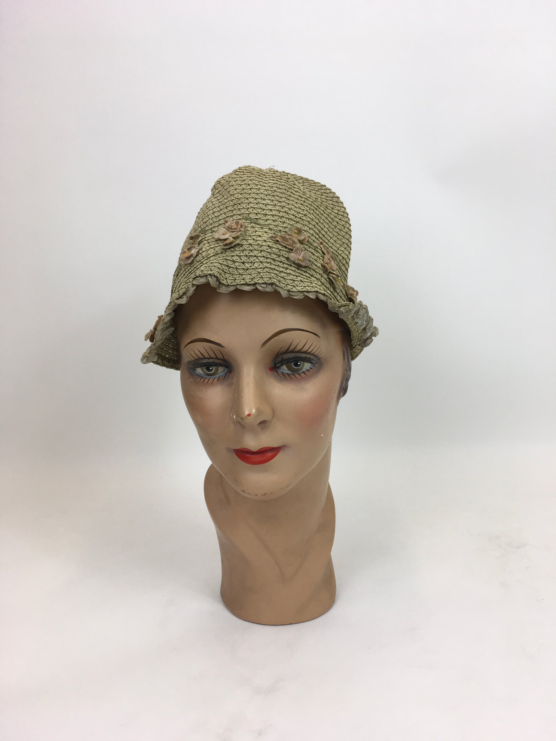 Vintage 1920's darling fabric cloche hat by ' Migola Reg'd' with dainty velvet floral trims. This is such a fabulous dainty piece great for wearing in the spring and summer months with cotton lawn day dresses and dropped waisted summer suits. Its made from a soft fabric with a scalloped trim and is adorned with darling velvet florals with embroidered stems. It fits a 21' Head size and is fully lined.