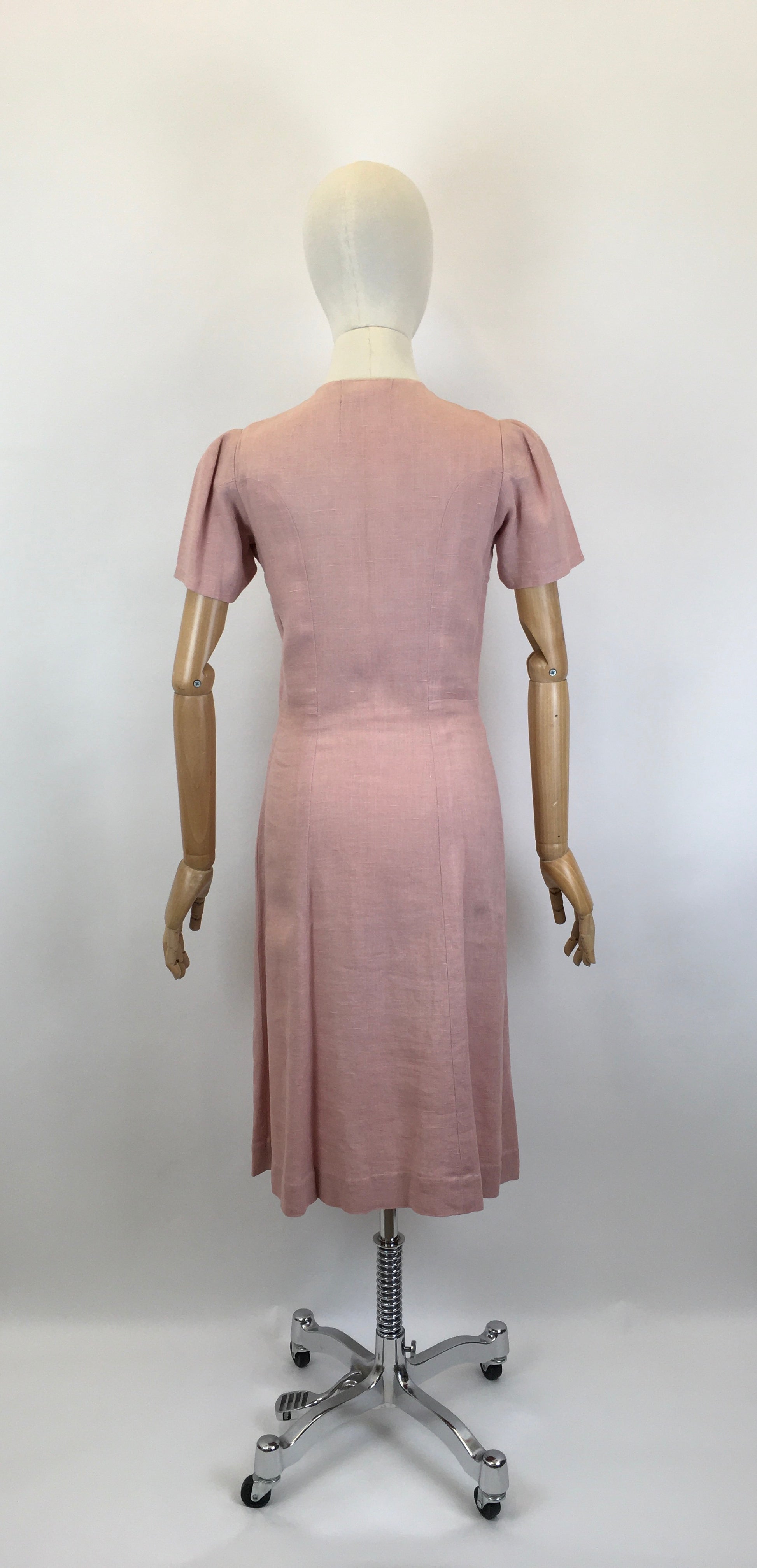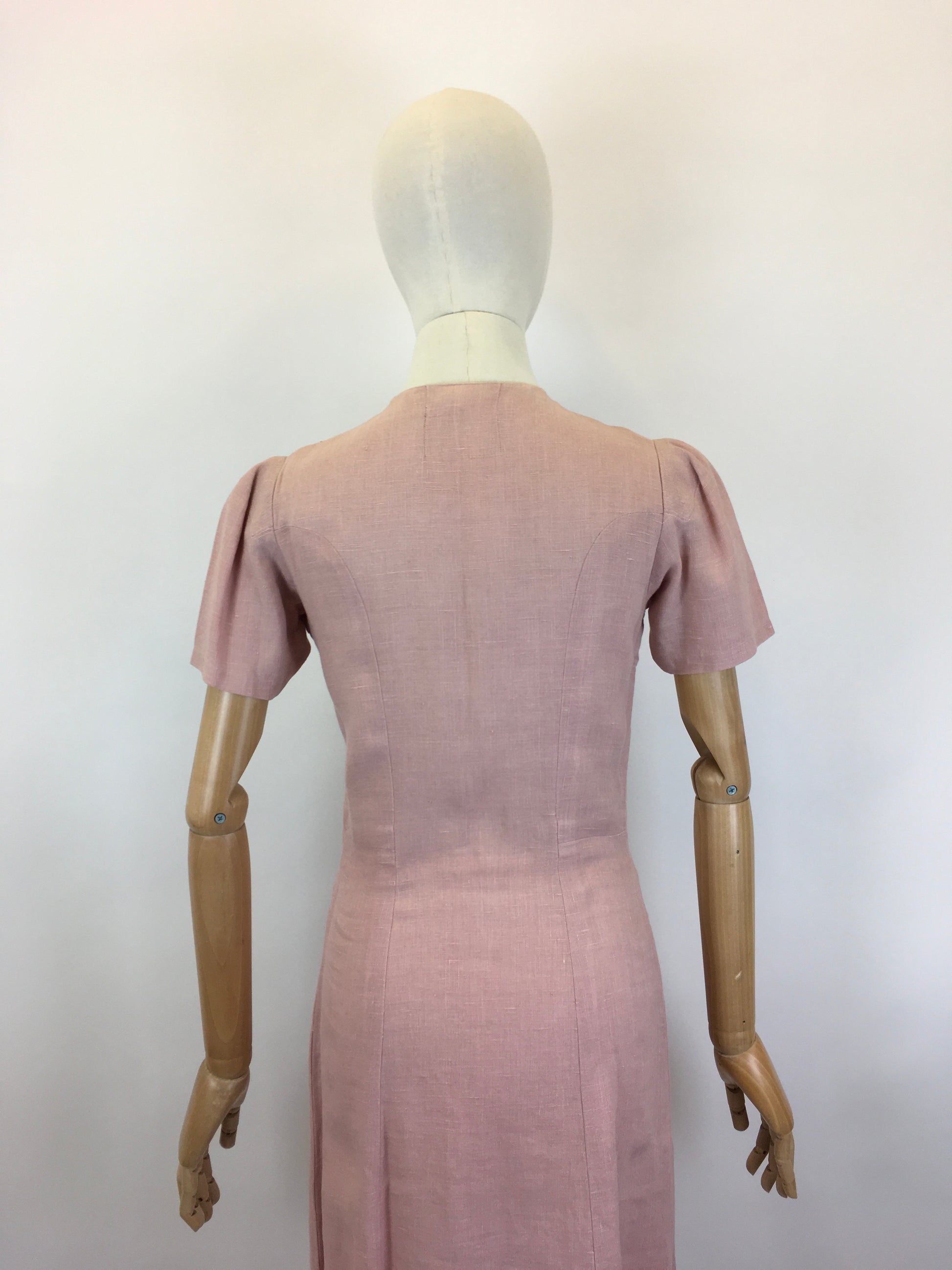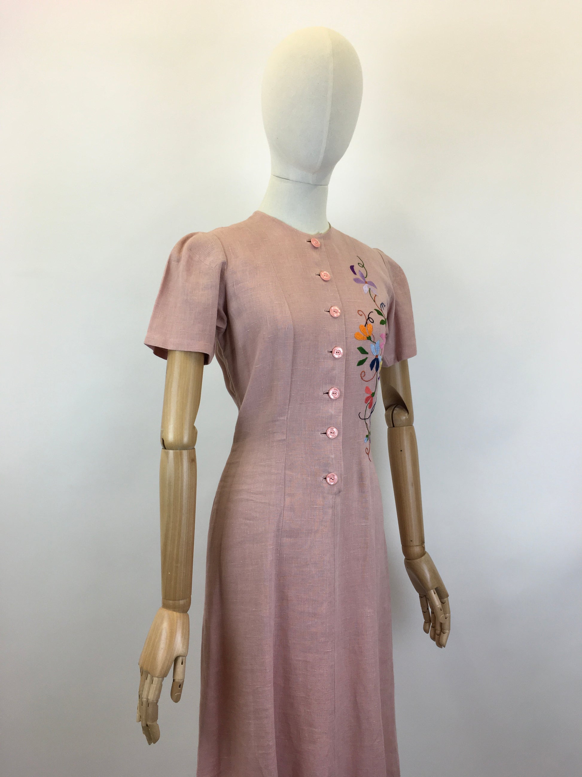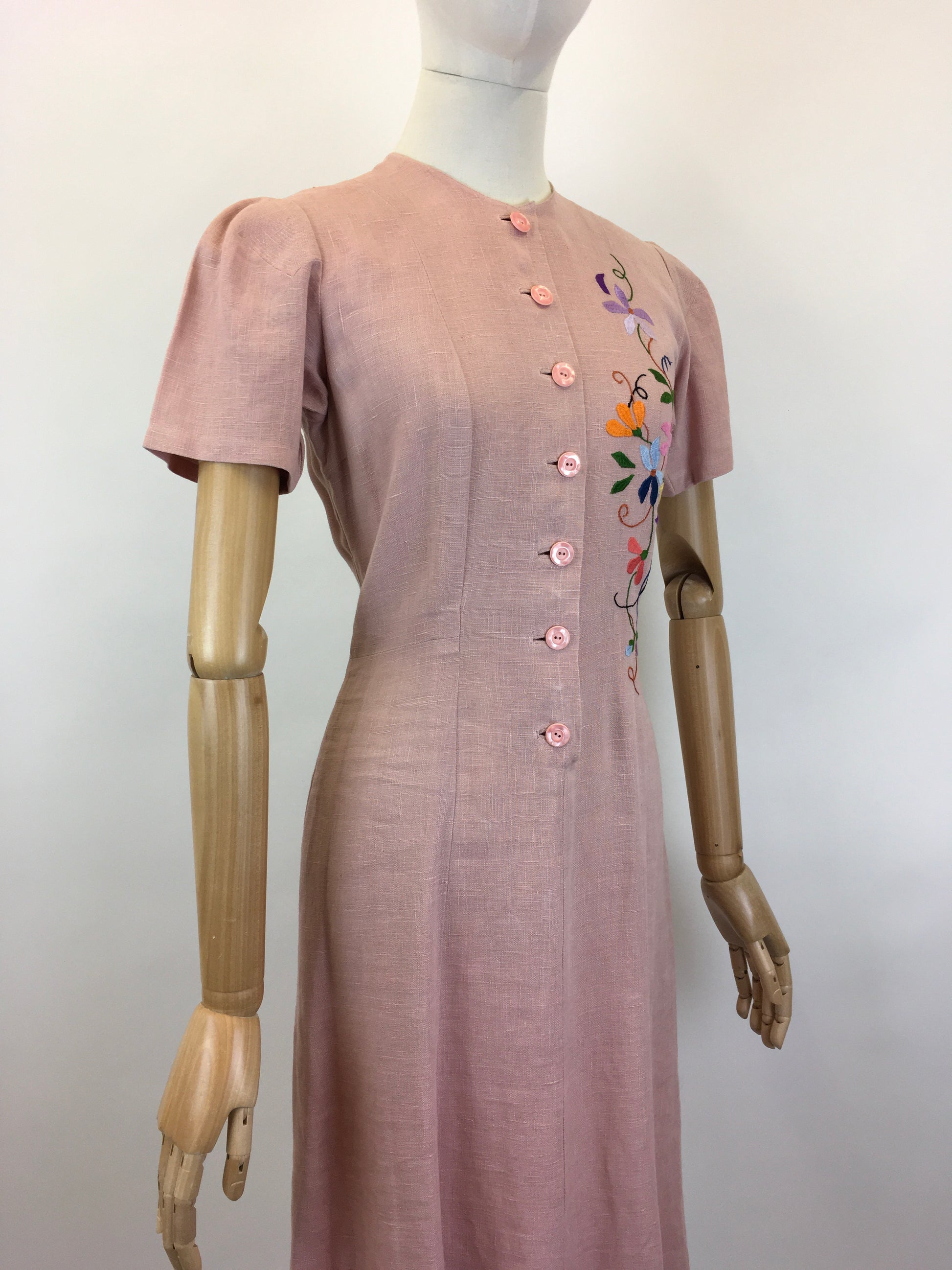 Vintage early 1940’s moygoshal linen dress in a divine powdered rose with embroidery detailing to the bodice in spring meadow bright florals. The dress has the most beautiful silhouette and features stitch work detailing to the shoulders, button front with pleats to the waist and a simple a line skirt. Sometimes the most simple silhouettes create the best fashions. This piece oozes 1940’s wartime glamour and would look fabulous worn dressed up or down for both daytime and evening wear occasions. This piece can be worn with an array of accompanying colours  for accessories due to the embroidery colour pallet which makes the piece very wearable.