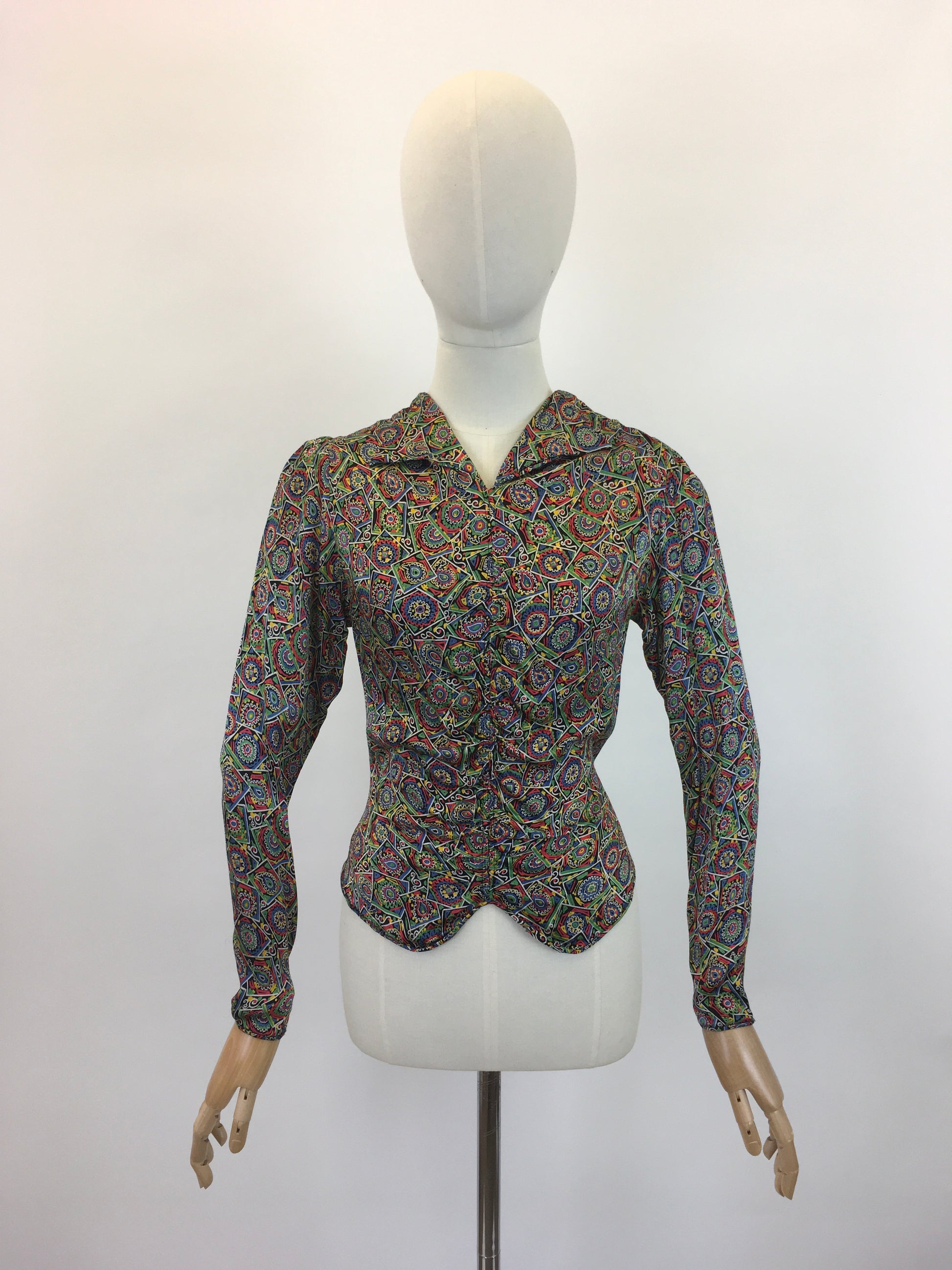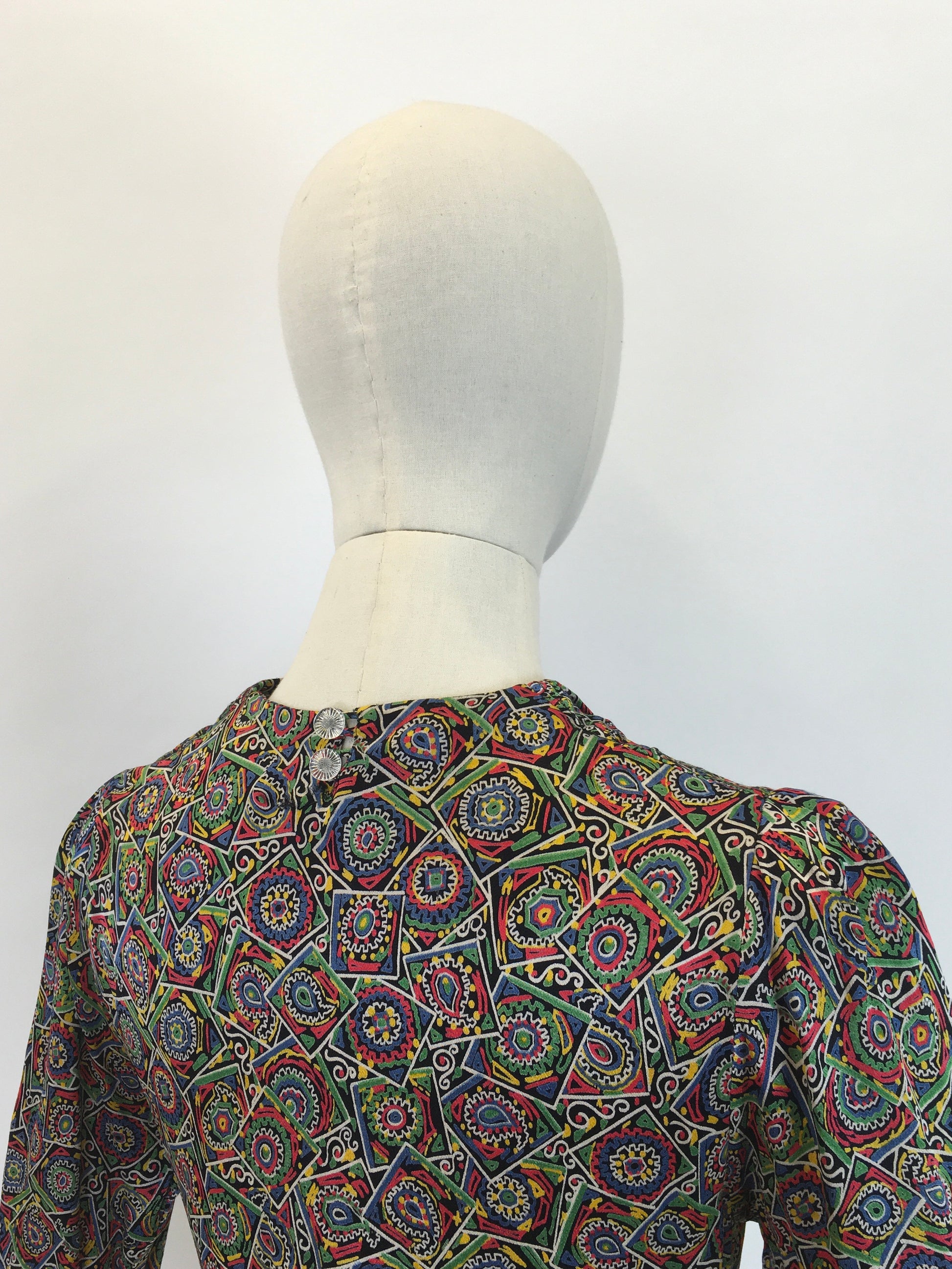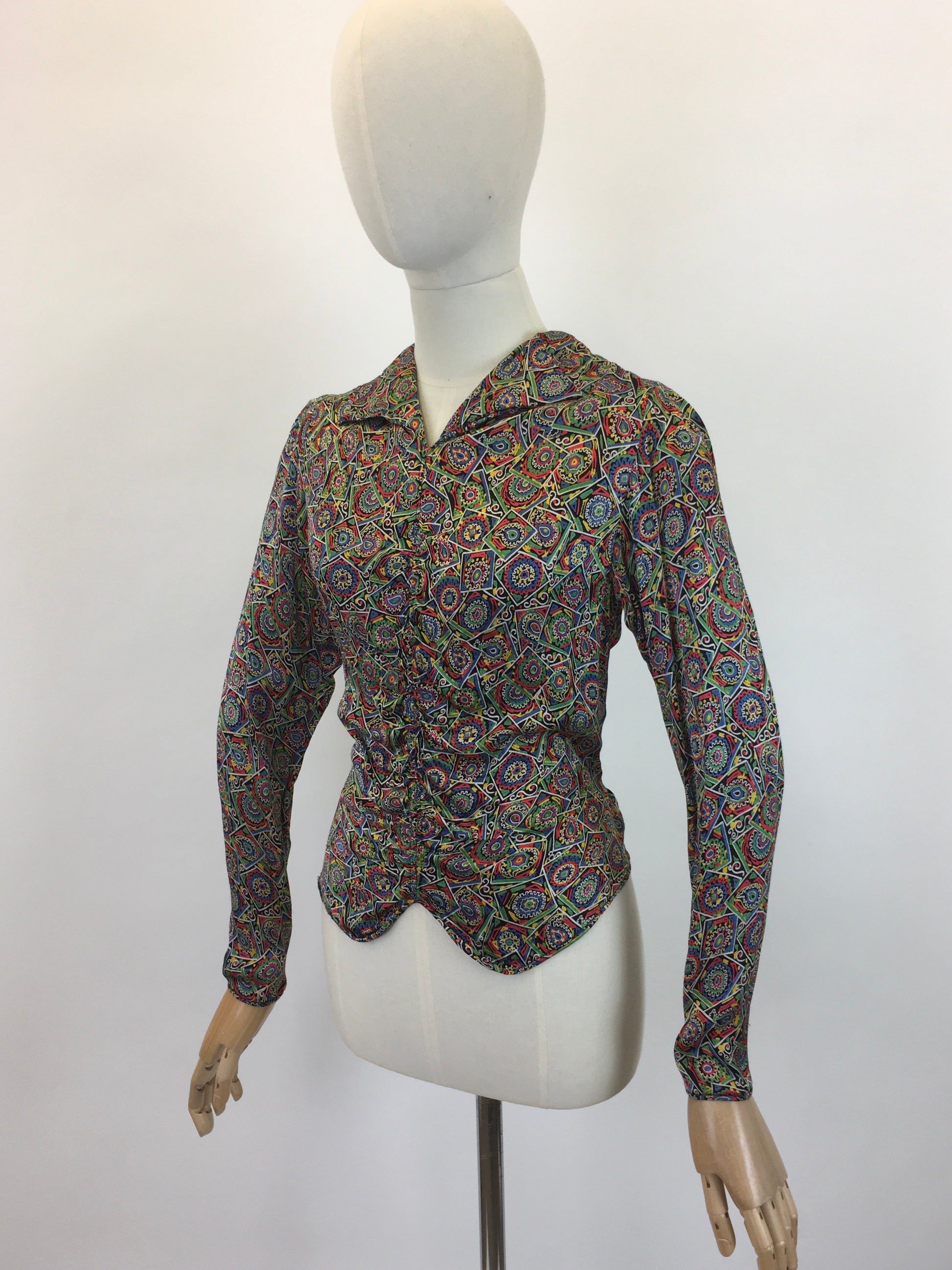 Vintage 1930's sensational rayon blouse with exquisite detailing in vivid reds, blues, yellows, greens, black and white. This incredible piece has a stunning silhouette and features a high neck with small collar overlay, full length sleeves which are shaped to a point and fasten with a press stud, centre shirring to the bodice which falls to a rounded hemline. To the back there is a 2 glass button fastening to the nape and a self tie belt to the waist. It also has a side popper fastening for ease of getting in and out off.
