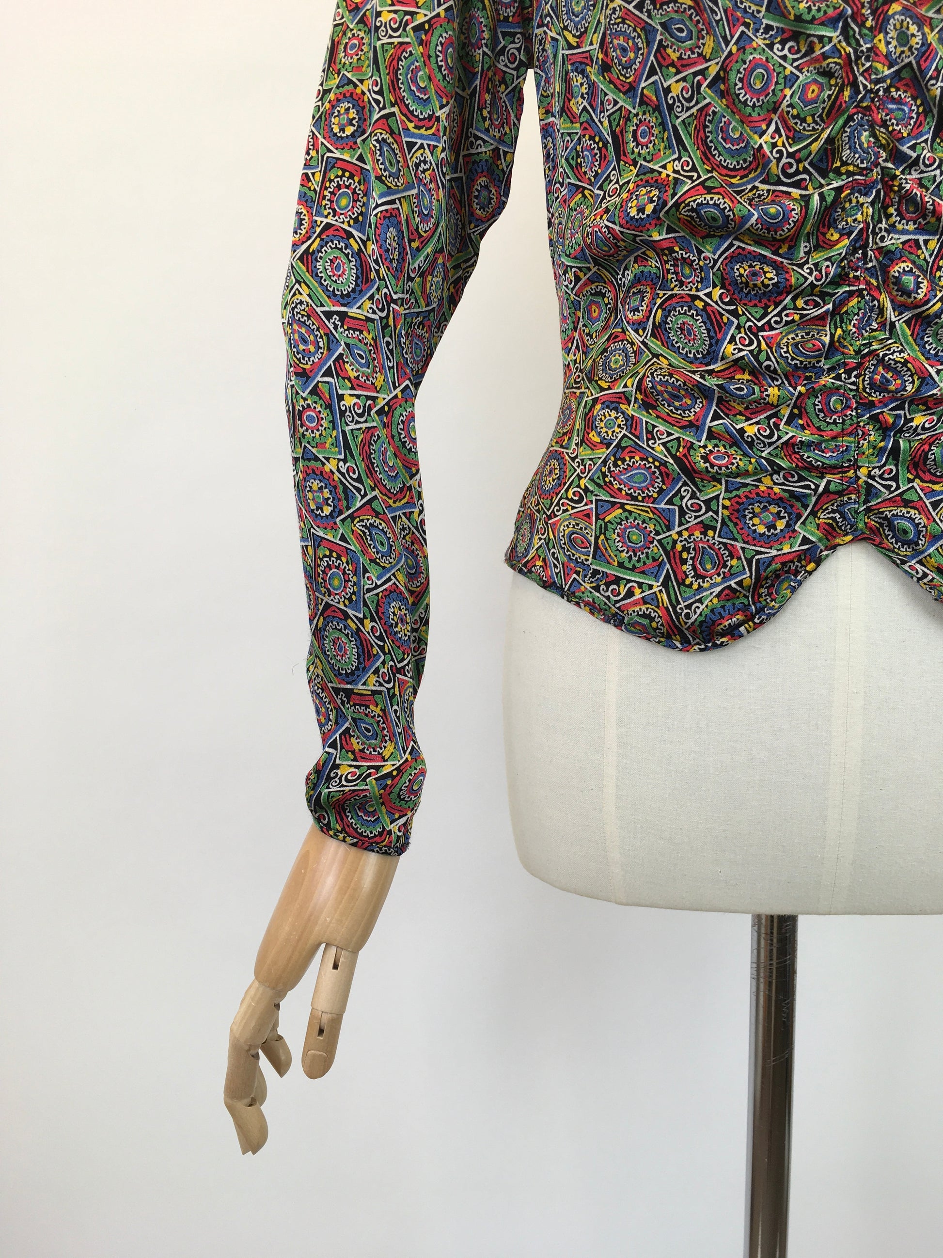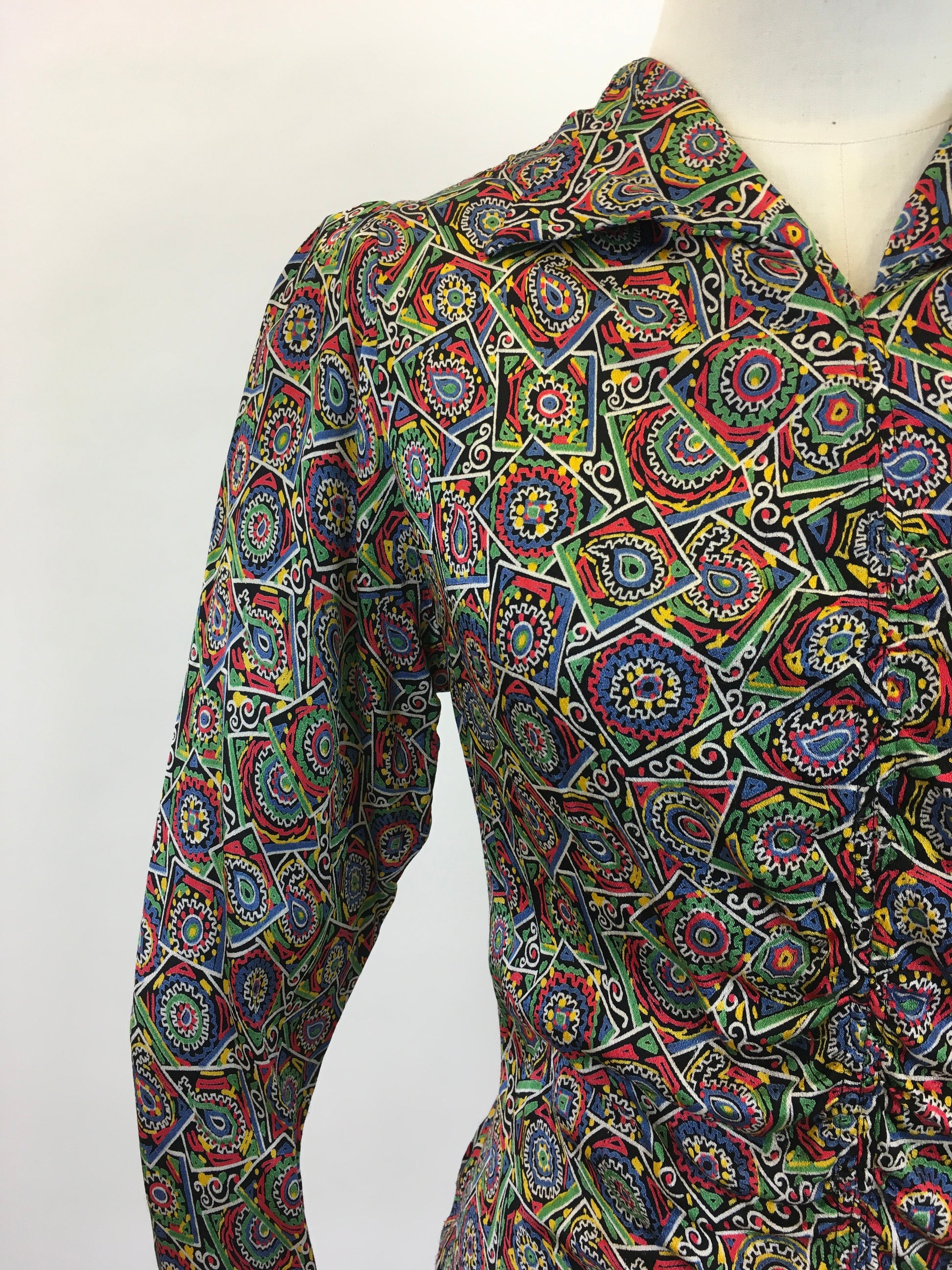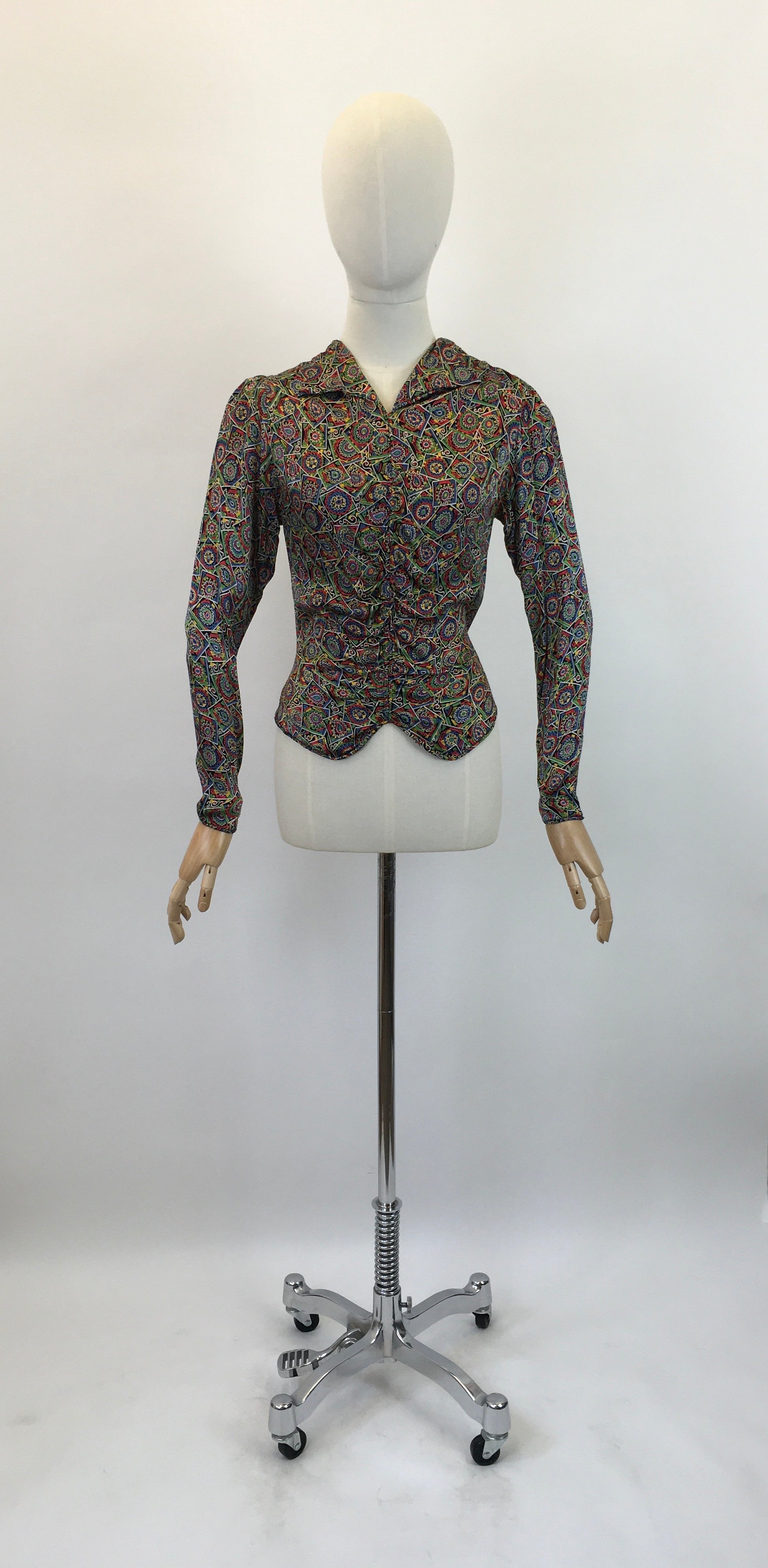 Vintage 1930's sensational rayon blouse with exquisite detailing in vivid reds, blues, yellows, greens, black and white. This incredible piece has a stunning silhouette and features a high neck with small collar overlay, full length sleeves which are shaped to a point and fasten with a press stud, centre shirring to the bodice which falls to a rounded hemline. To the back there is a 2 glass button fastening to the nape and a self tie belt to the waist. It also has a side popper fastening for ease of getting in and out off.