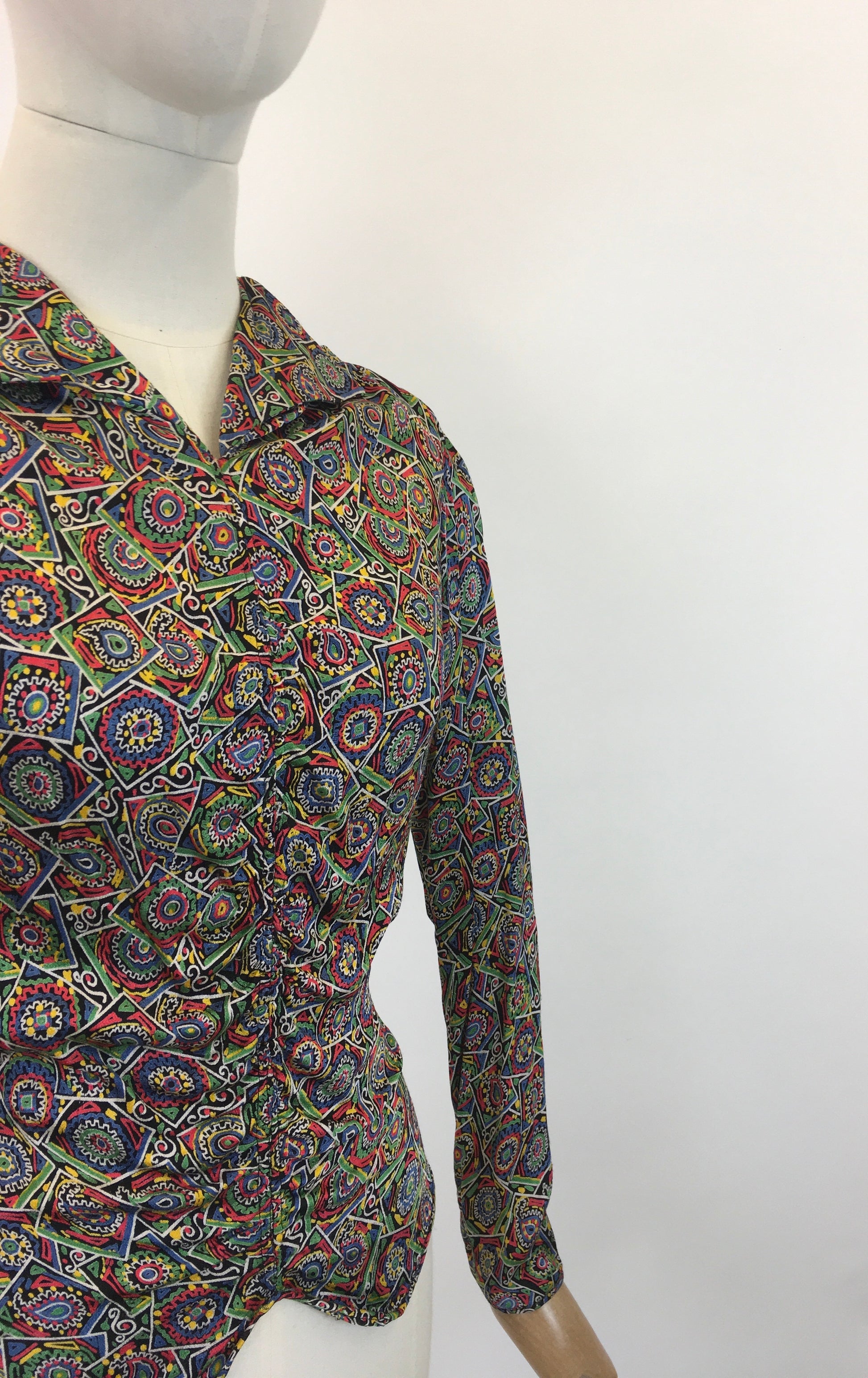 Original 1930's Sensational Rayon Blouse with Exquisite Detailing - In Vivid Reds, Blues, Yellows, Greens, Black & White