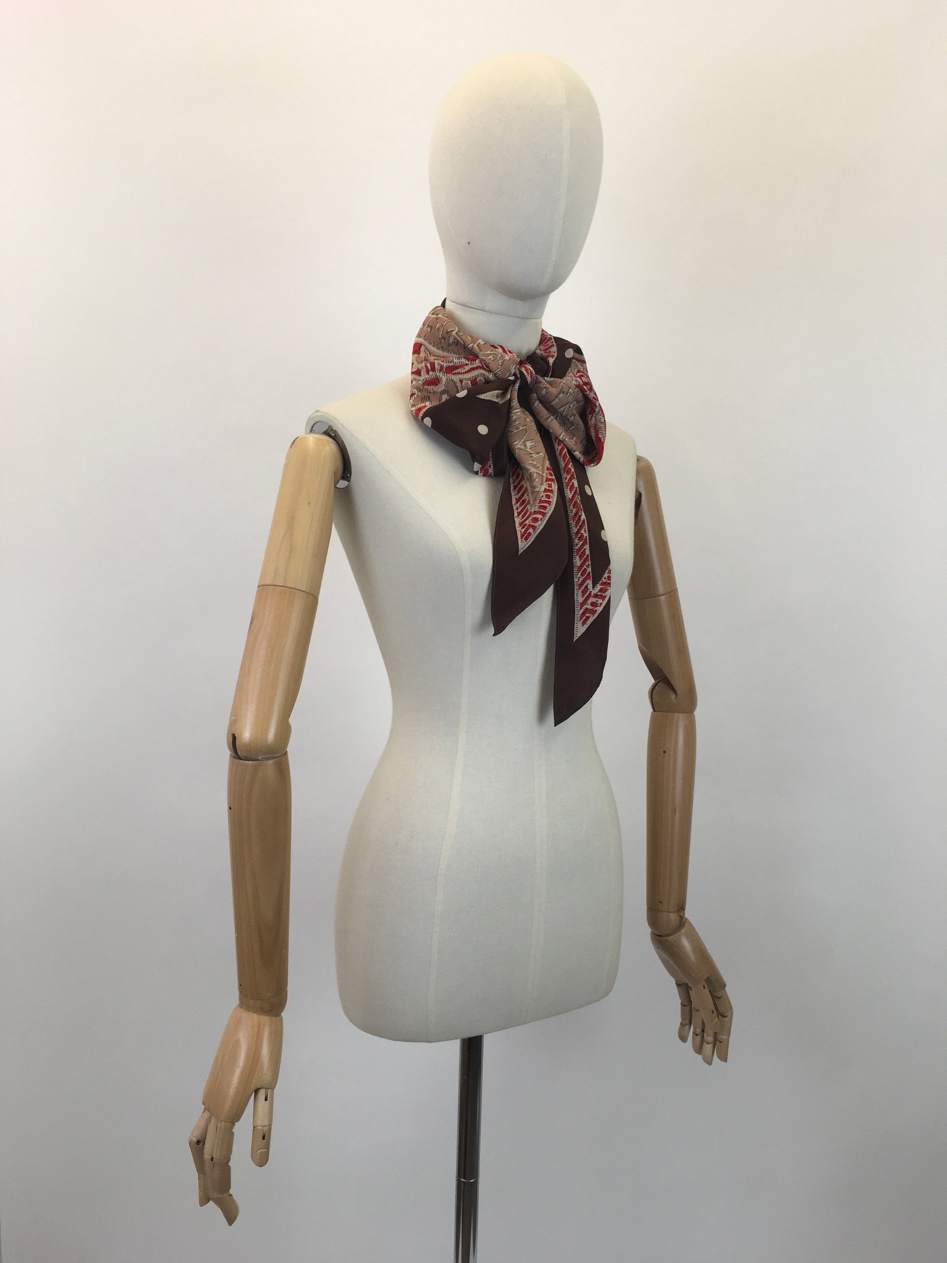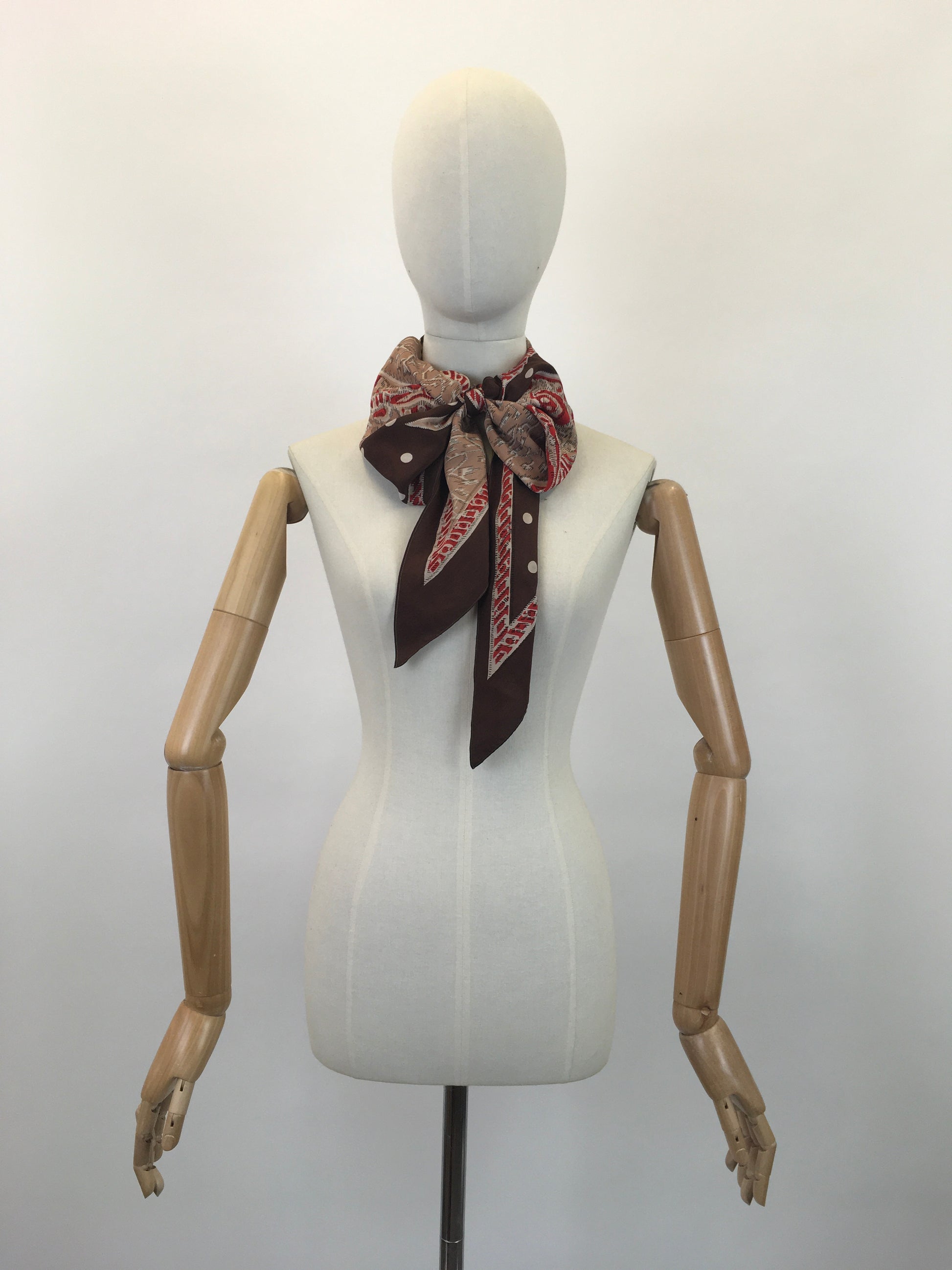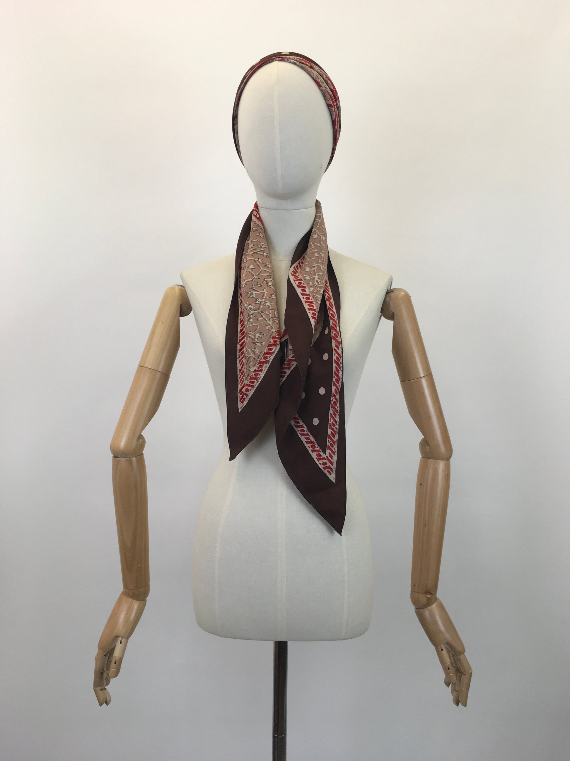 Vintage 1930's stunning art deco pointed scarf in browns, reds, coffee and caramel. Measuring 72' total length this piece is really versatile and can be worn in multiple ways around the neck, in the hair or even styled as a belt. A stunning example from this era which makes a lovely gift to yourself, friend or loved one.