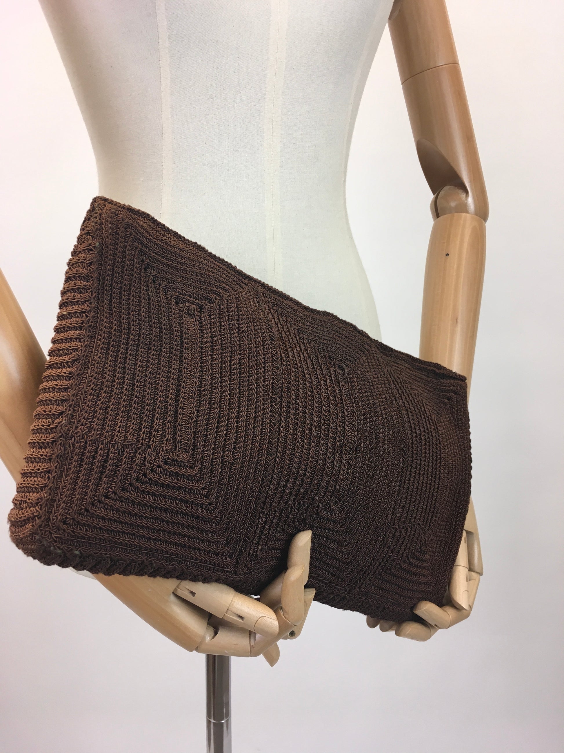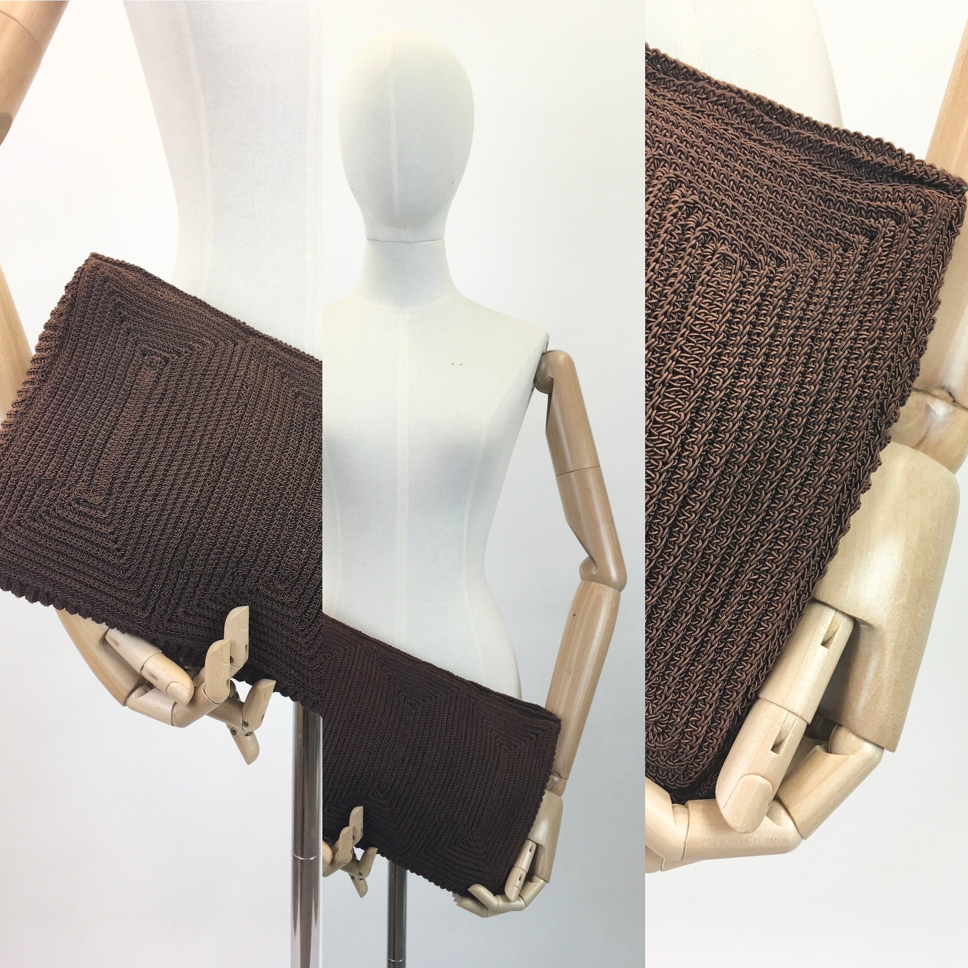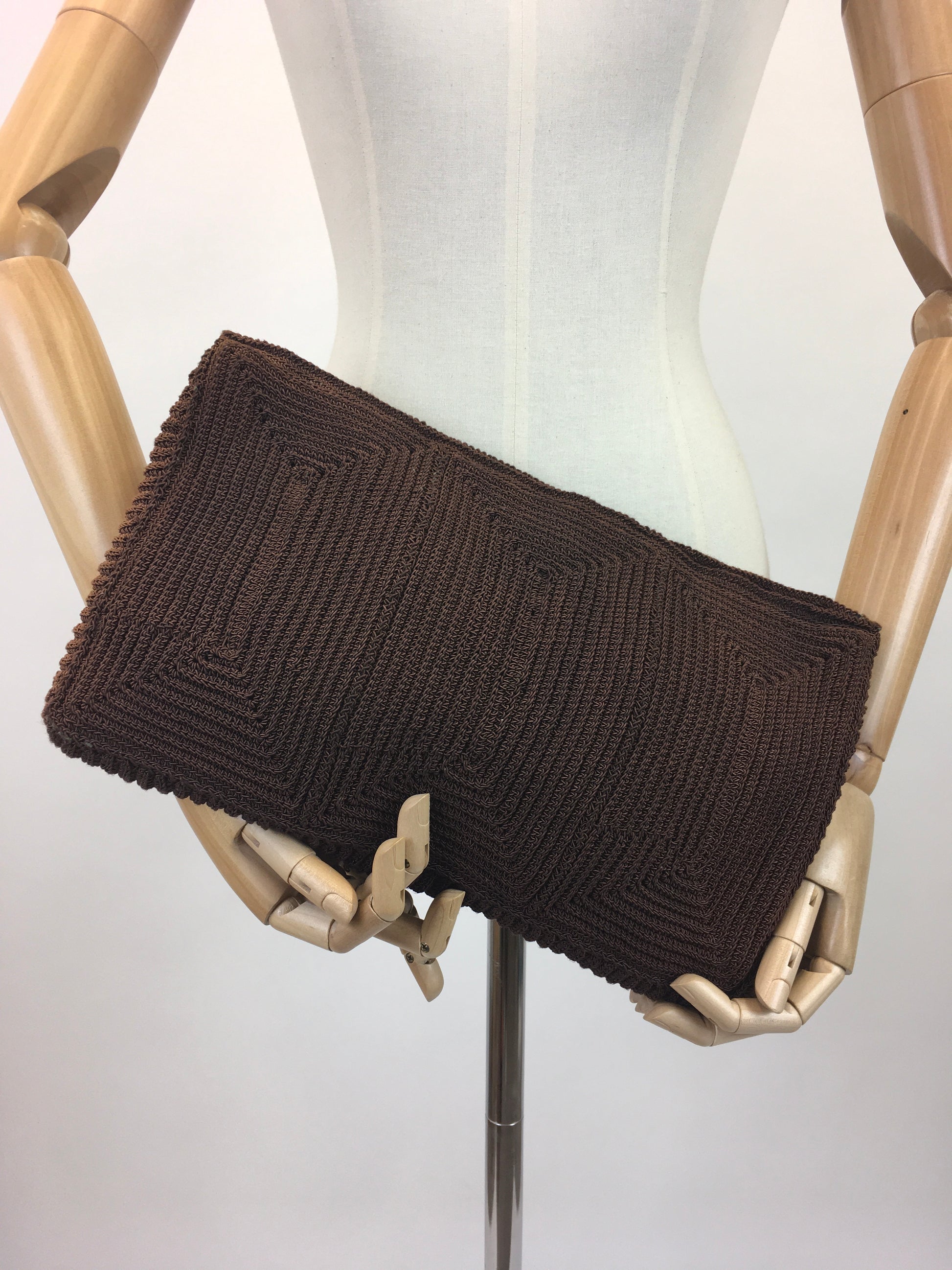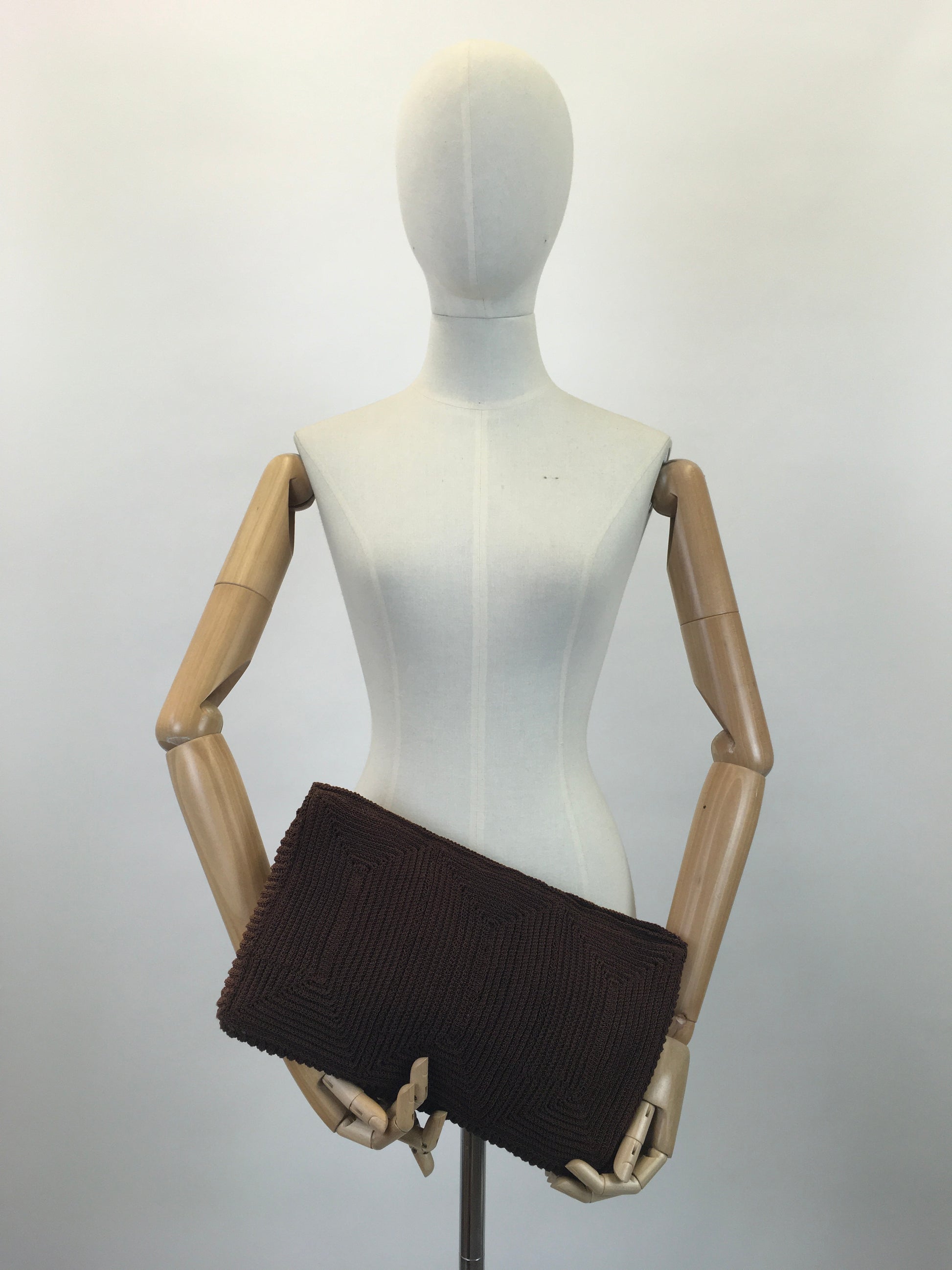 Vintage beautiful 1940's large rectangular clutch handbag in a warming brown knit. This is a beautiful example from the period and showcases a beautiful knit to its outer. Internally it features a large internal pouch with 2 smaller side pockets. It fastens with a large metal zip. This measures a great size for the modern gal and can be used for both day and eveningwear occasions.
