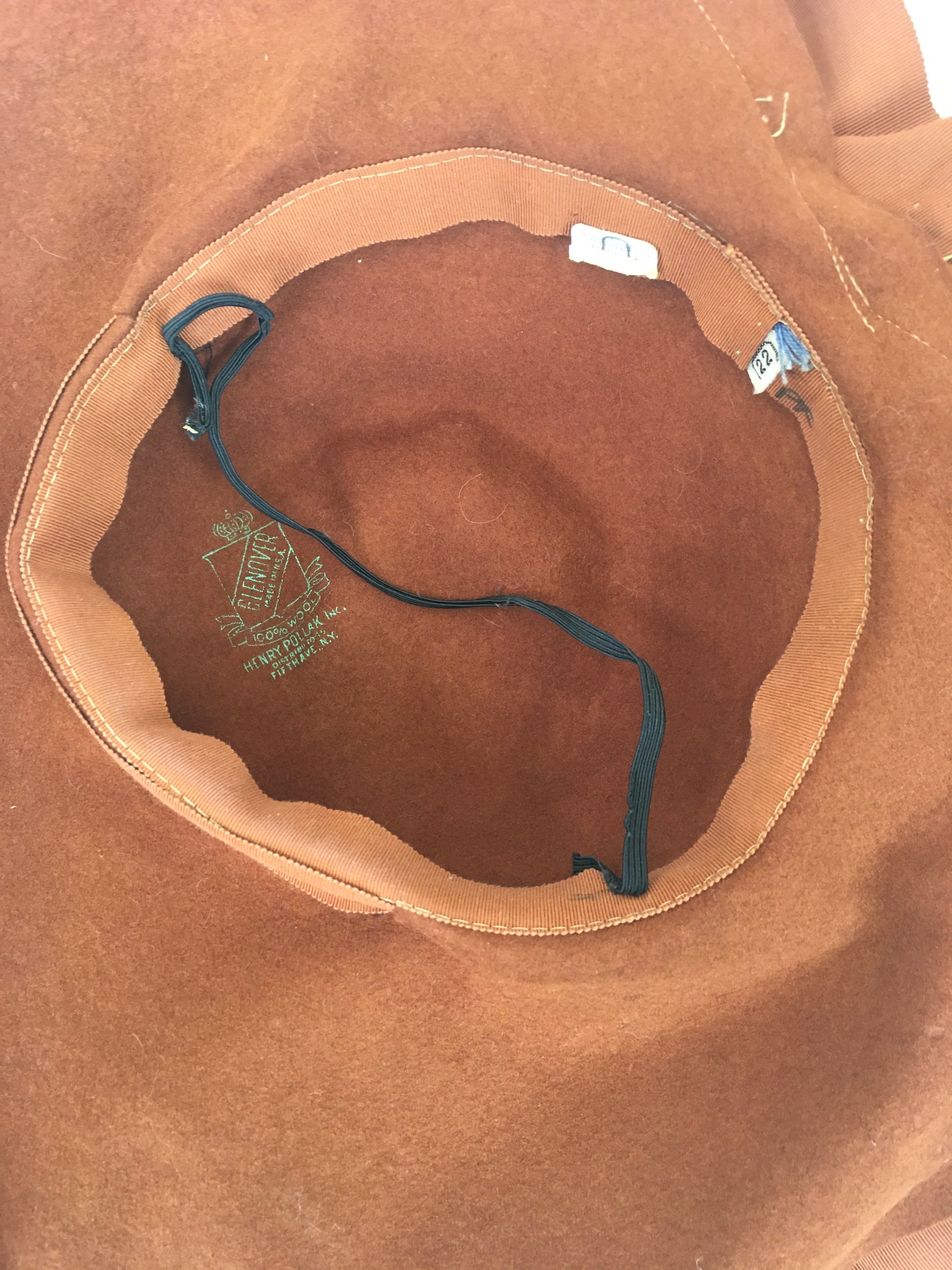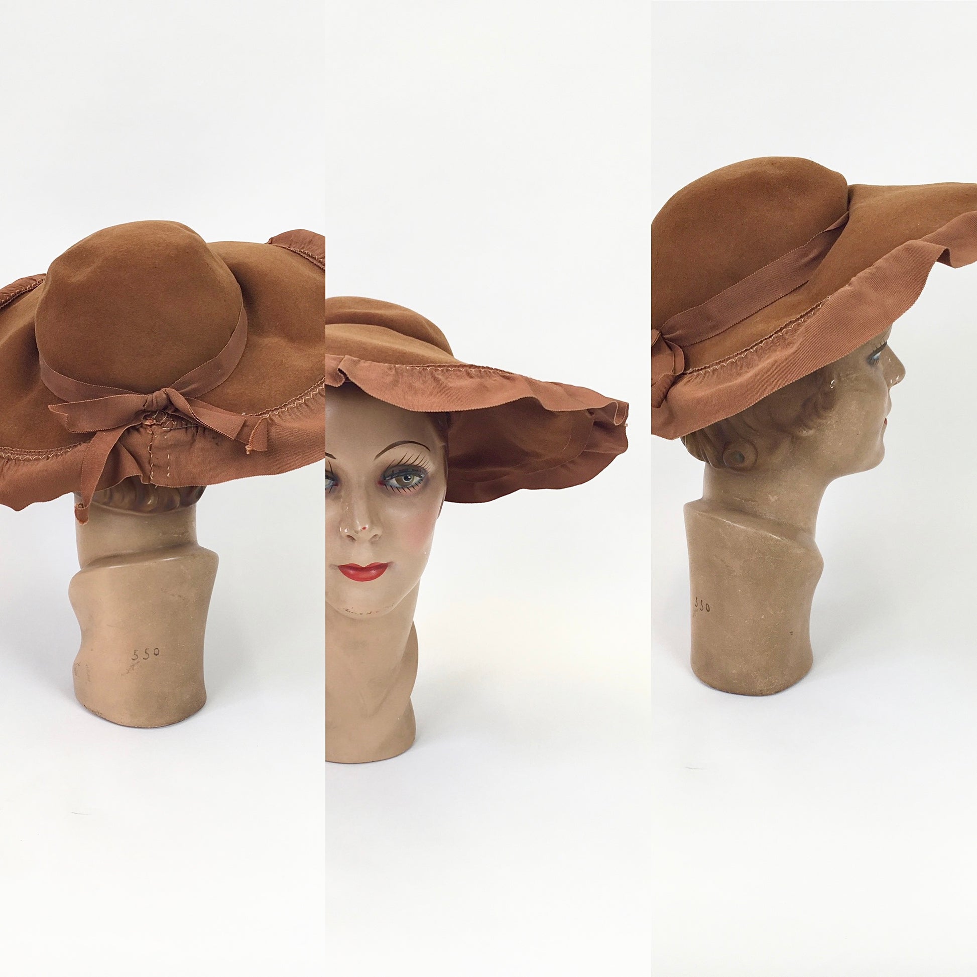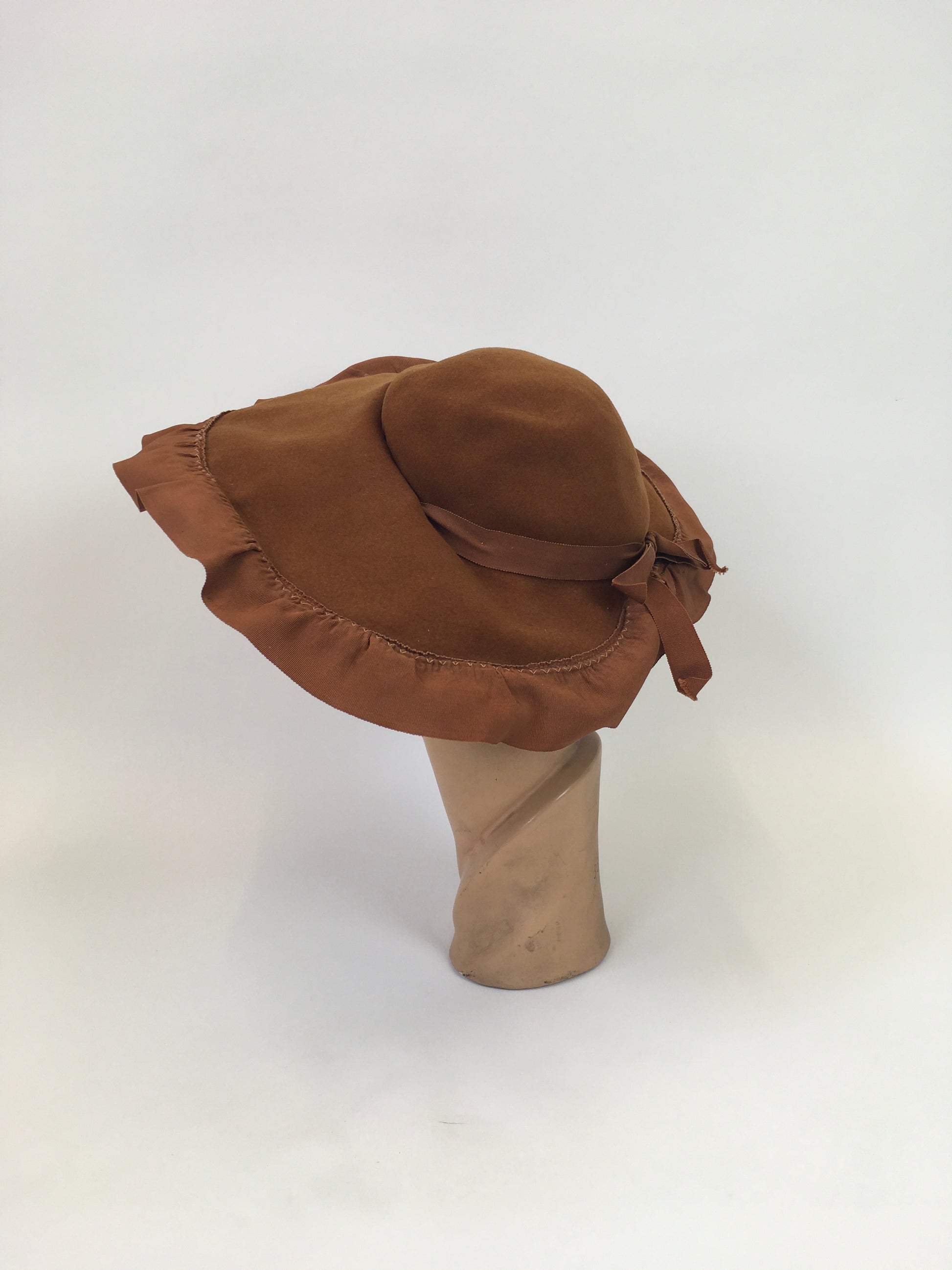 Vintage 1940's sensational brimmed hat in warm cinnamon with a ruffled grosgrain trim. This is a stunning example from its time in a hard to find colourway. It can be worn on an angle, laid on the head as is or tilted to create a halo silhouette. It can be worn in varying ways for differing ensembles and hairstyles. The hat is made from a felt base with a delightful ruffled grosgrain trim with bow to the back nape. It features an American Label ' N. Snellenburg & Co Inc Philadelphia' . It also has a sewn in black elastic to aid in security of wearing.