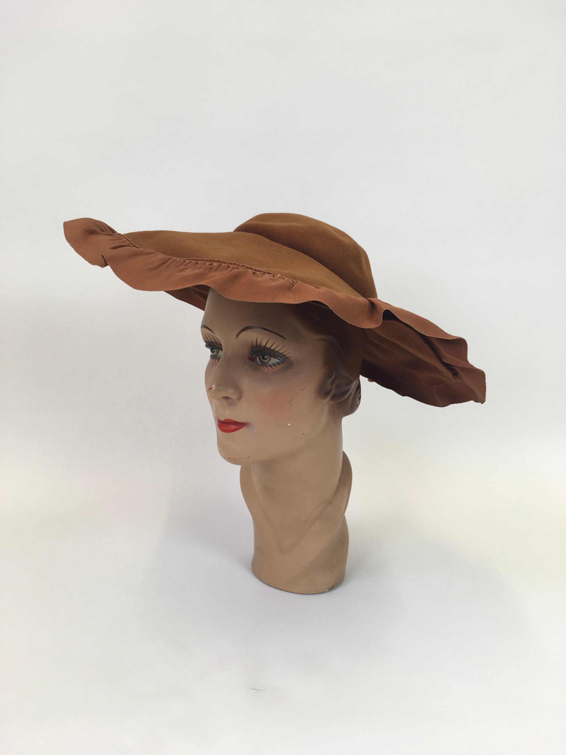 Original 1940's Sensational Brimmed Hat - In Warm Cinnamon With a Ruffled Trim