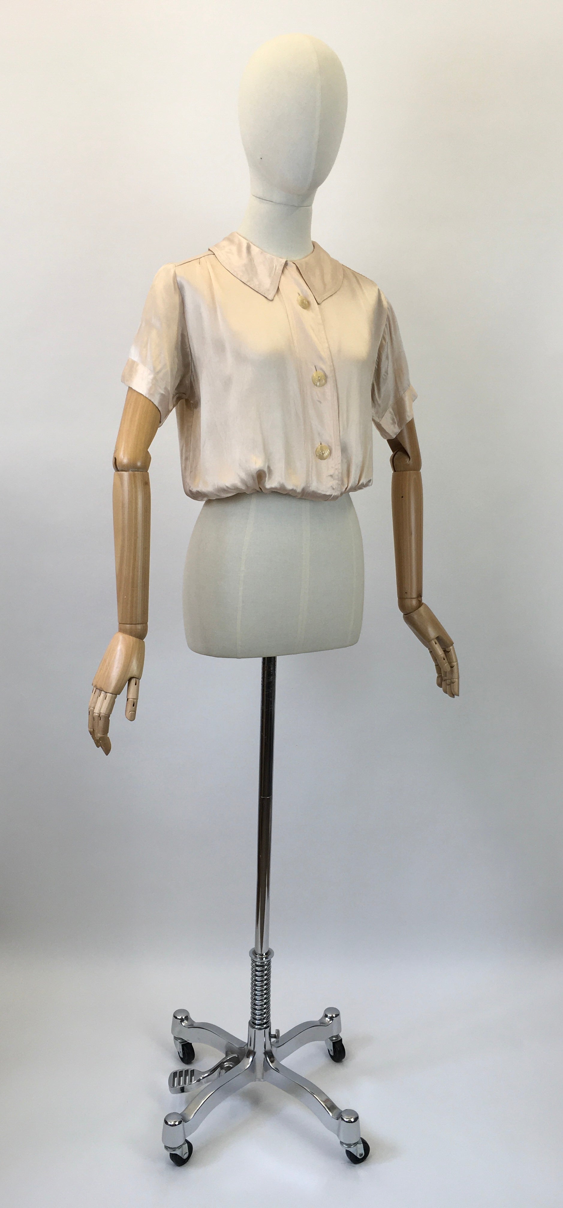 Vintage 1930's darling silk rayon blouse in a pale pink. This is a beautiful example from its time and has some classic detailing. It features a pointed collar, button down front, short sleeve and elasticated waist. It looks fabulous styled with a pair of high waisted wide leg slacks, skirts or under suits.
