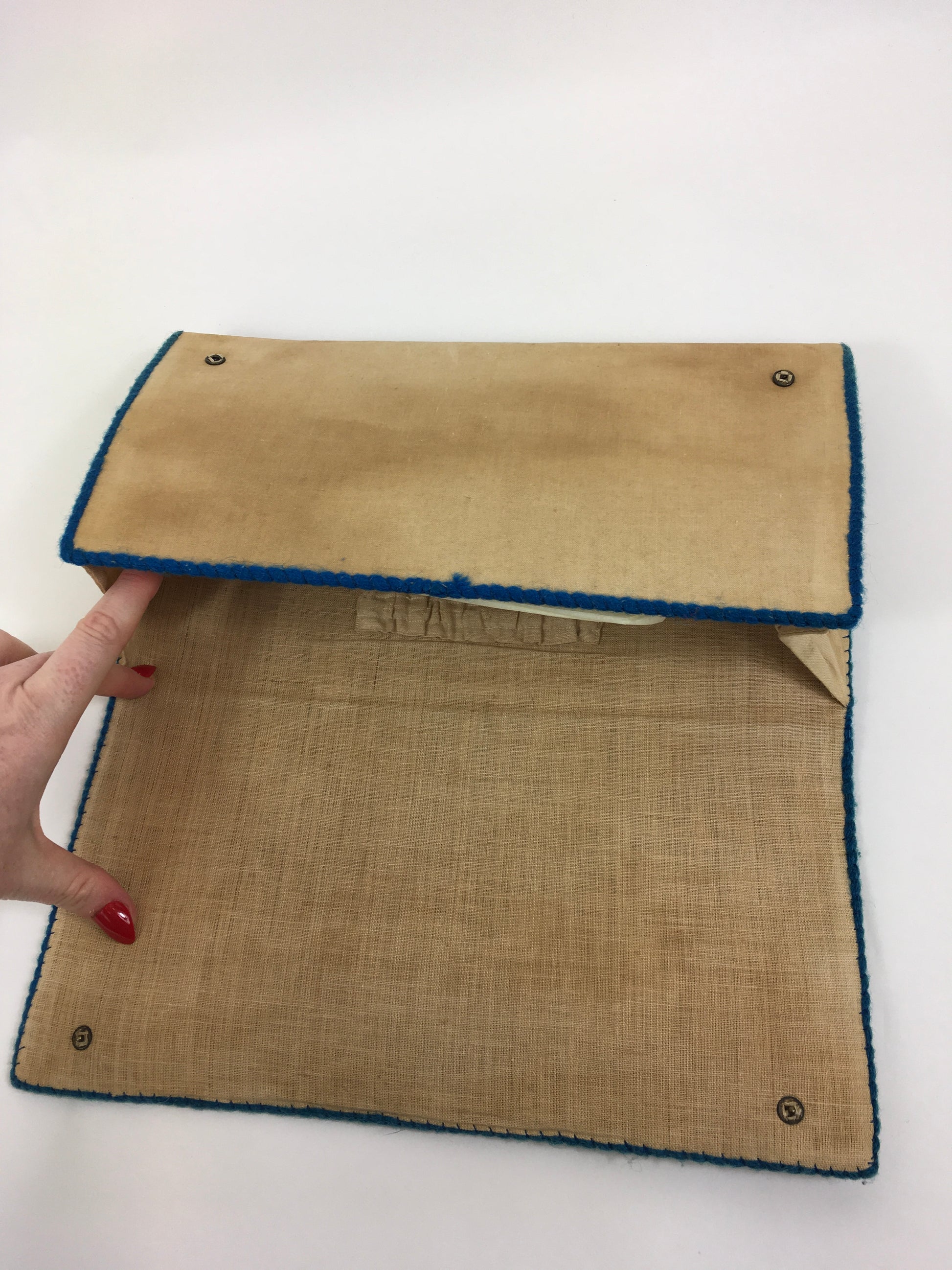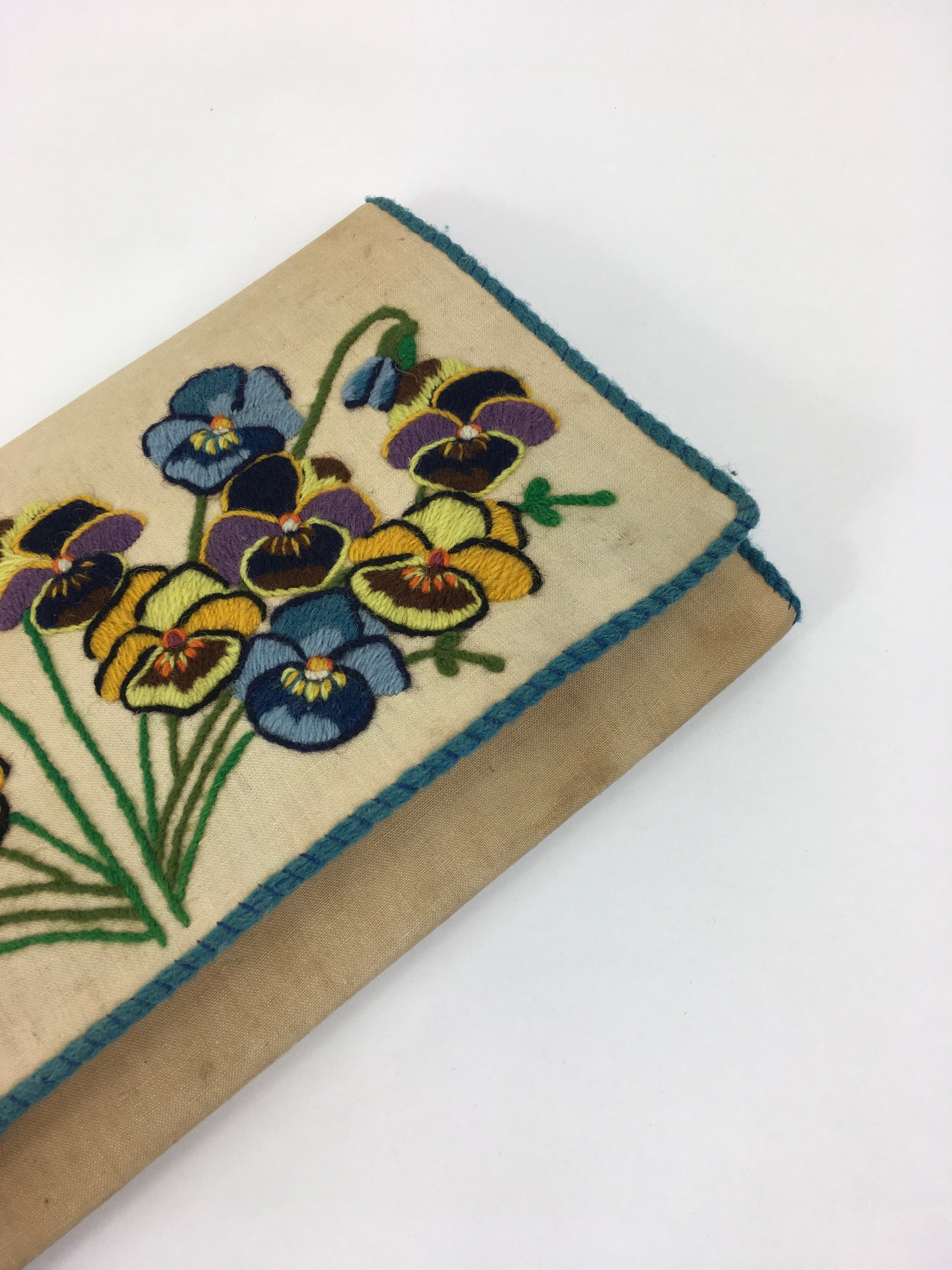 Vintage 1930’s exquisite embroidered linen clutch handbag with stunning details and colour pallet. The piece shows great workmanship in all its details. It’s made in an envelope shape pattern, with double press stud fastenings, back strap for ease of wearing and an inside pocket. The bag measures 11.5’ x 7’ and is a great size for both day and evening occasions to carry the essentials for the modern lady. The piece is exquisitely detailed with embroidery in the form of pansy florals in mauves, blues, yellows, greens and fawns and edged in a matching powdered blue trim. This piece makes my heart sing.