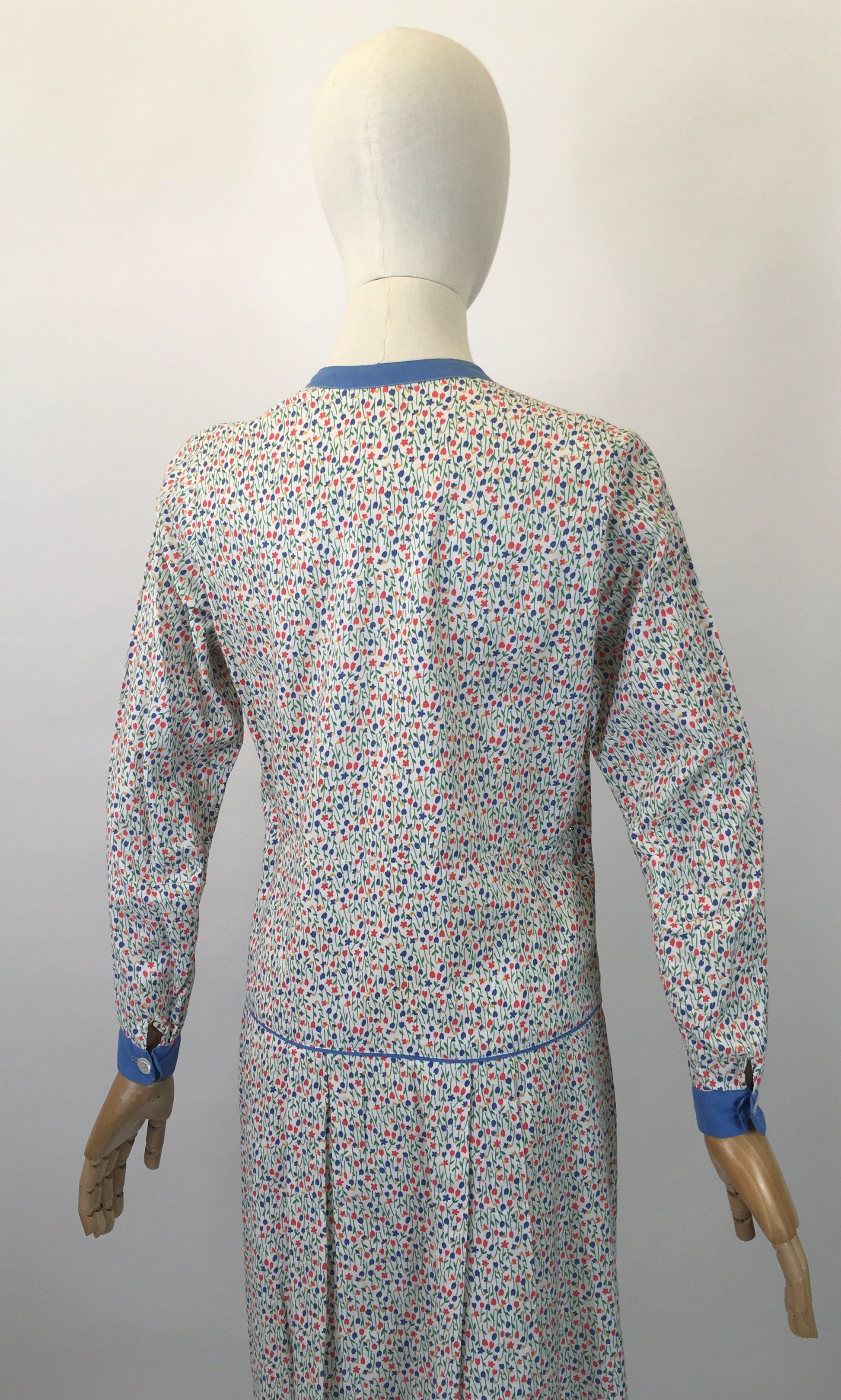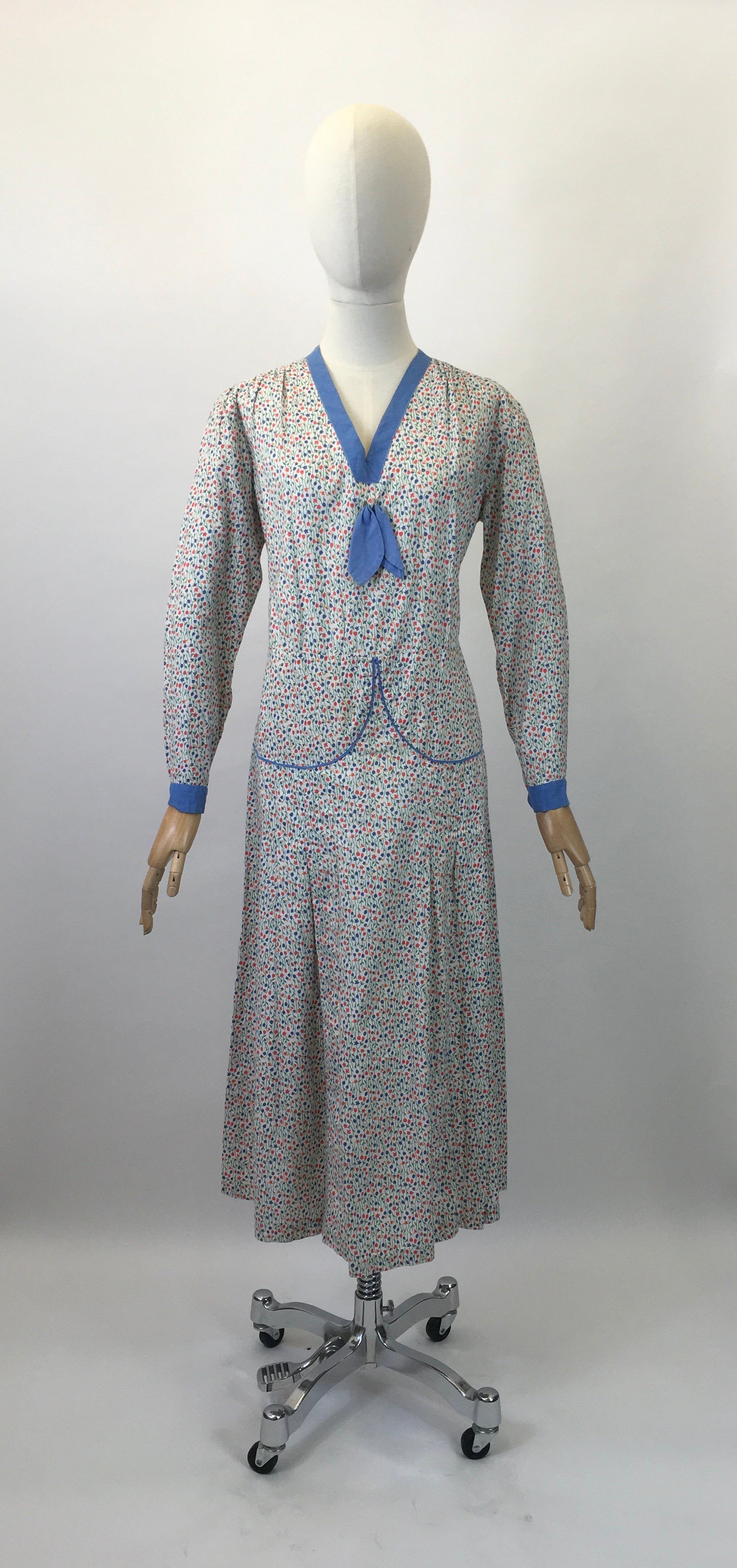 Vintage 1930’s darling floral day dress in a meadow print with greens, blues, yellows and oranges.  A piece with the most exquisite deco detailing this dress showcases the classic detailing of the early 1930’s era. It features a v neckline with contrast panelling and tie, dropped waist with contrast piping details, dropped pleats to the skirt and full length sleeve with contrast cuff with button fastening. The dress is a great spring / summer piece for everyday wear. The dress is made from a beautiful weight cotton in a meadow floral print in greens, blues, yellow and oranges which is a great pallet for accessorising the ensemble.