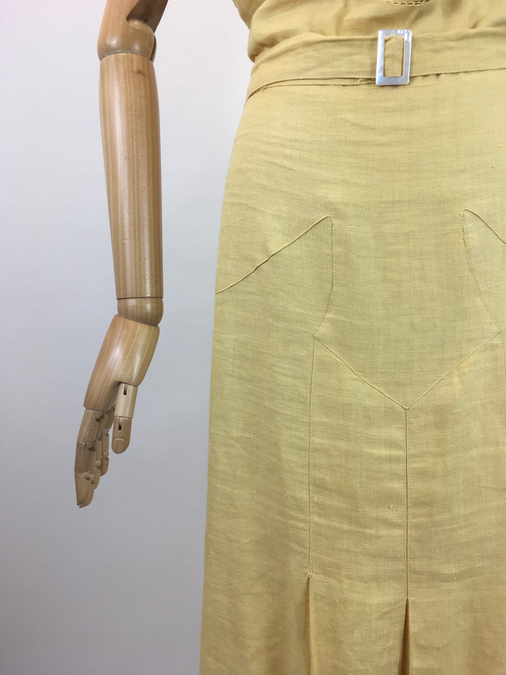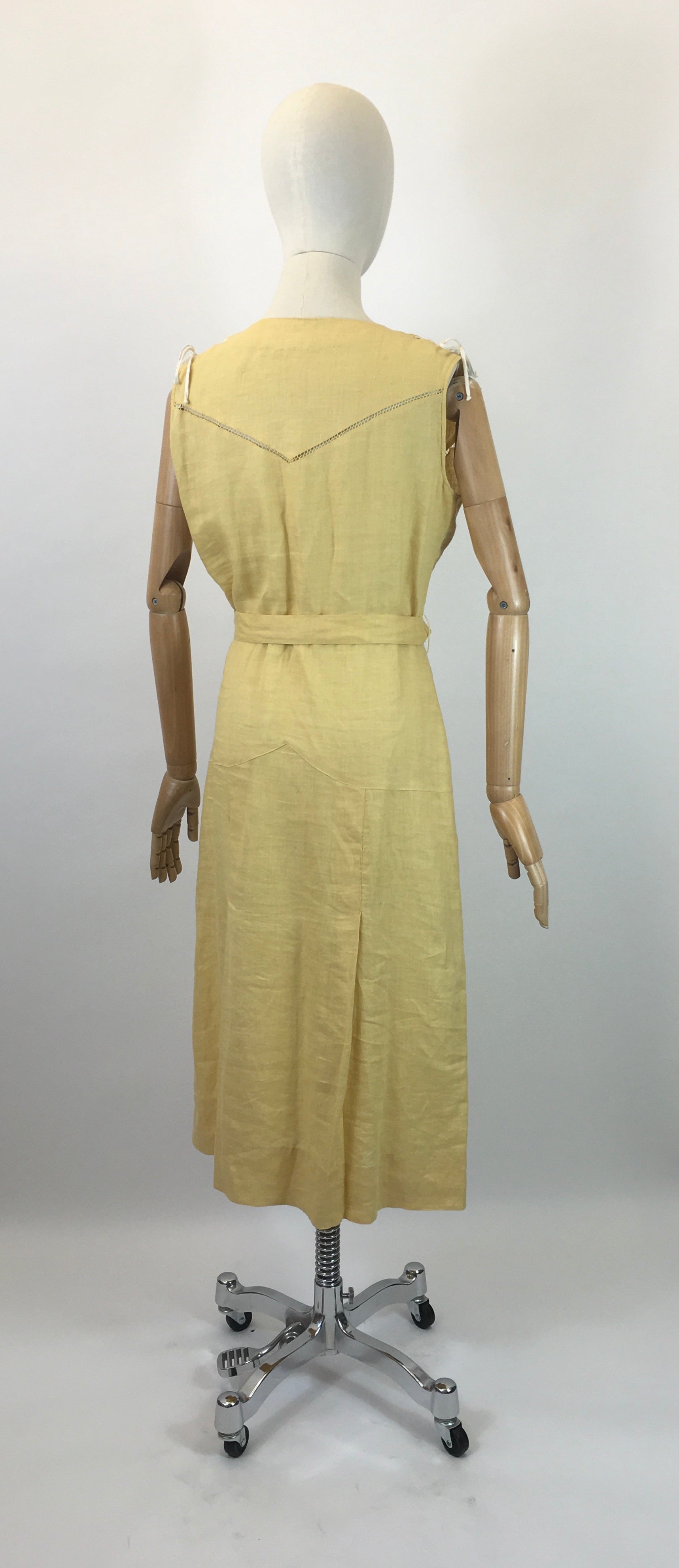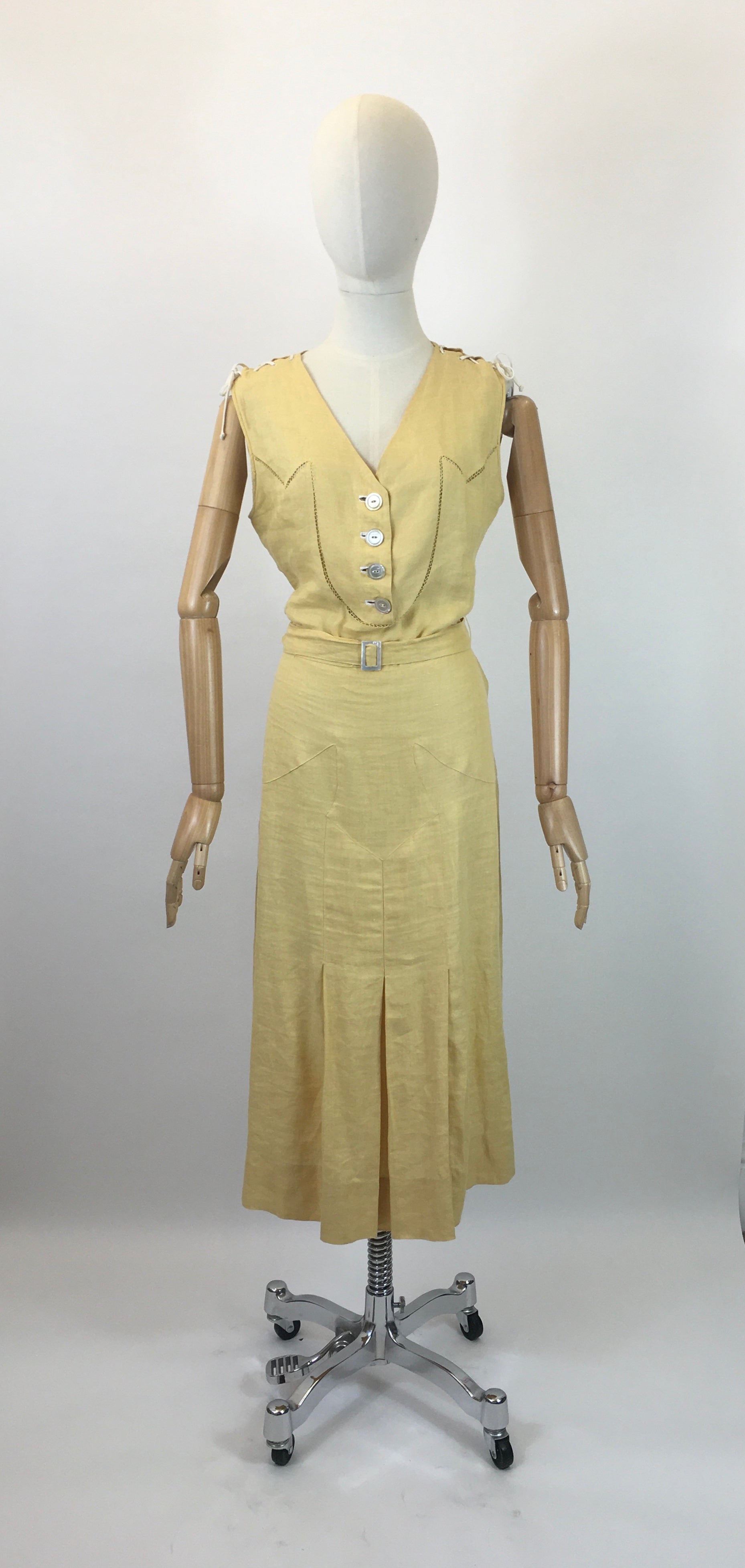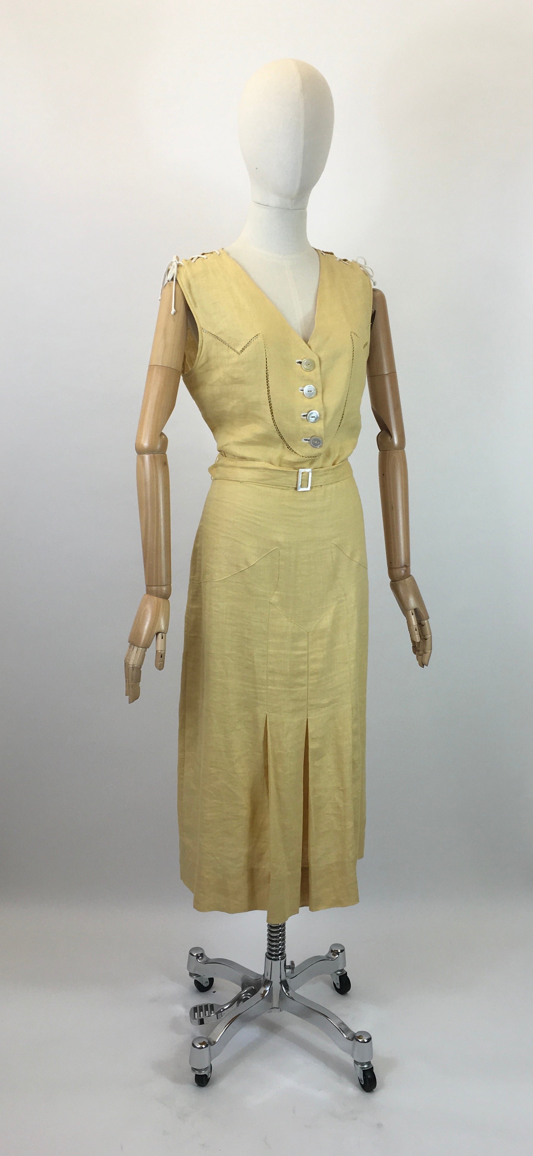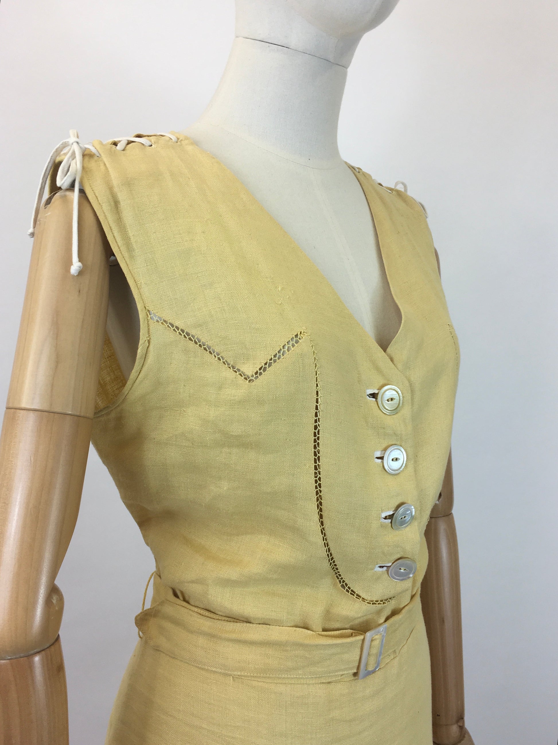 Vintage 1930’s sensational linen dress in sunshine yellow with lace details. This is an exquisite example from the era and showcases the best of those classic 1930’s deco simplistic details. The 1930’s era for fashion showcased the most stylised details in the most simplistic of elegance. This piece doesn’t fail to disappoint and oozes that deco yumminess. The dress features a sleeveless bodice with v neckline and button front to the waist with faggoting stitch work and amazing lace tie details to the shoulder seams. The dress is cut on the bias and has stitch work panelling with pleats to the skirt. The dress fastens with press studs to the side seam and a matching belt with deco buckle. The dress is best suited to smaller than the measurements and would suite a modern day Uk 12.