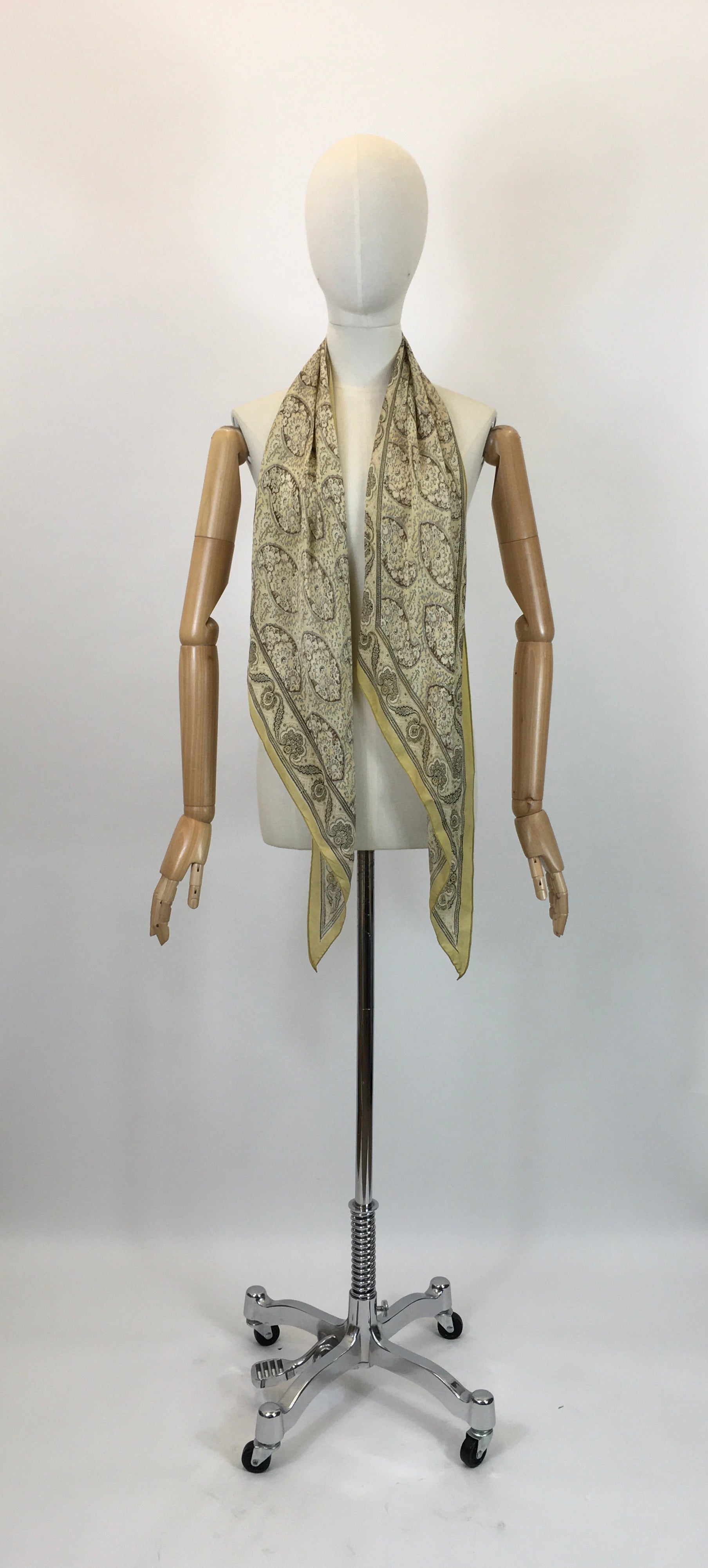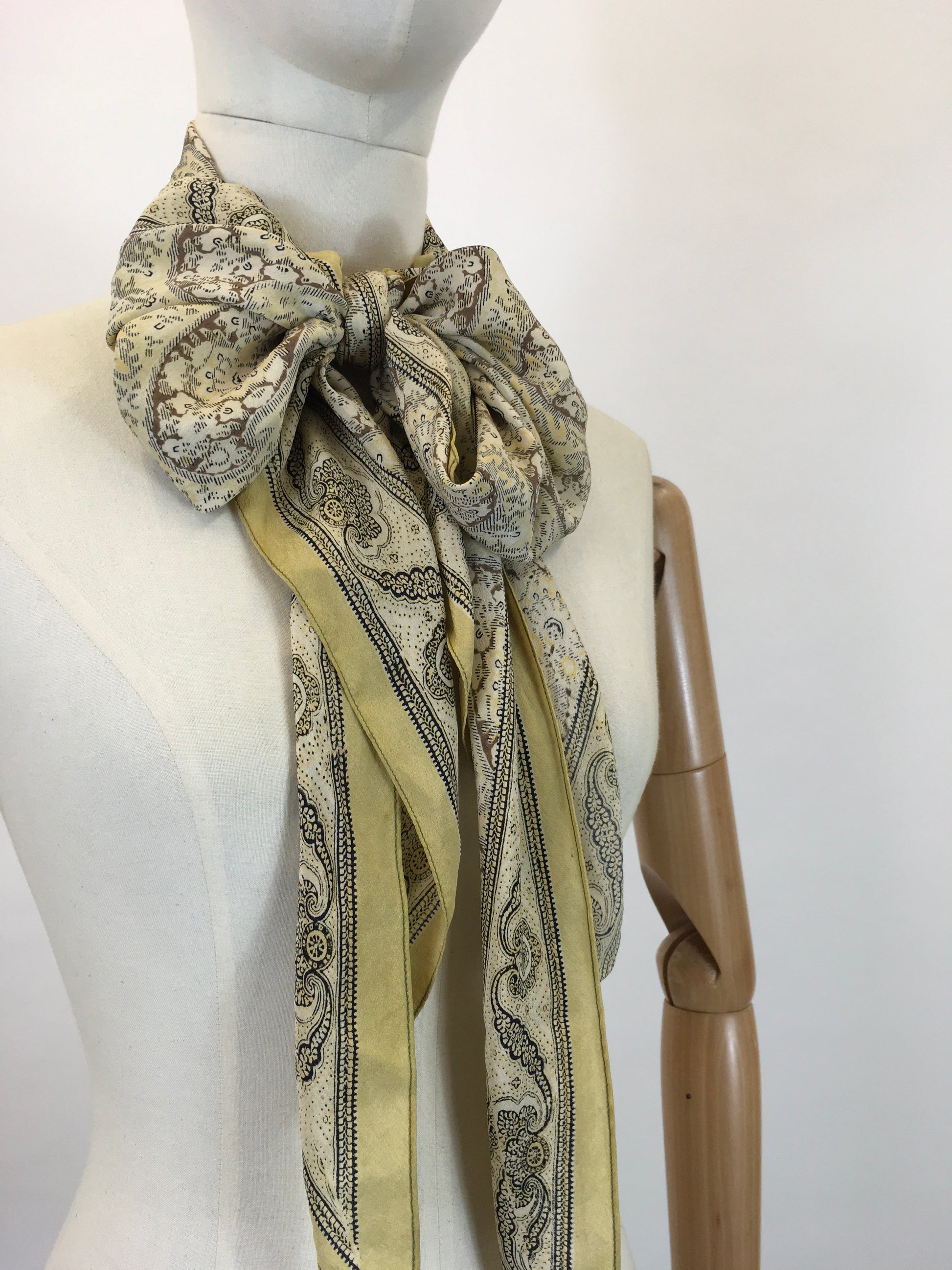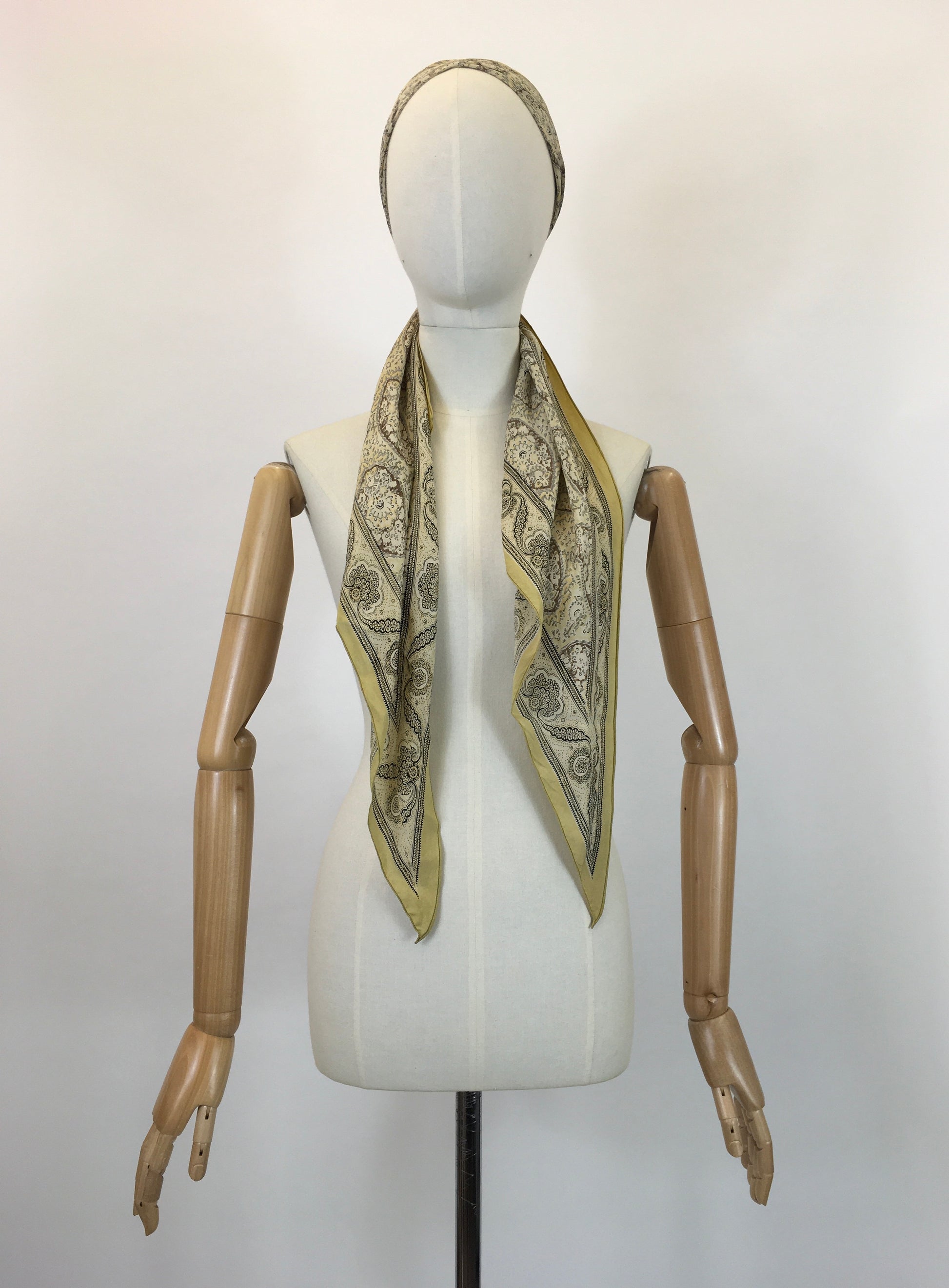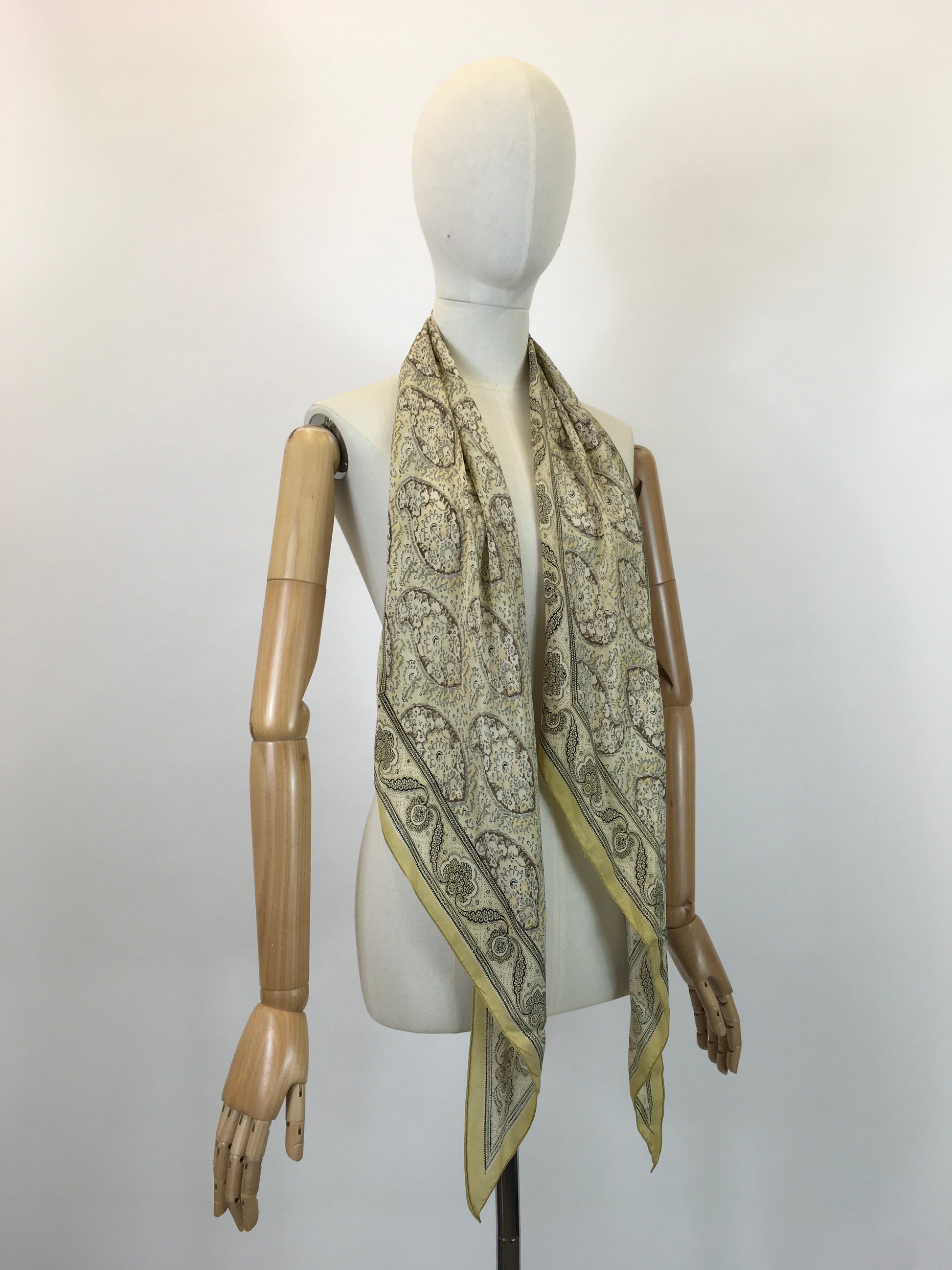 Original 30s darling deco pointed scarf in lemon, taupe, brown and black combination. Fabulous iconic deco lines and paisley shapes on this beauty.
