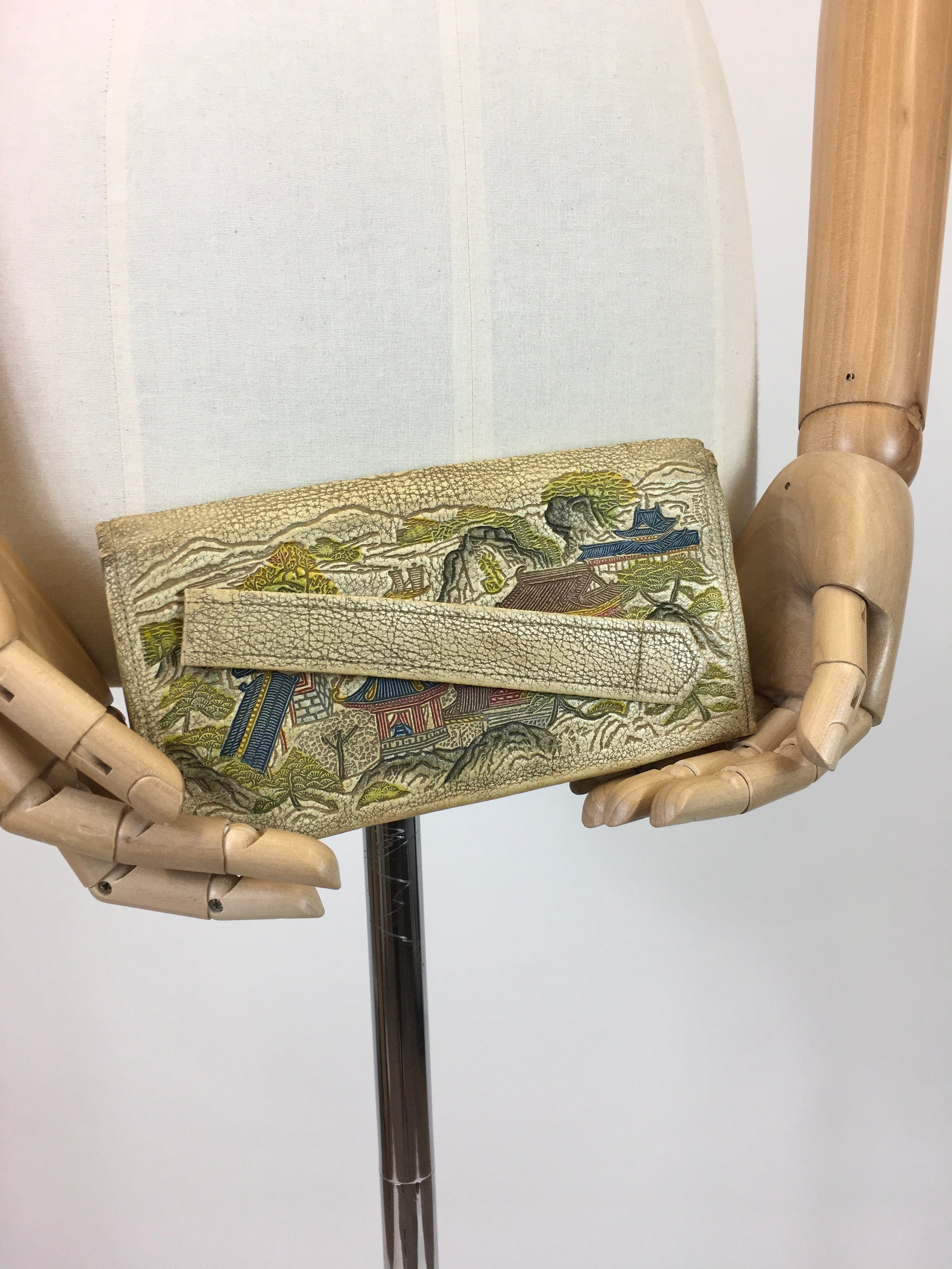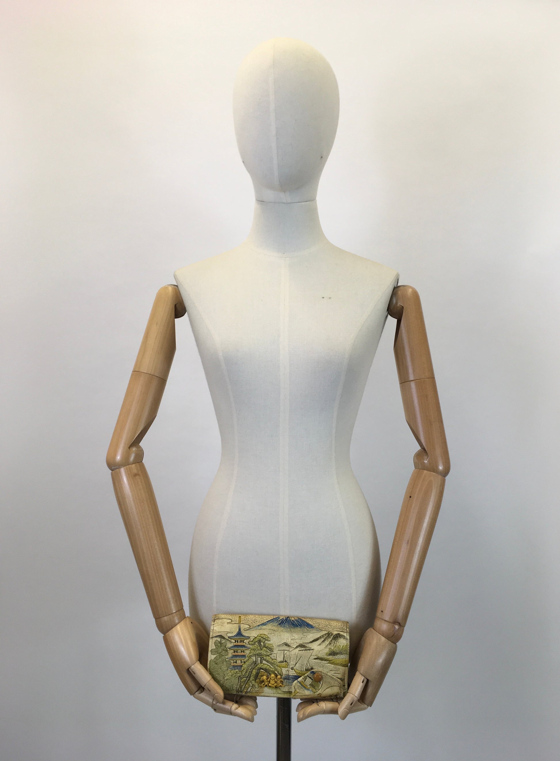 Vintage 1920’s / 1930’s exquisite tourist clutch handbag with celluloid monkey adornment. This is a beautiful example from the era and is a very special piece as it has so much detailing. Most tourist items were purchased by men serving the war which they would then send back to loved ones. This example features an interesting pocket to its exterior which we haven’t seen before, a celluloid 3 monkey adornment and beautifully carved drawings. To its interior it features a mirror with a zipped compartment.